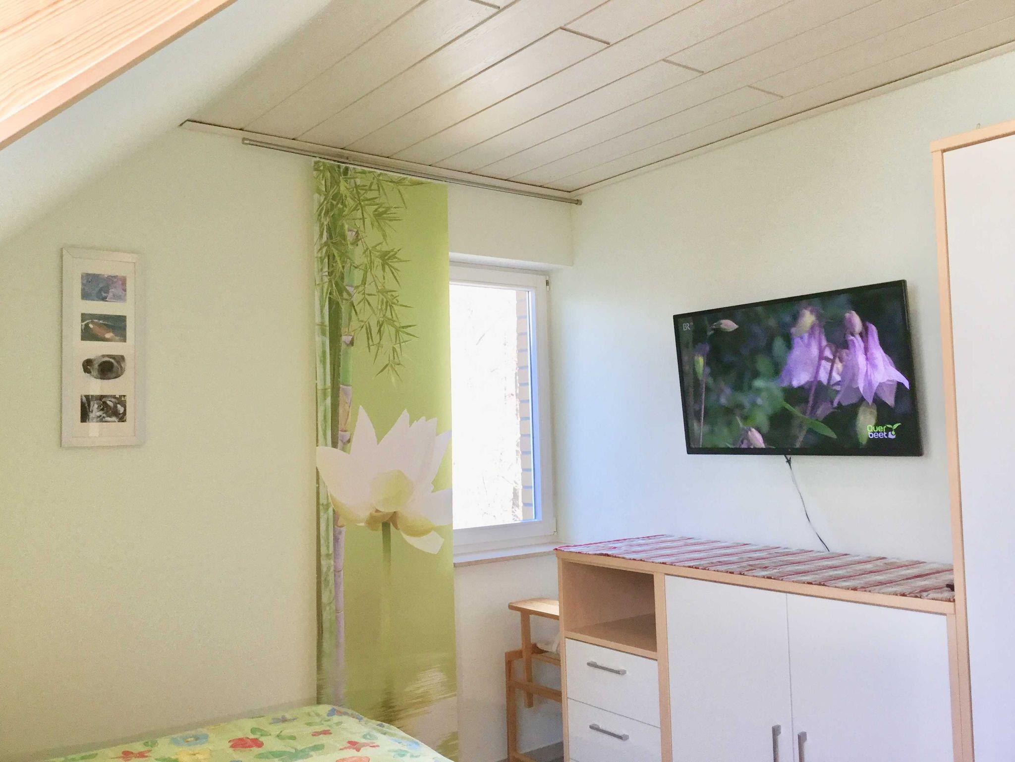 Die 2-Raum-Ferienwohnung (ca. 44 qm) befindet sich im Dachgeschoss. Sie hat ein separates Schlafzimmer, einen offenen Wohn- und Küchenbereich und Dusche/WC. Zur Ausstattung gehören LED-Flachbildschirm mit Radio und kostenfreiem WLAN. Im Schlafzimmer steht ein Doppelbett und ein Babybett kann hinzugestellt werden. Im Wohnbereich ist eine Aufbettung (Doppelbettcouch) für 2 Personen möglich.