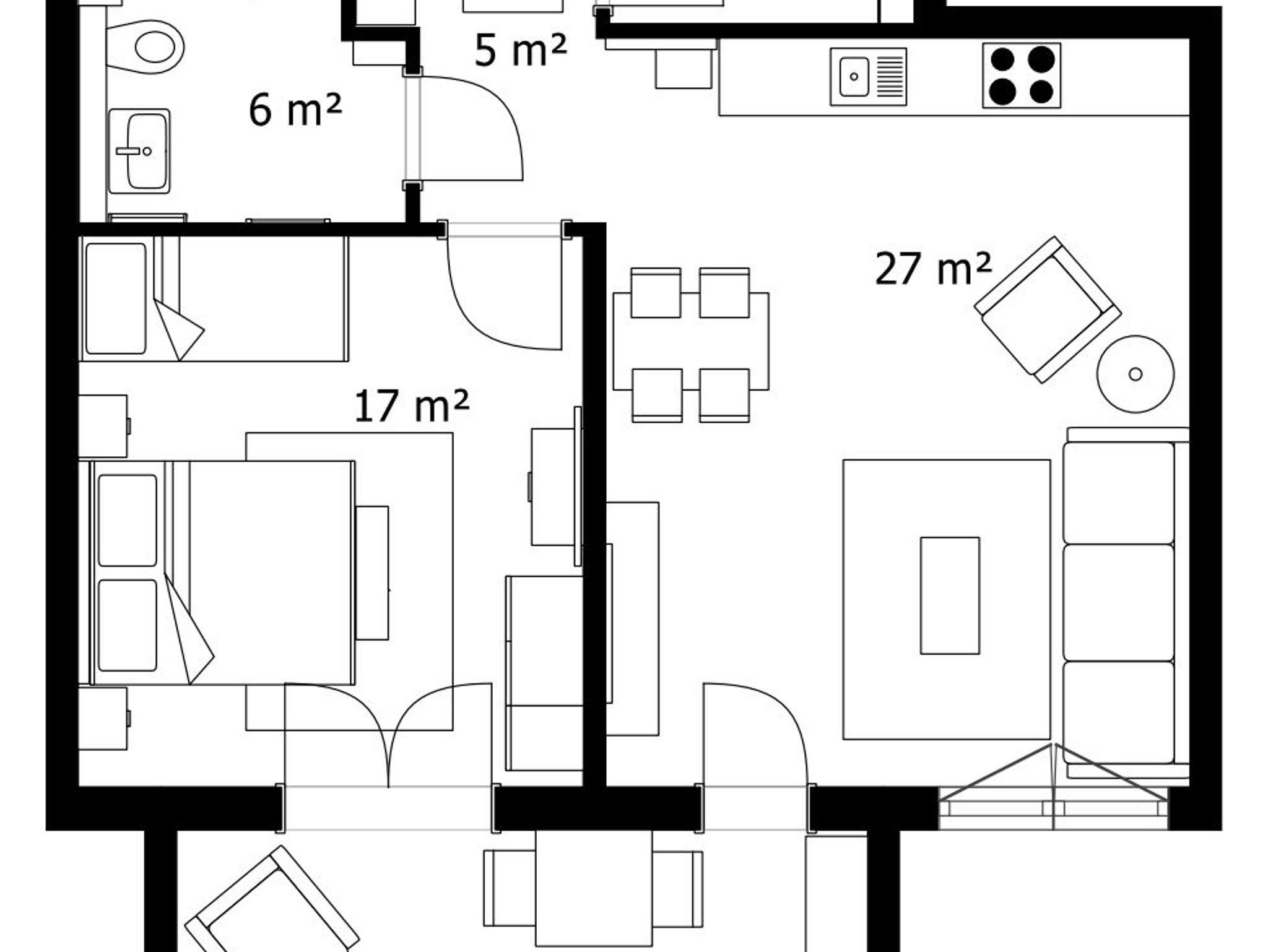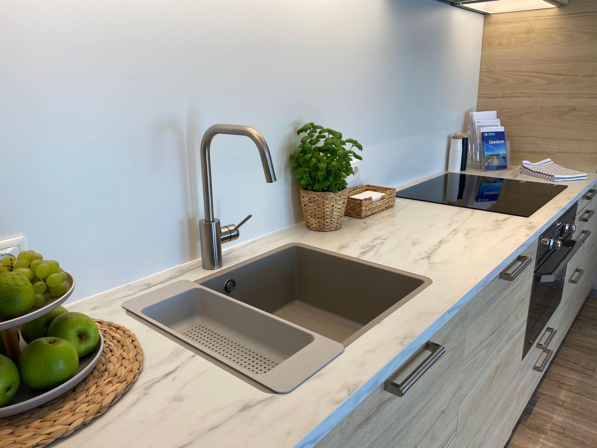 Die offene Küche bietet Ihnen sämtlichen Freiraum für Ihre Bedürfnisse und stellt Ihnen ein Kühlschrank mit Gefrierfach, eine Backofen-Mikrowellen-Kombi, einen Geschirrspüler, Induktionskochfeld, Kaffeemaschine, Toaster, Wasserkocher, Pürierstab und Eierkocher zur Verfügung.