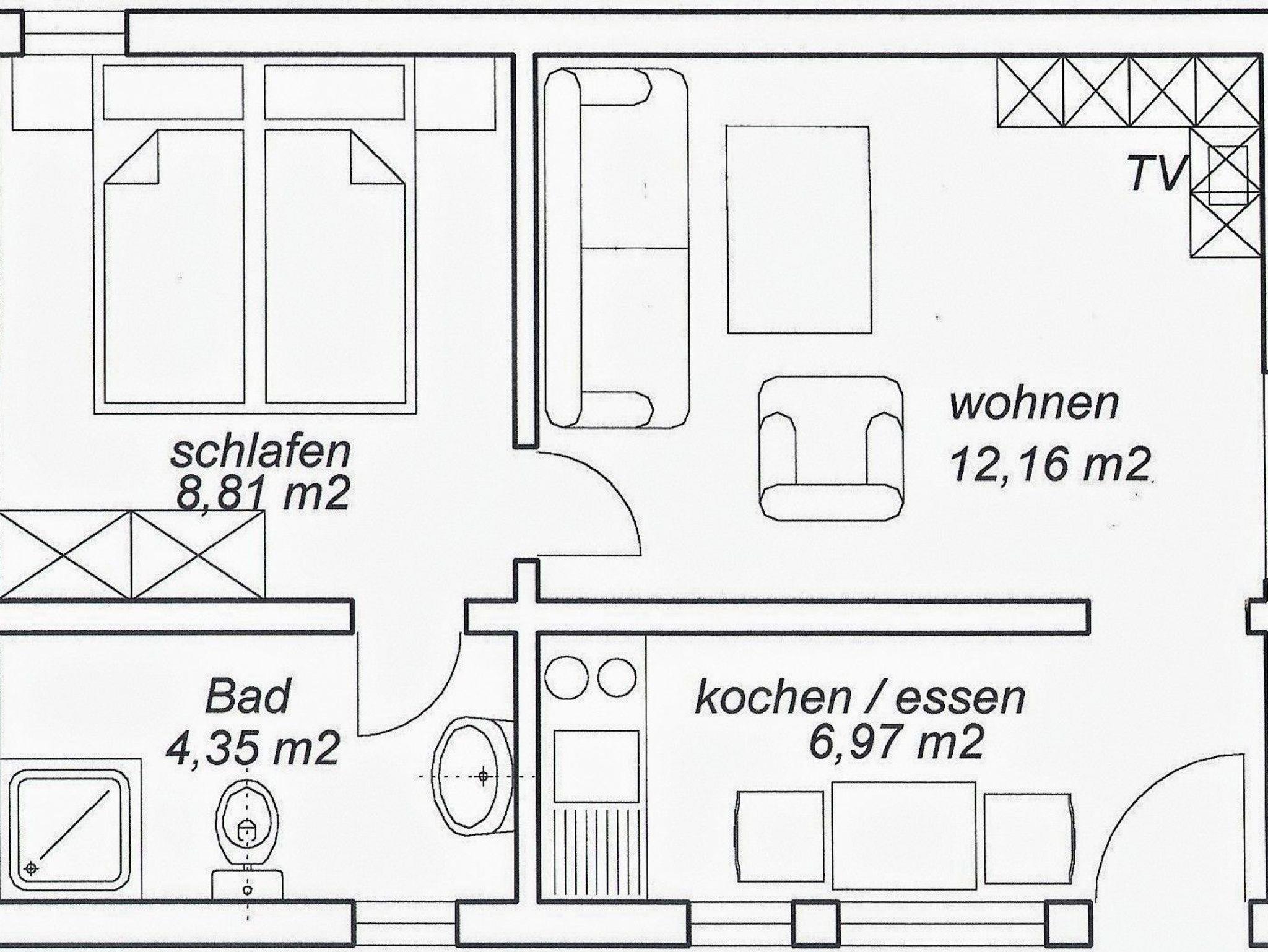 Der Bungalow ist 33qm groß und mit einem Wohnraum, Schlafzimmer, Küche und Bad ausgestattet.