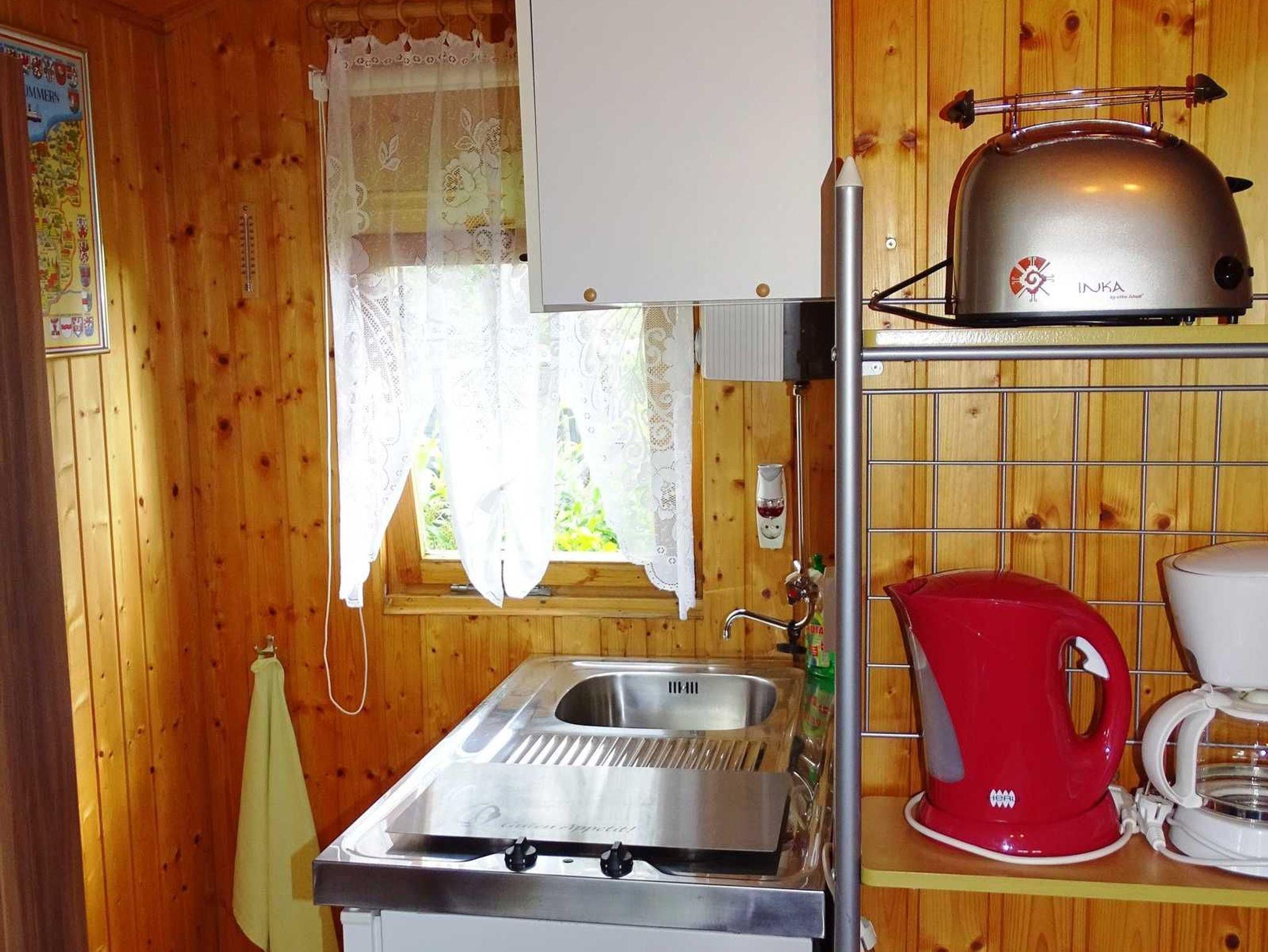 Das Ferienhäuschen (ca. 12 m²) befindet sich auf dem Grundstück des Vermieters in ruhiger Lage zwischen Achterwasser und Ostsee im Ortsteil Kölpinsee.