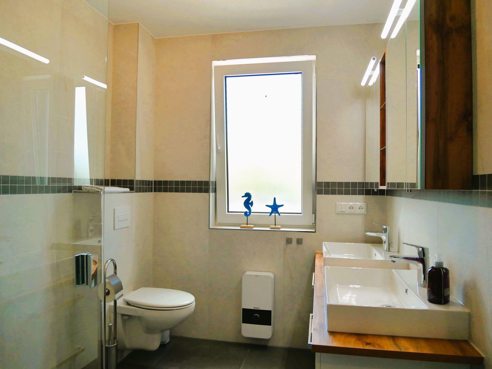 Das helle Tageslichtbad ist mit zwei Waschbecken, einem WC sowie einer ebenerdigen Dusche ausgestattet und verfügt über ein Fenster zur natürlichen Belüftung. Im Obergeschoss befindet sich ein zusätzliches WC.