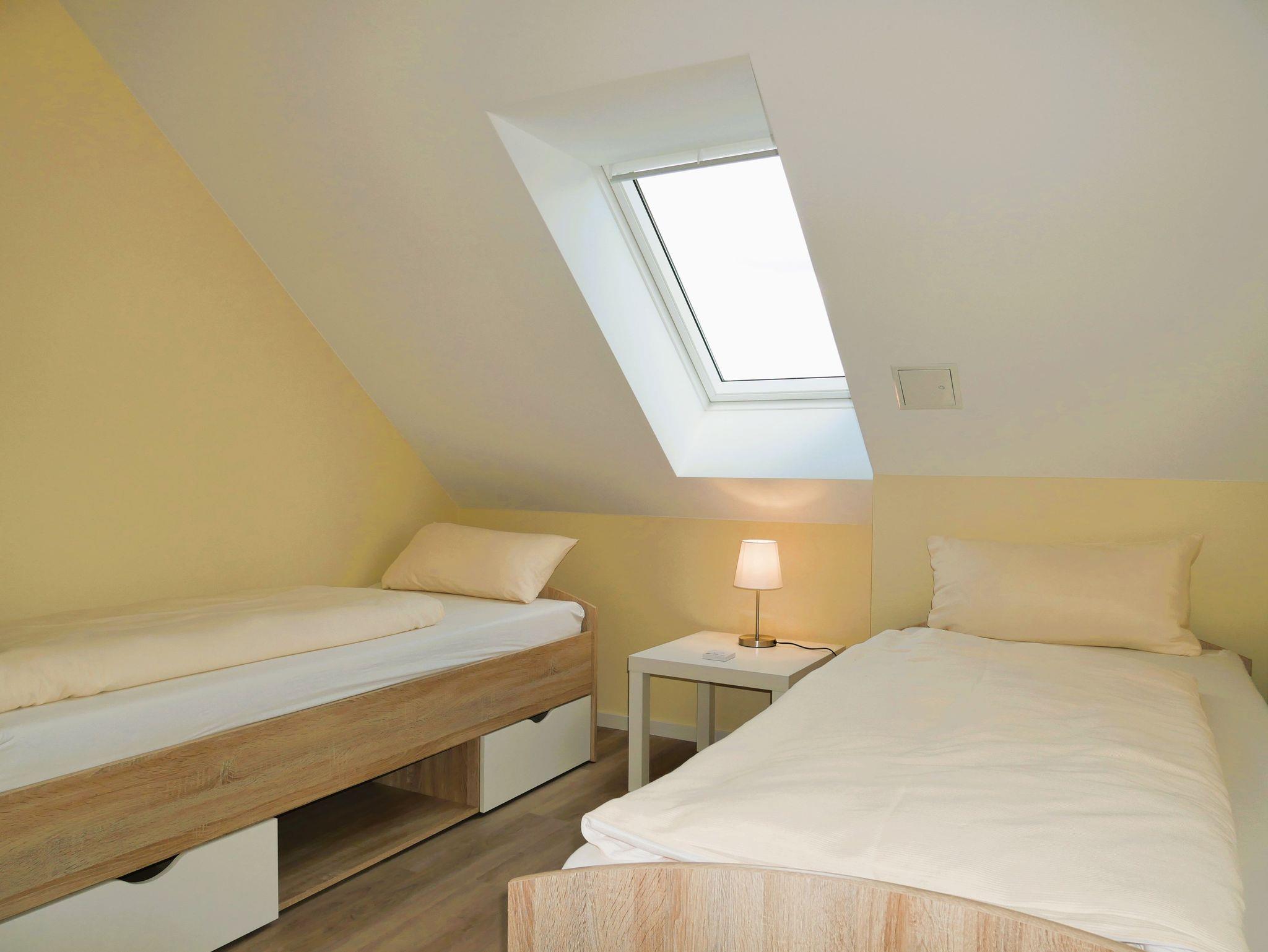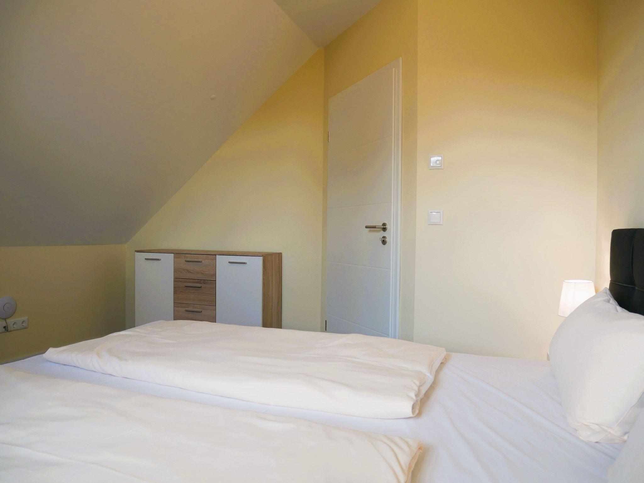 Über eine Treppe mit 15 Stufen gelangen Sie in das Obergeschoss, wo drei separate Schlafzimmer auf Sie warten: Zwei der Schlafzimmer sind mit einem gemütlichen Doppelbett und einem geräumigen Kleiderschrank eingerichtet, das dritte verfügt über zwei Einzelbetten und ebenfalls einen Kleiderschrank. In beiden Schlafräumen sorgen Verdunklungsmöglichkeiten und Insektenschutz an den Fenstern für angenehme Ruhe und erholsamen Schlaf.