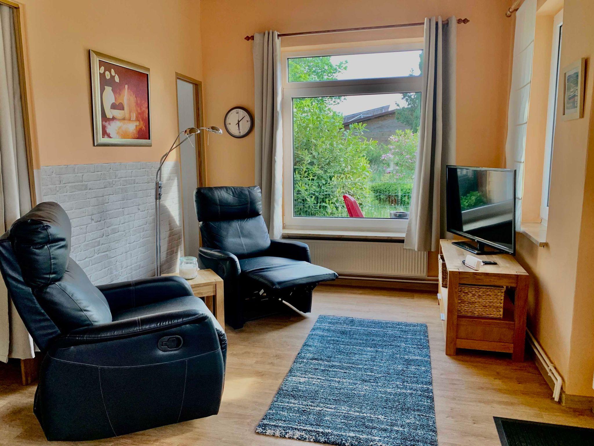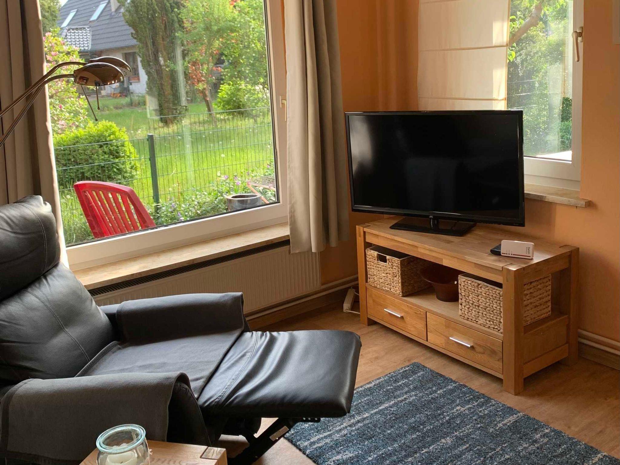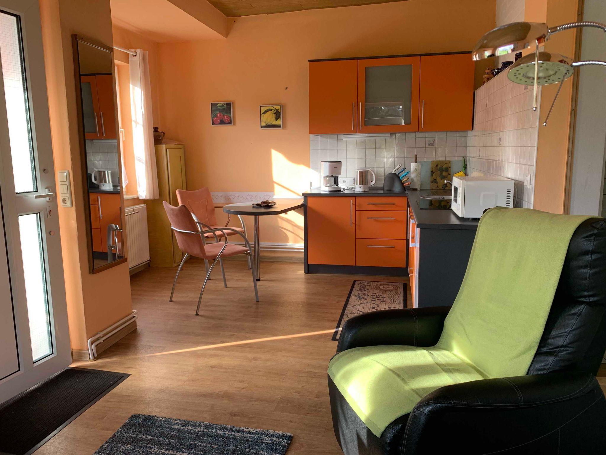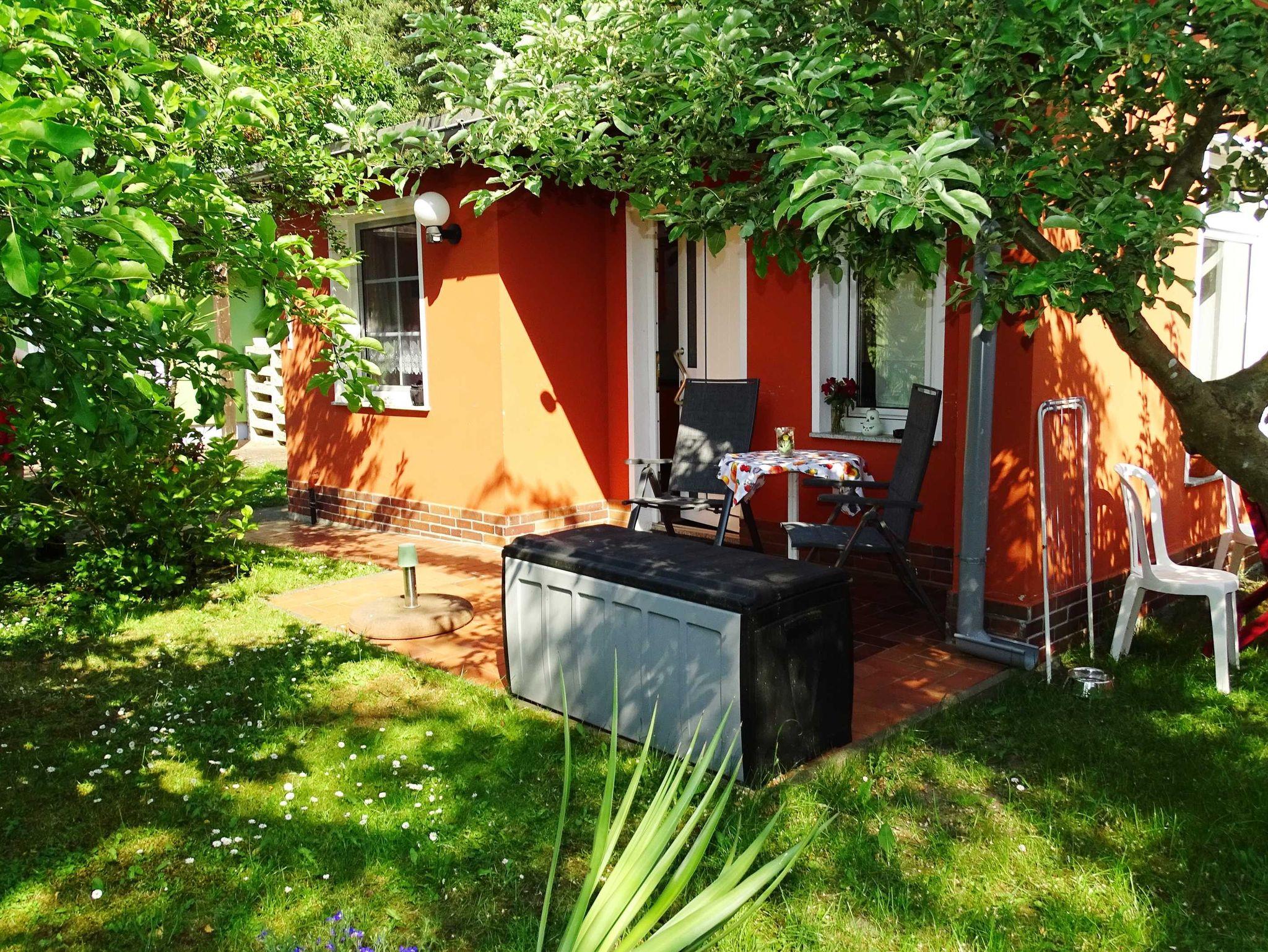 Der Wohnraum ist ausgestattet mit zwei Relaxsesseln und einem Sideboard, einem Flachbild-Fernseher und einem Radio. Die offene Küche verfügt über ein Cerankochfeld, eine Mikrowelle, eine komplette Ausstattung mit Kaffeemaschine, Wasserkocher und Toaster und eine gemütliche Sitzgruppe. Der Schlafraum ist teilweise offen zum Wohnraum und ist mit einem Doppelbett (1,70 x 1,90) mit verstellbaren Lattenrosten, einem Schrank und zwei Nachtschränken gut geeignet für zwei Personen. In Bad finden Sie Dusche und WC. Auf der sonnigen Terrasse mit Sitzmöbeln, sowie Liegen und Sonnenschirm auf dem liebevoll gestalteten Gartengrundstück können Sie den Urlaub in vollen Zügen genießen.