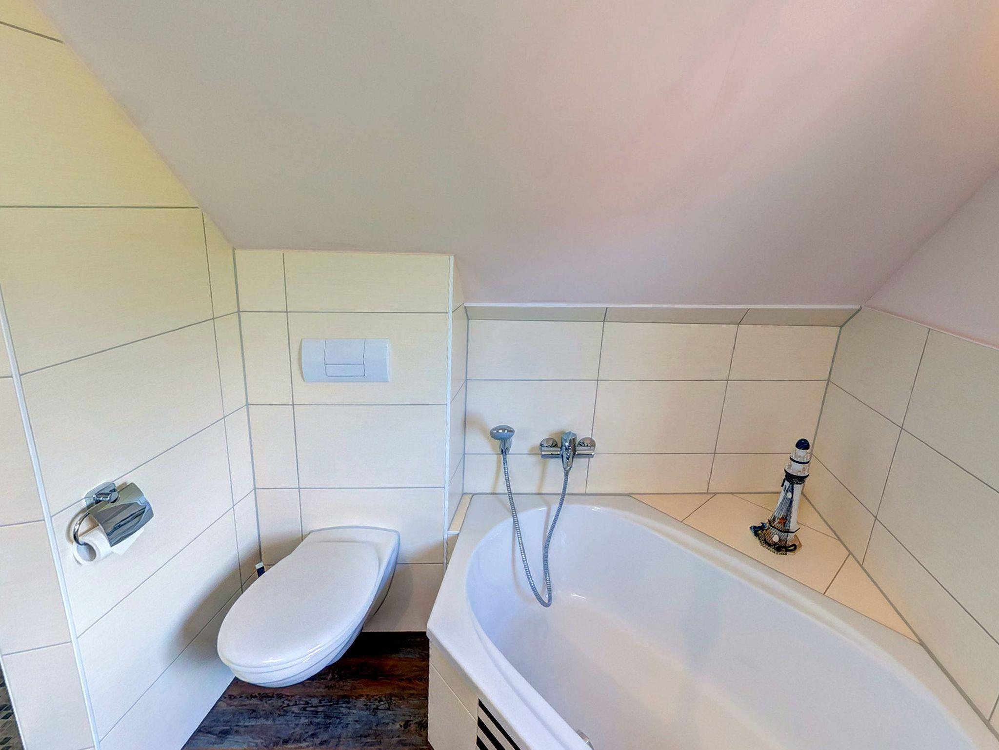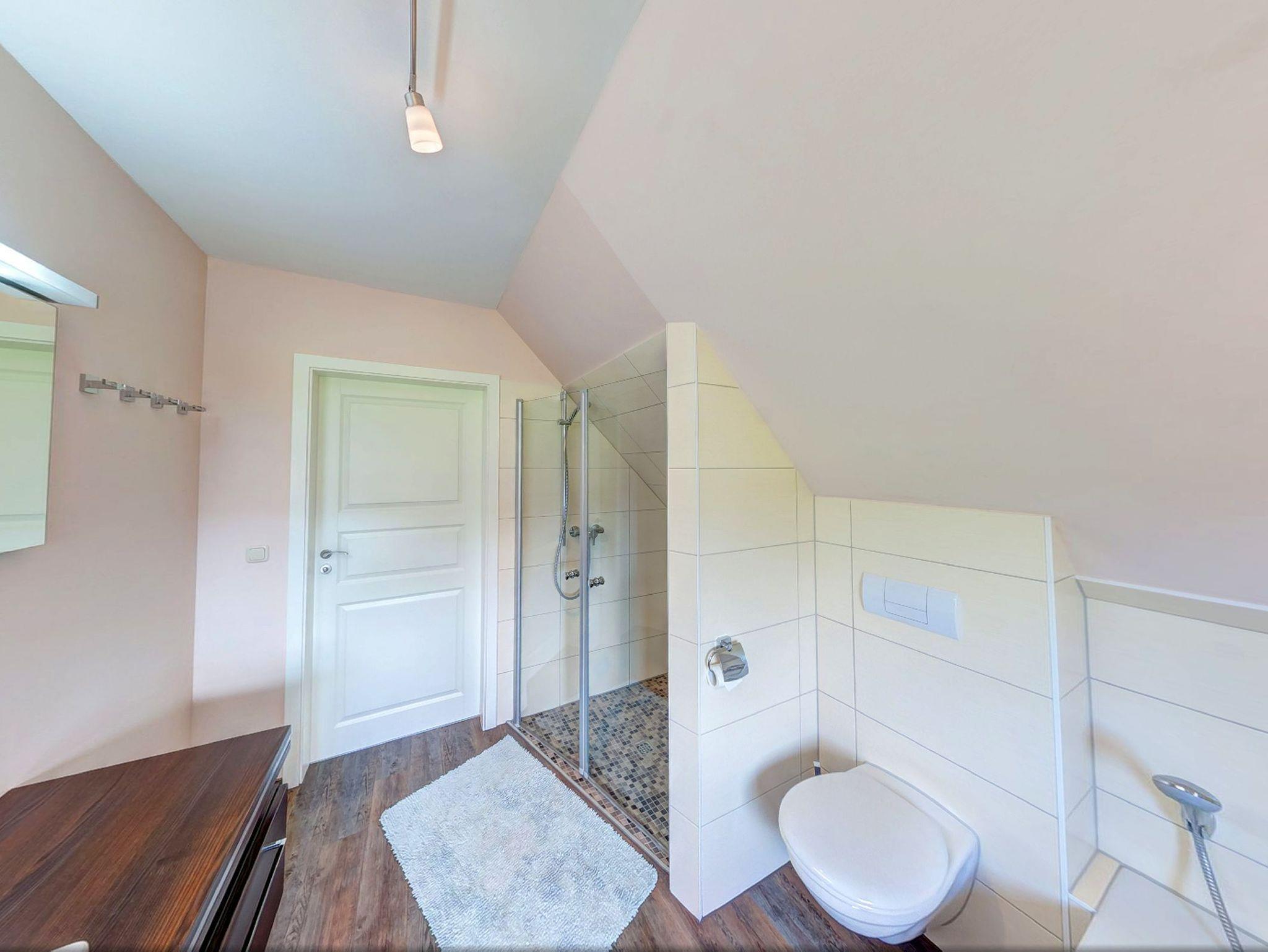 Ebenfalls im Erdgeschoss befindet sich ein Schlafzimmer mit einem komfortablen Doppelbett sowie ein behindertengerechtes Badezimmer mit Dusche und WC.
