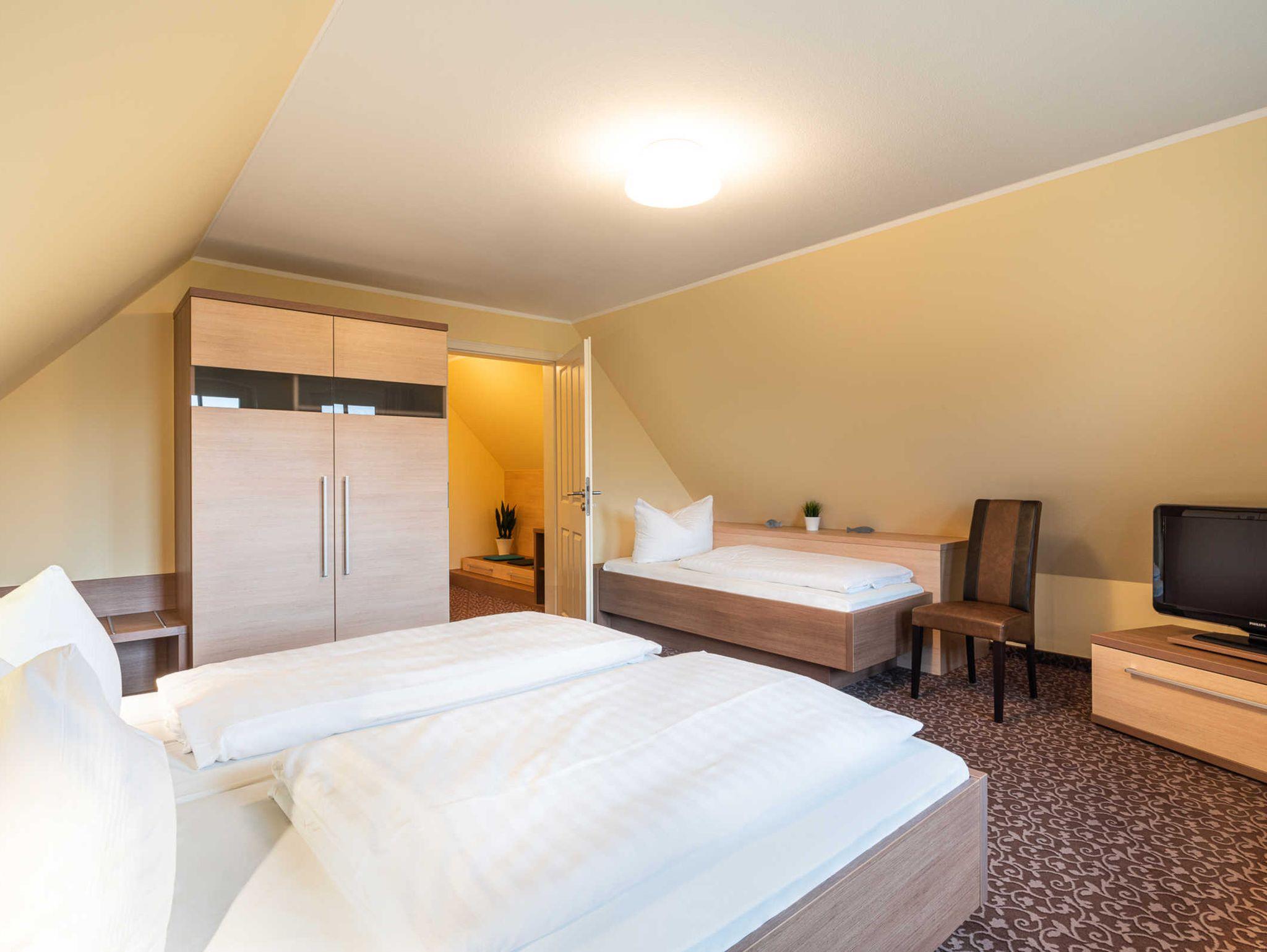 - ein Schlafzimmer mit einem Doppelbett und Zustellbett