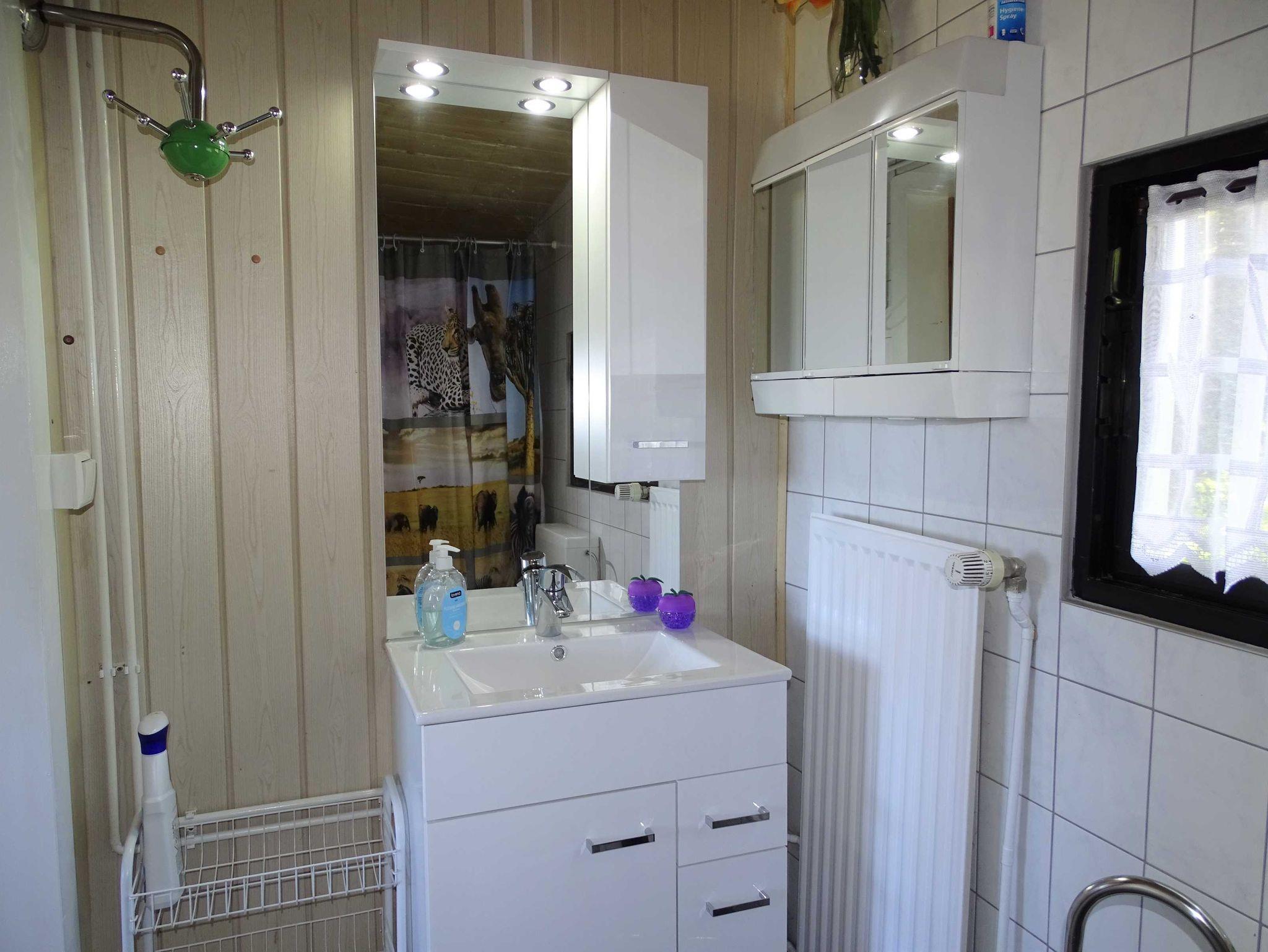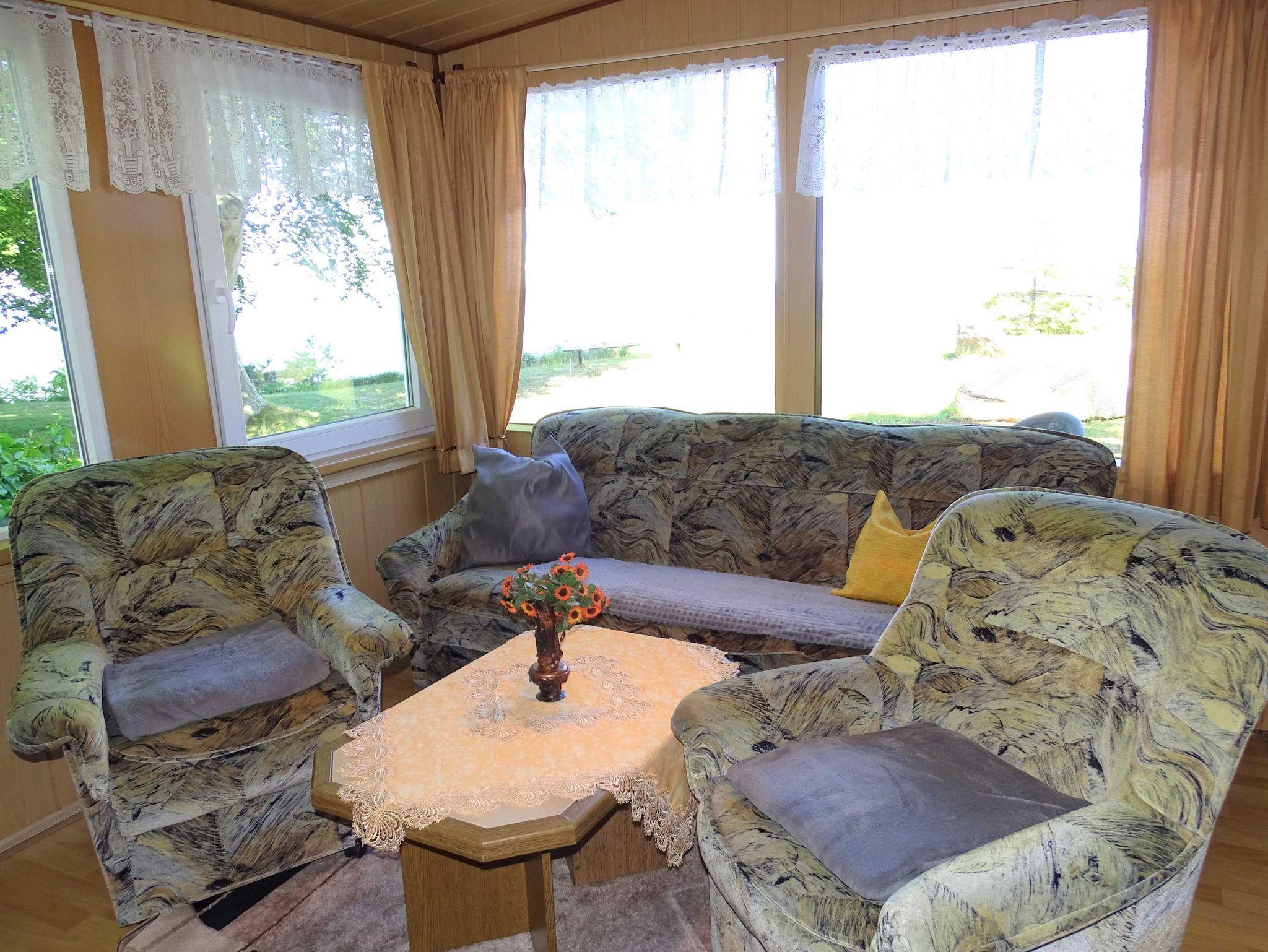In der Küche befindet sich eine Miniküche und eine Sitzgruppe. Von hier aus gelangen Sie in das Schlafzimmer mit Doppelbett oder ins Wohnzimmer mit Couch, Sesseln und Fernseher. Das Bad ist mit einer ebenerdigen Dusche und WC ausgestattet. Ein separates Zimmer mit Doppelbett, Couchecke, Waschgelegenheit und einem kleinen WC gehört zum Ferienhaus dazu.