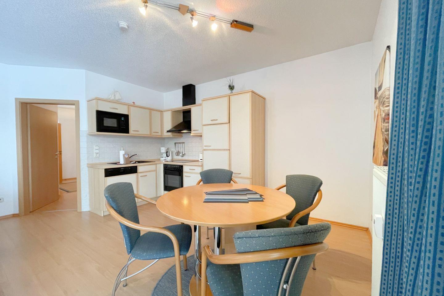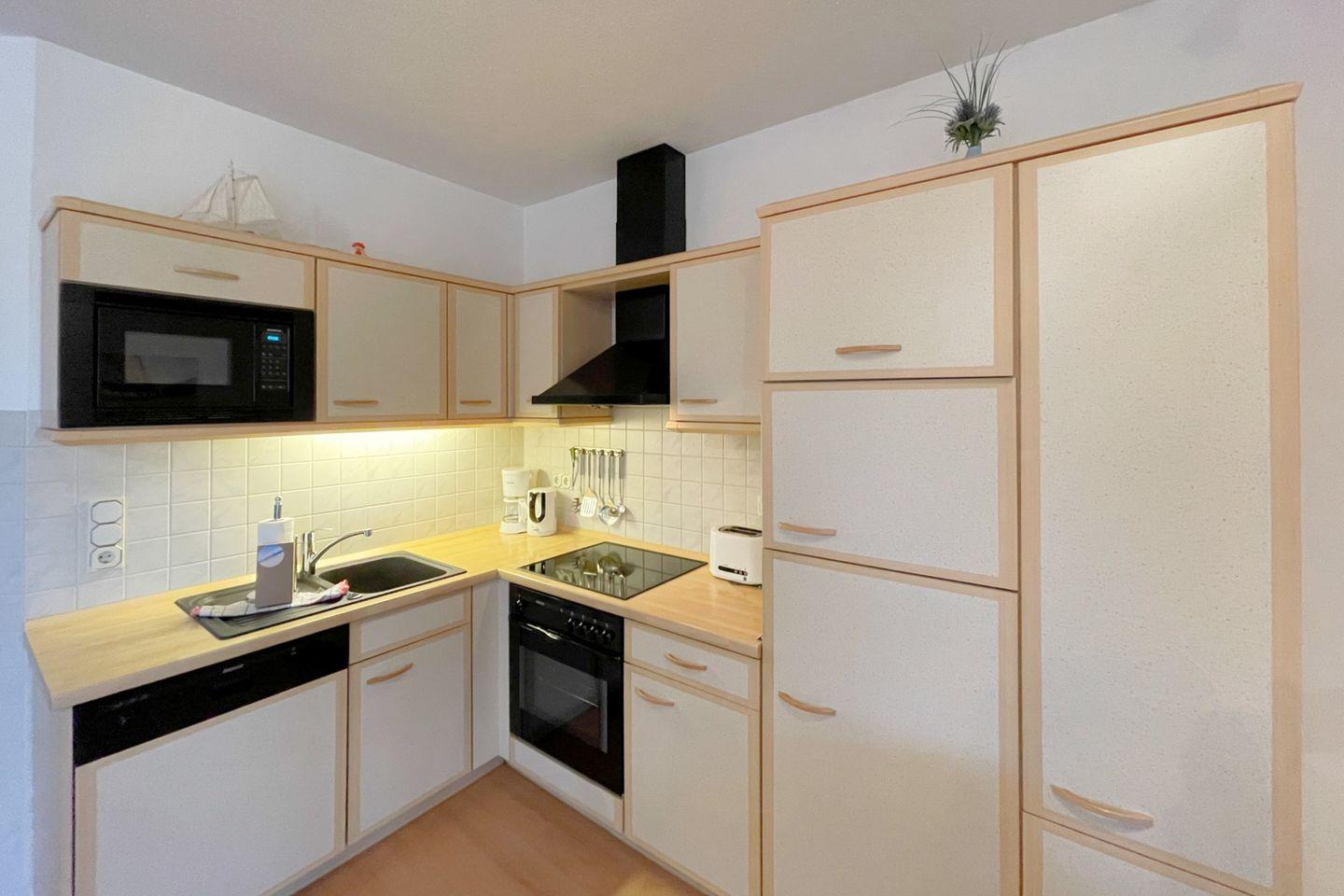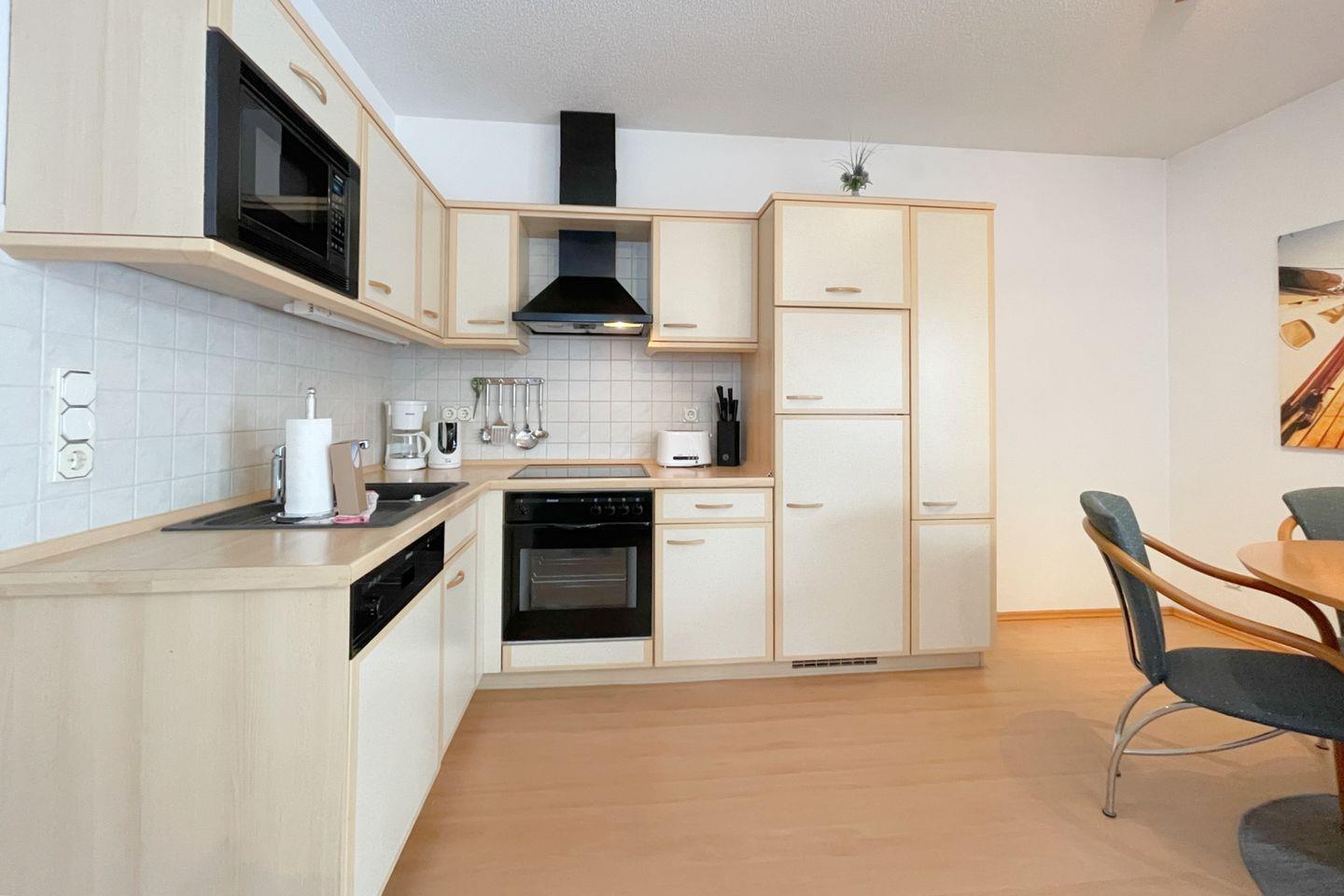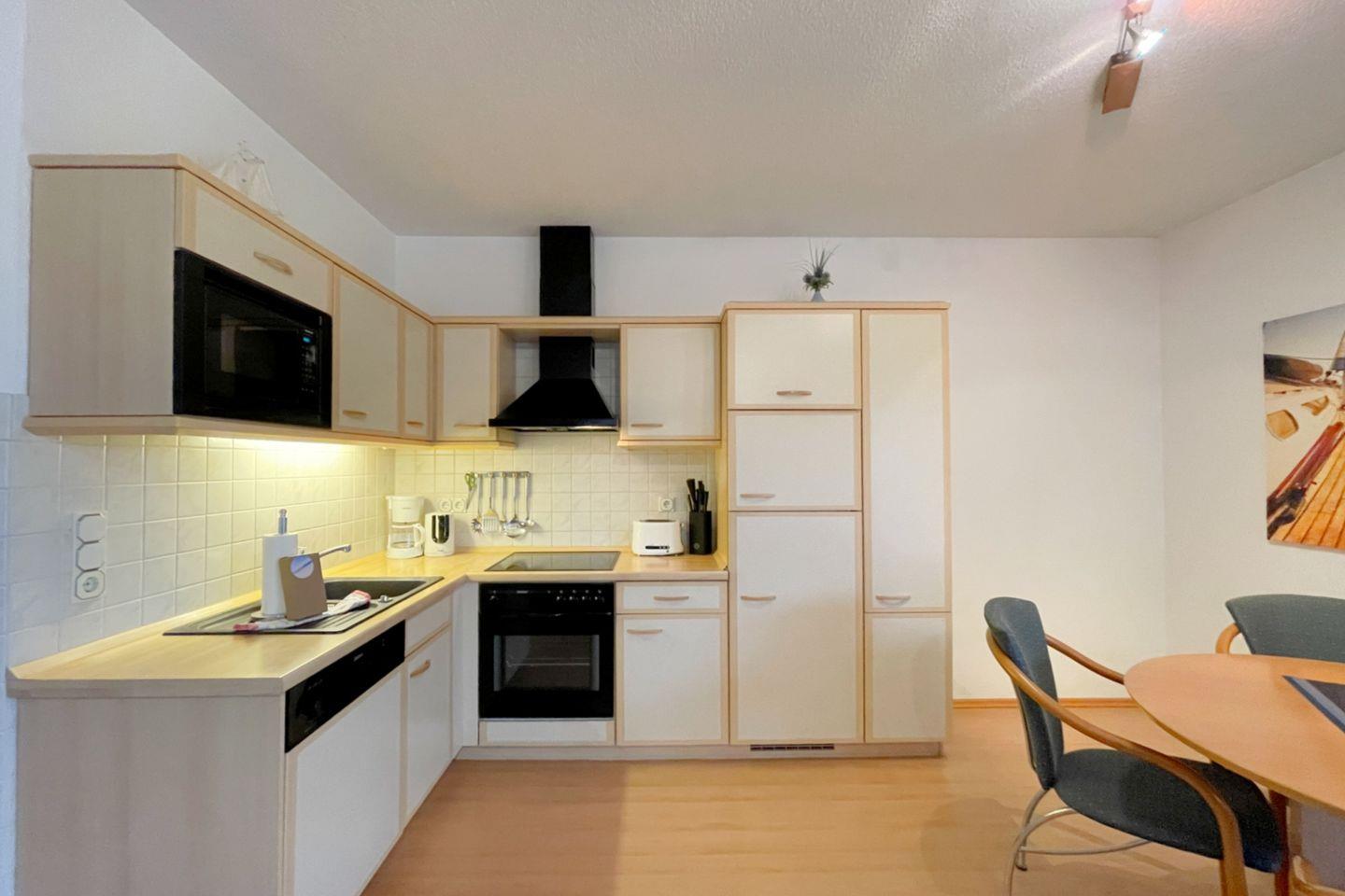 Die offene Küche öffnet sich zum Wohnzimmer und ist mit modernen Annehmlichkeiten wie einem Backofen, einer Mikrowelle, einem Cerankochfeld und einer Geschirrspülmaschine ausgestattet. So wird das Zubereiten von köstlichen Mahlzeiten zum Vergnügen. Für gesellige Essensmomente steht Ihnen ein gemütlicher Esstisch zur Verfügung. Das Wohnzimmer ist geschmackvoll eingerichtet und bietet eine Sofaecke, in der Sie entspannen und den Abend bei einem guten Film auf dem digitalen Fernseher ausklingen lassen können.