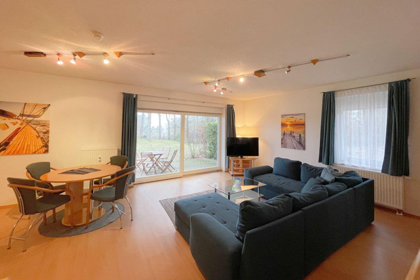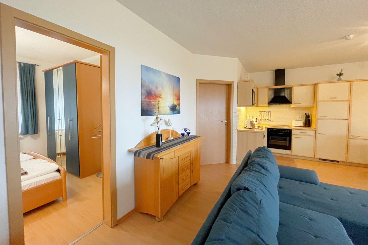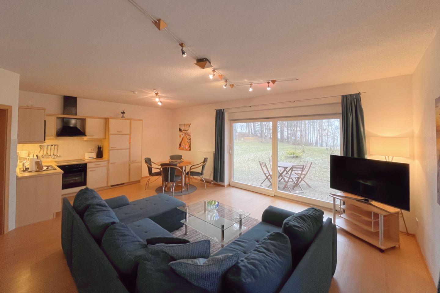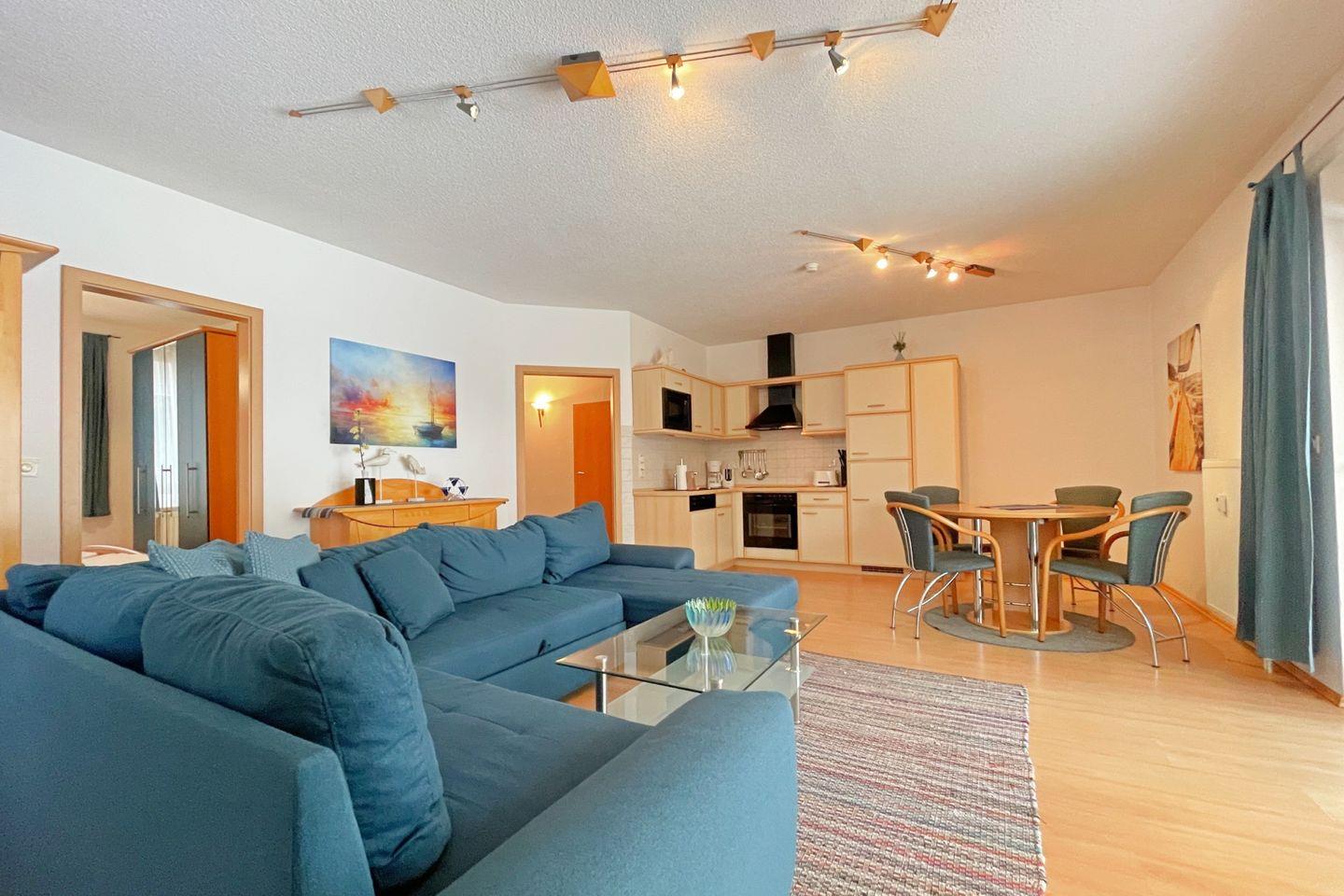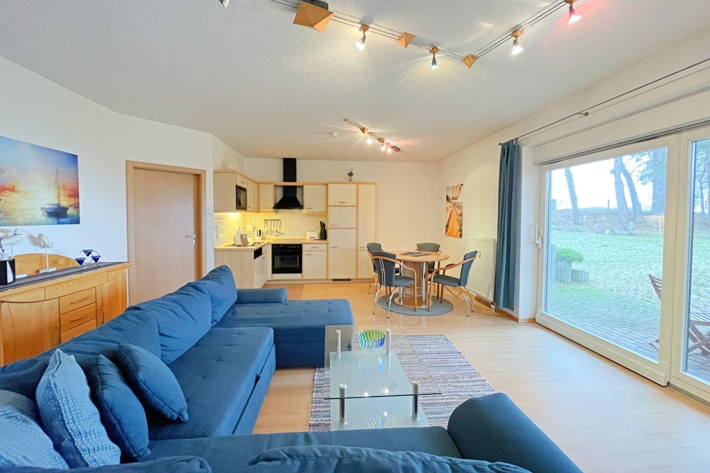 Die offene Küche öffnet sich zum Wohnzimmer und ist mit modernen Annehmlichkeiten wie einem Backofen, einer Mikrowelle, einem Cerankochfeld und einer Geschirrspülmaschine ausgestattet. So wird das Zubereiten von köstlichen Mahlzeiten zum Vergnügen. Für gesellige Essensmomente steht Ihnen ein gemütlicher Esstisch zur Verfügung. Das Wohnzimmer ist geschmackvoll eingerichtet und bietet eine Sofaecke, in der Sie entspannen und den Abend bei einem guten Film auf dem digitalen Fernseher ausklingen lassen können.