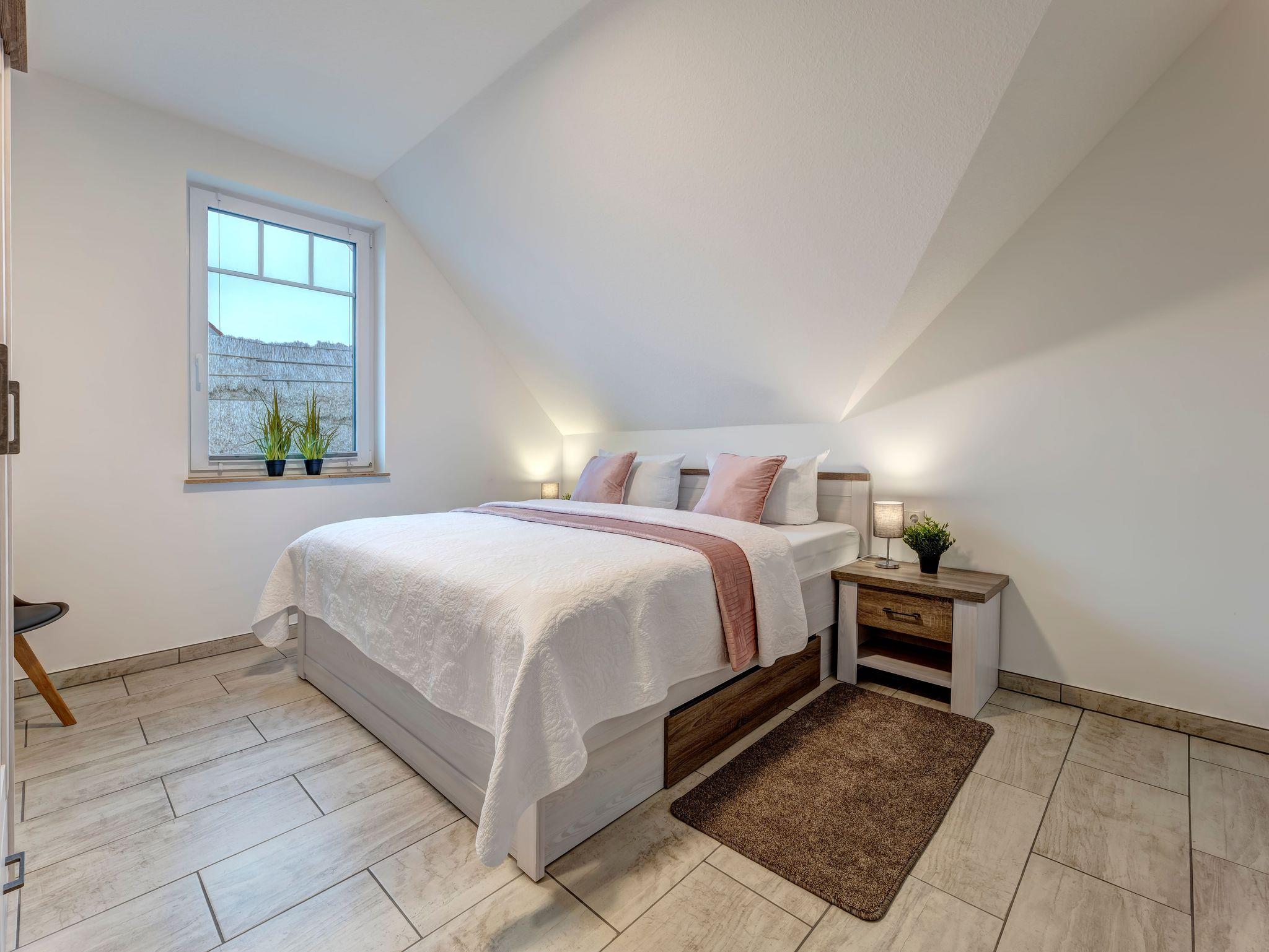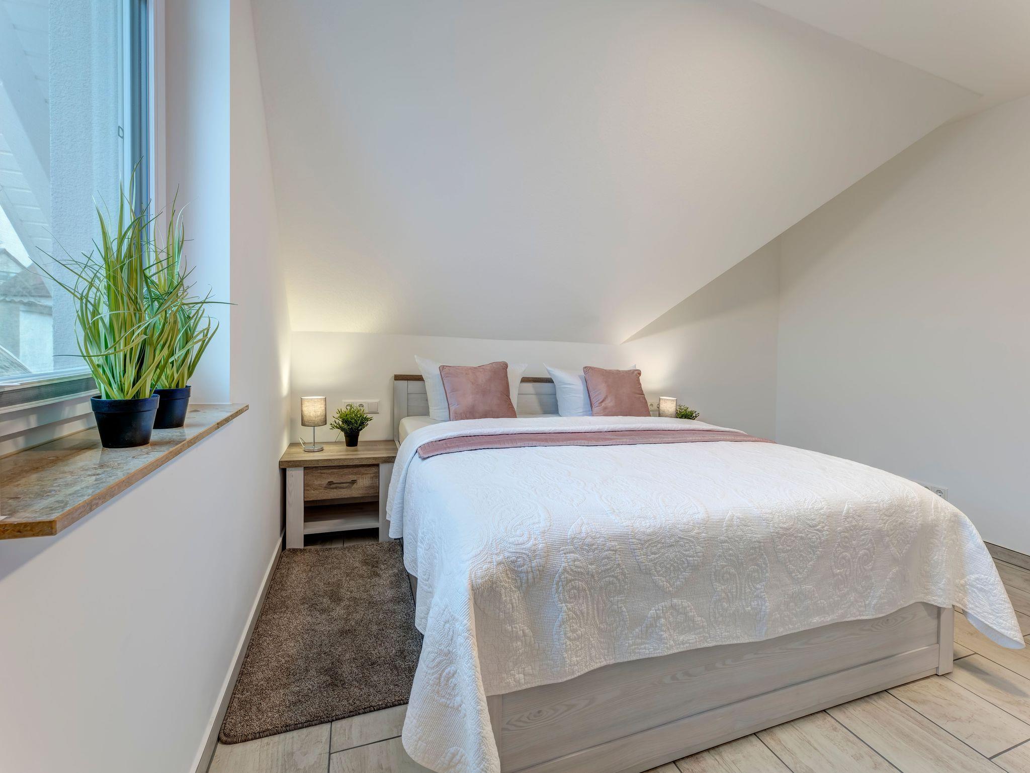 Die Ferienwohnung 4 im Obergeschoss verfügt über einen großzügigen Balkon mit Süd-West-Ausrichtung. Das moderne Wohnzimmer ist mit einem 50-Zoll-Flachbildfernseher und einer gemütlichen Couch ausgestattet. Die offene Küche grenzt direkt an und lädt zum Kochen ein. Sie ist vollständig mit allen notwendigen Utensilien (Backofen, 4er Cerankochfeld, Spülmaschine, etc.) ausgestattet.