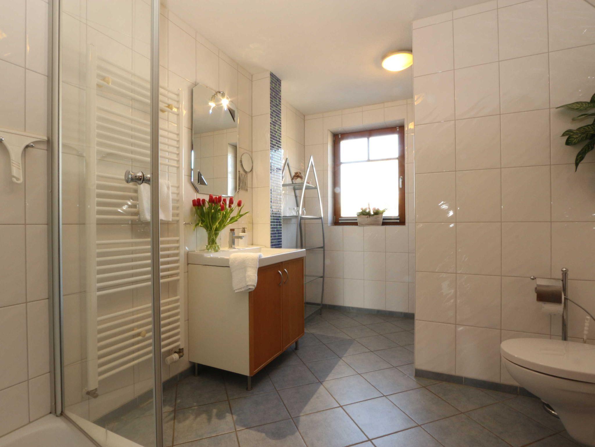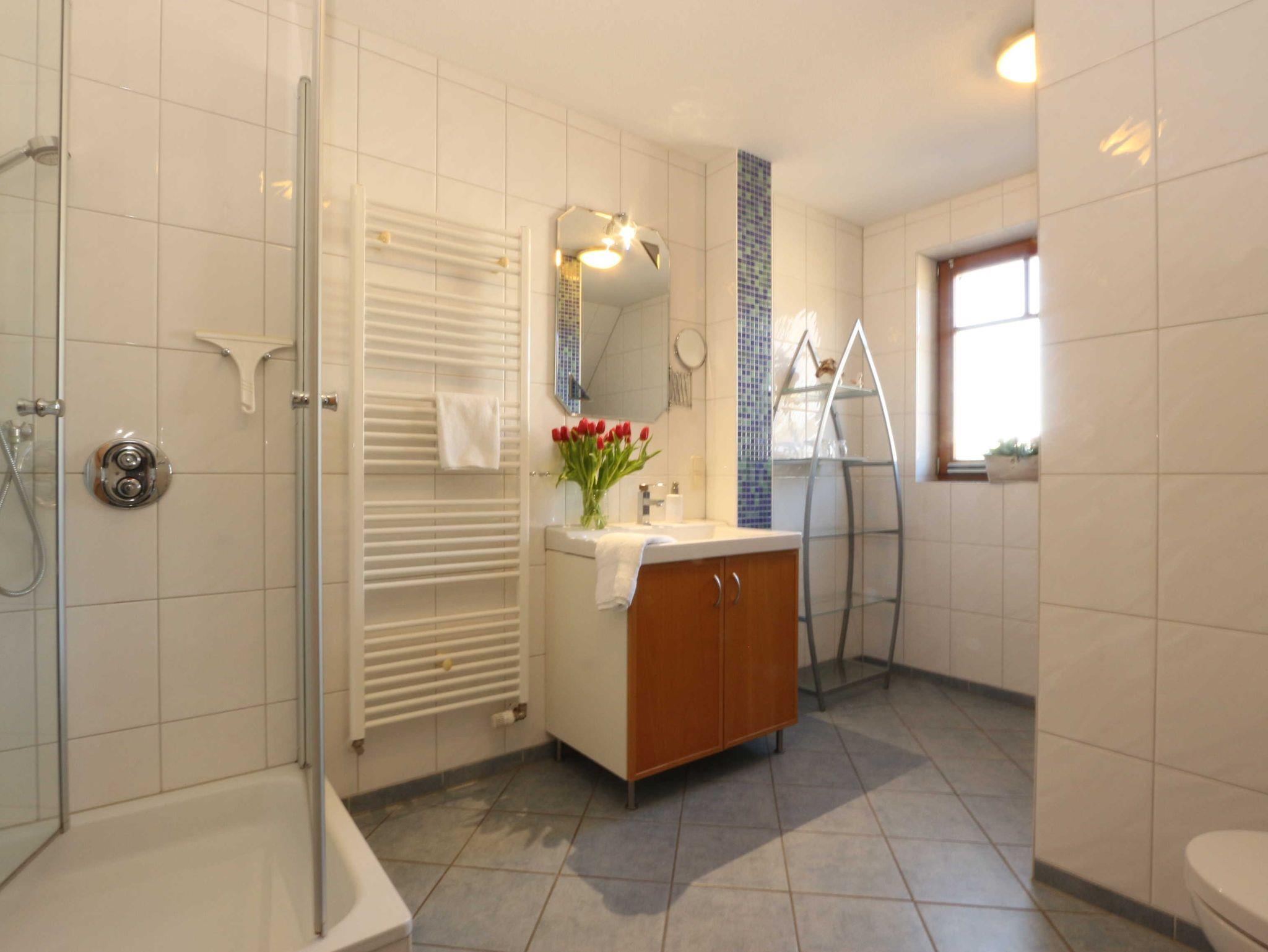 • Im Badezimmer sind Dusche, WC, Waschtisch und Handtuchtrockenheizkörper.