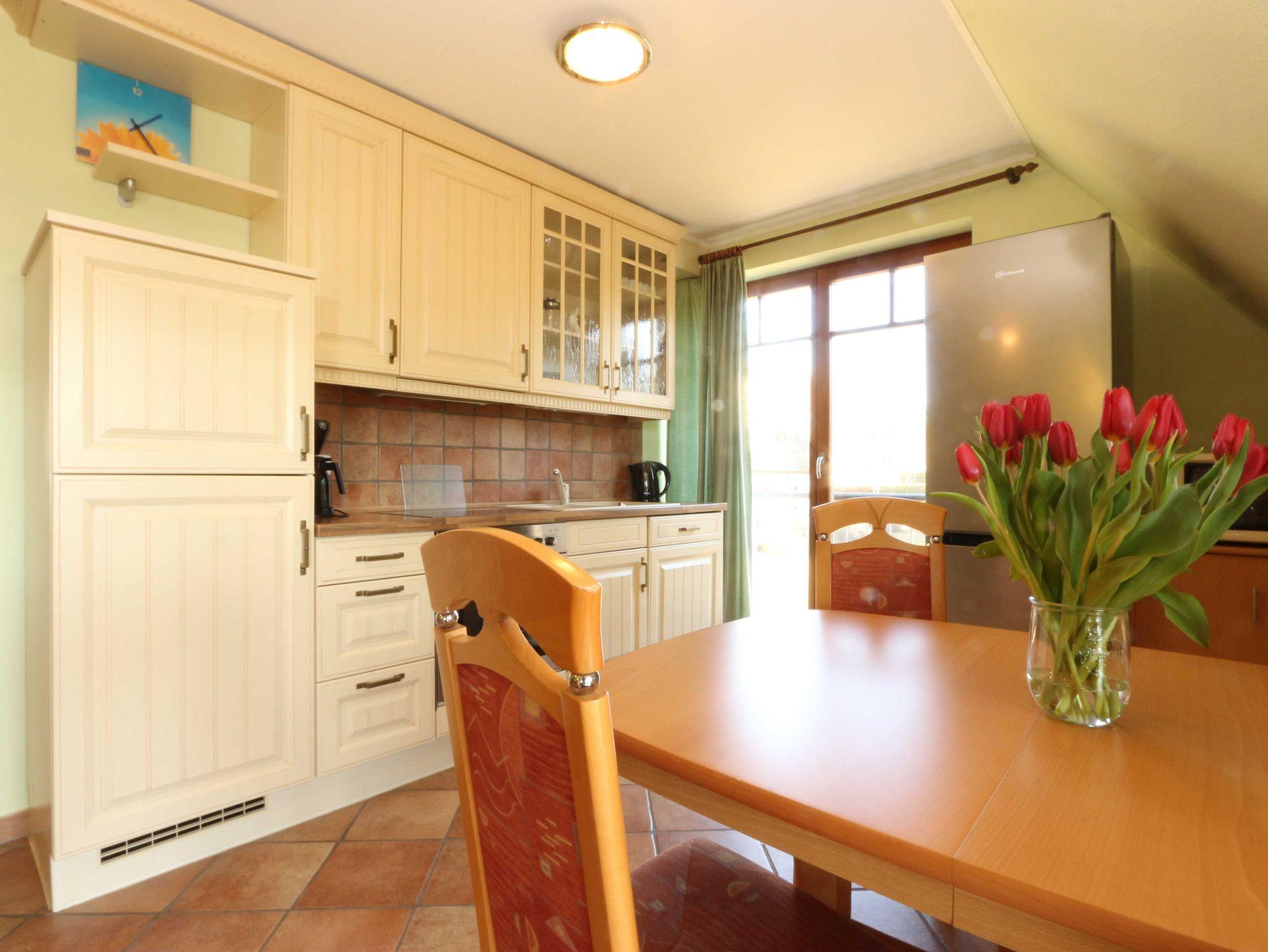 Die Einbauküche ist mit Geschirrspüler, Kühlschrank mit Gefrierfach, Herd, Mikrowelle, Kaffeemaschine, Toaster, Wasserkocher und Eierkocher ausgestattet.