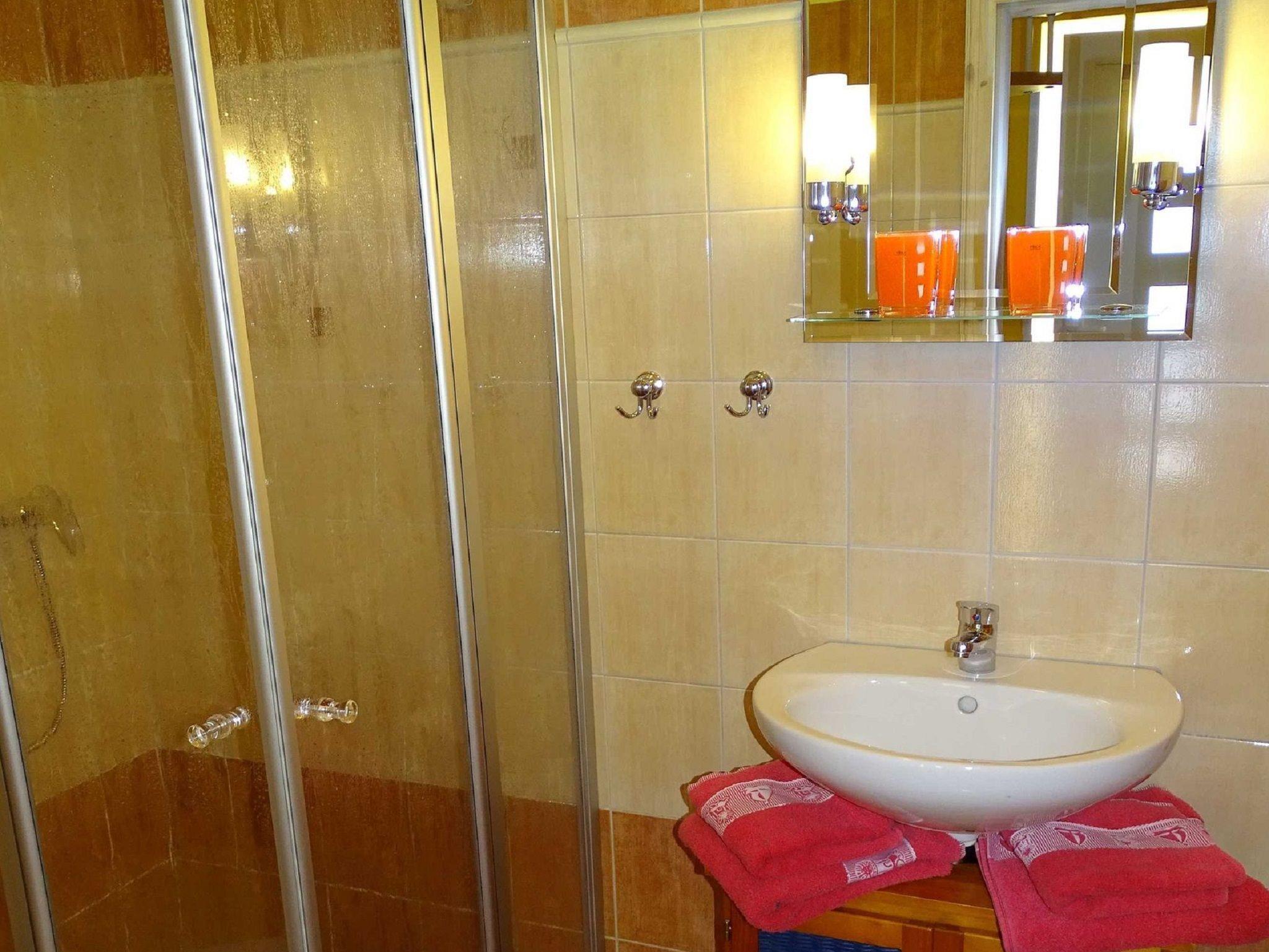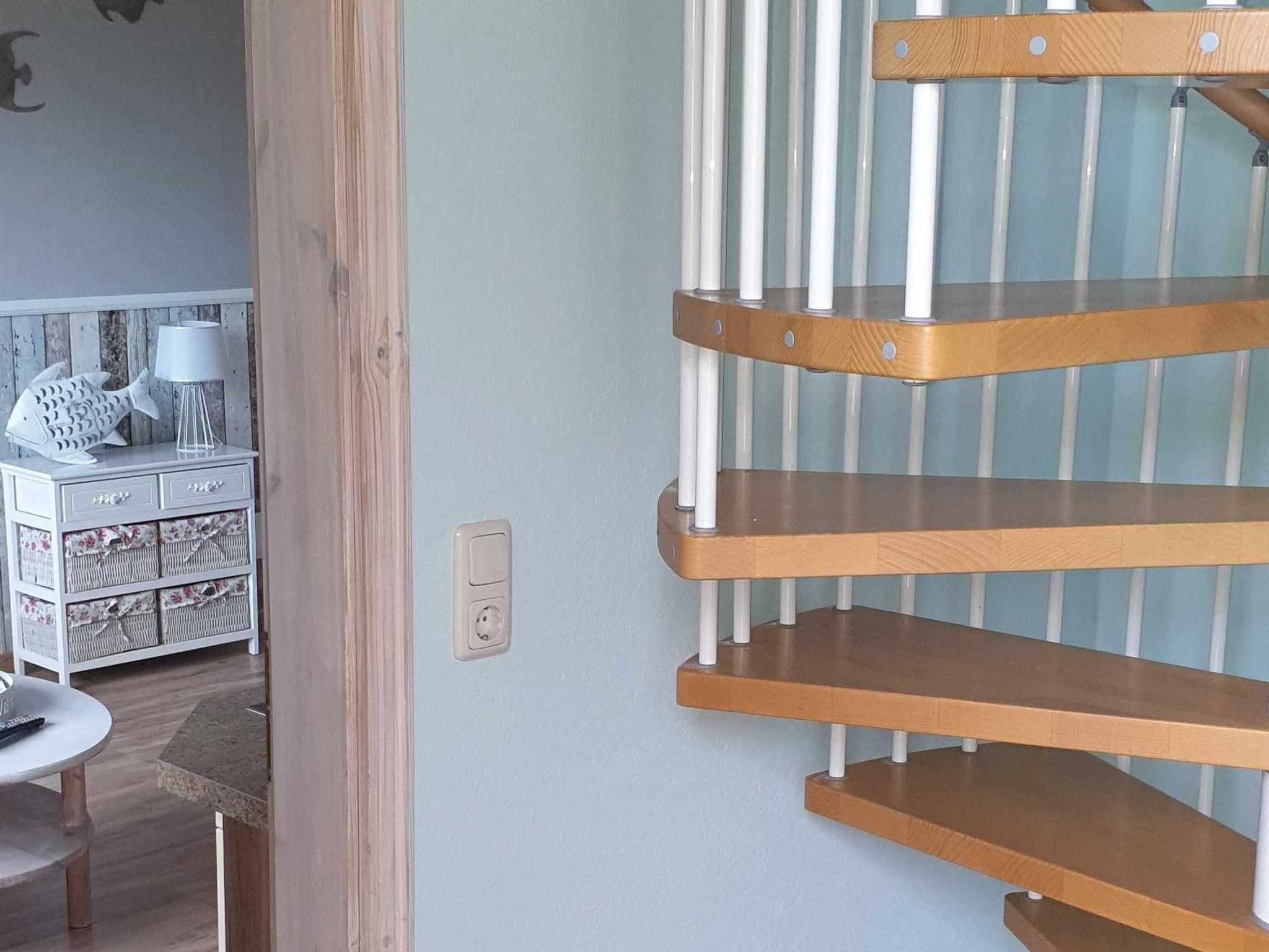 Im Erdgeschoss befinden sich: 1 Schlafzimmer mit Etagenbett, 1 Wohnzimmer mit integrierter Küchenzeile, (komplett mit Toaster, Kaffemaschine und Geschirr), Bad mit bodengleicher Dusche und ein WC. Das zweite Schlafzimmer mit Doppelbett ist über eine Wendeltreppe zu erreichen.