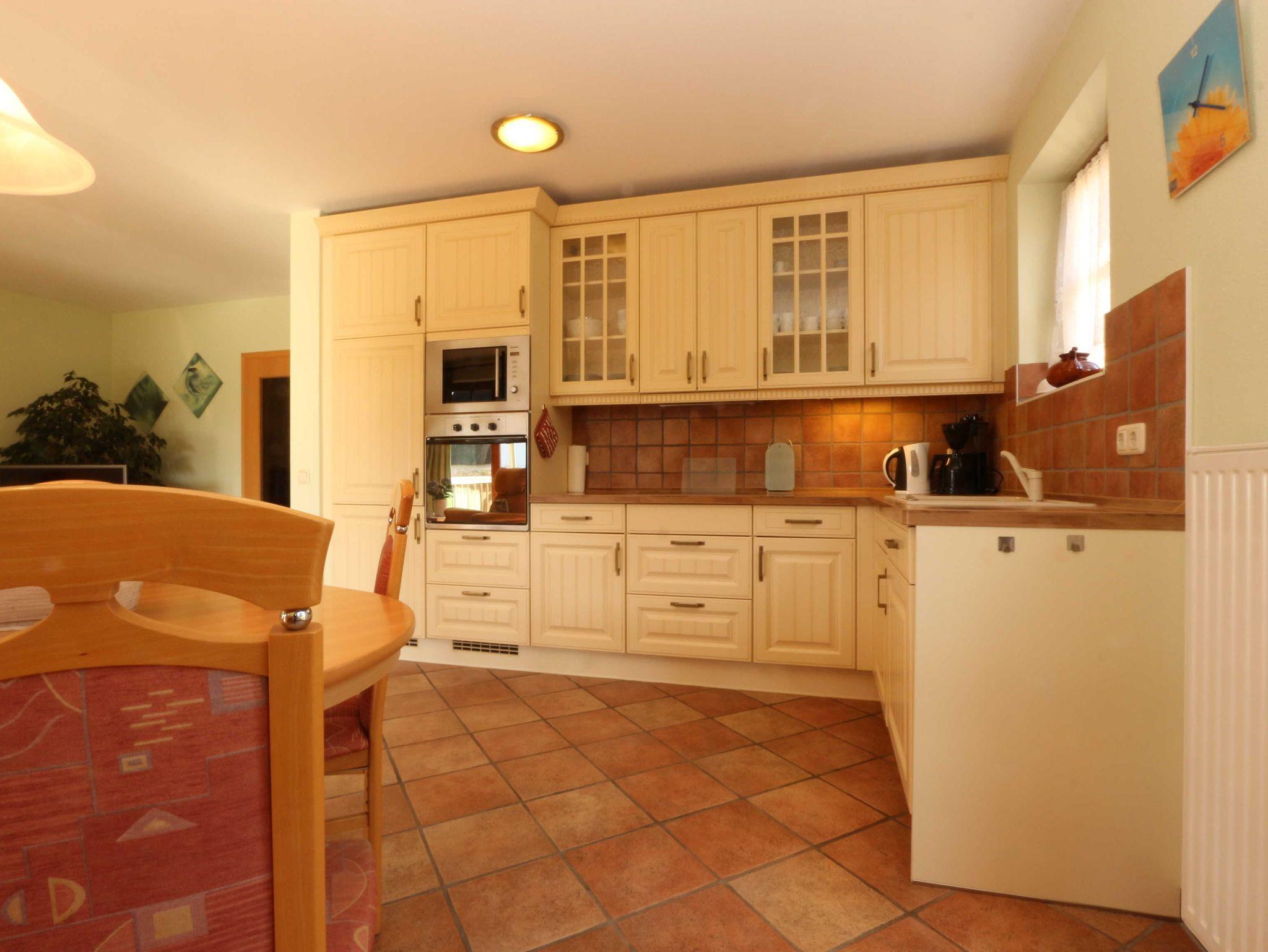 Die Einbauküche ist mit Geschirrspüler, Herd, Mikrowelle, Kühlschrank mit Gefrierfach, Toaster, Kaffeemaschine, Wasserkocher und Eierkocher ausgestattet.