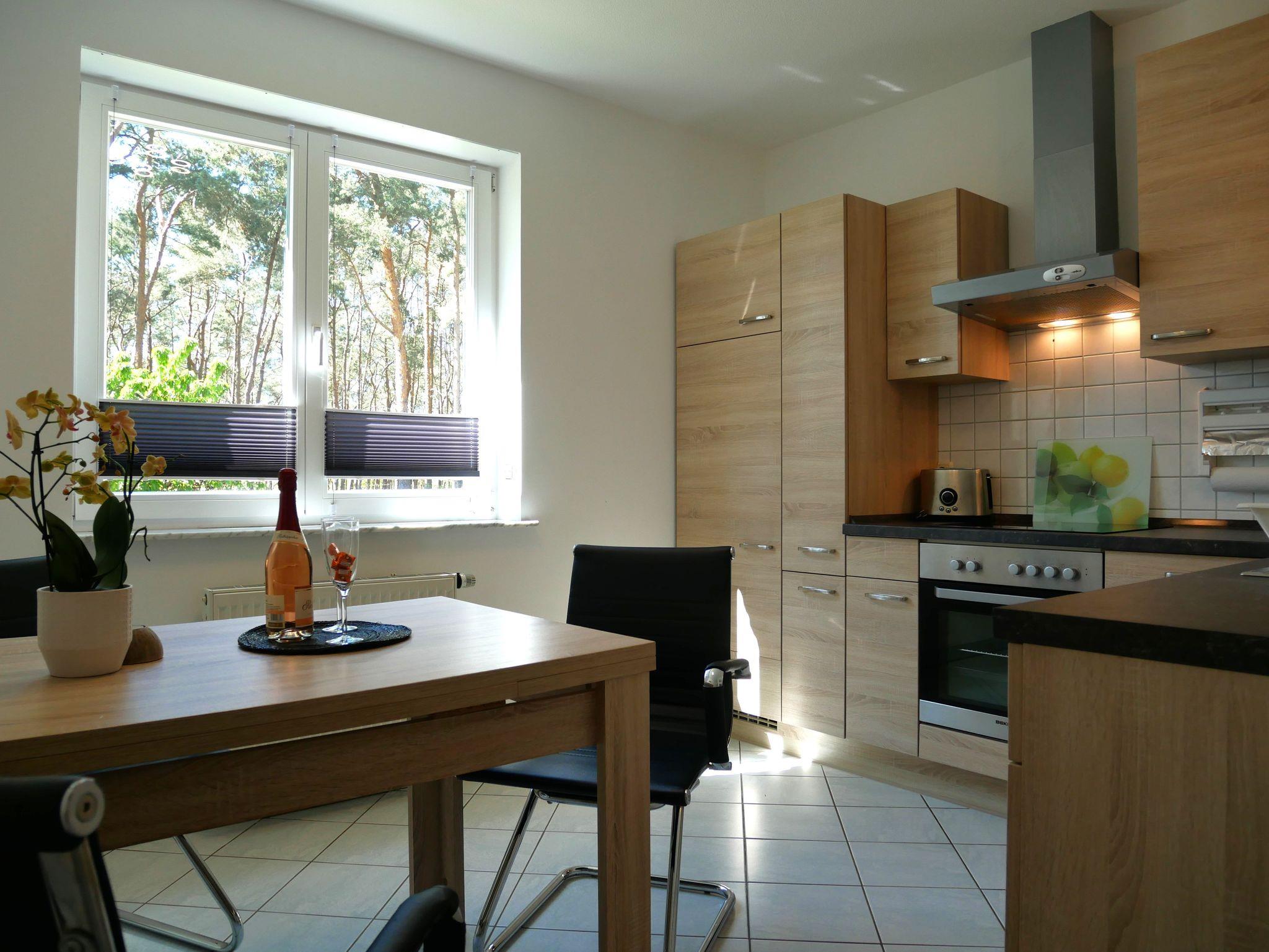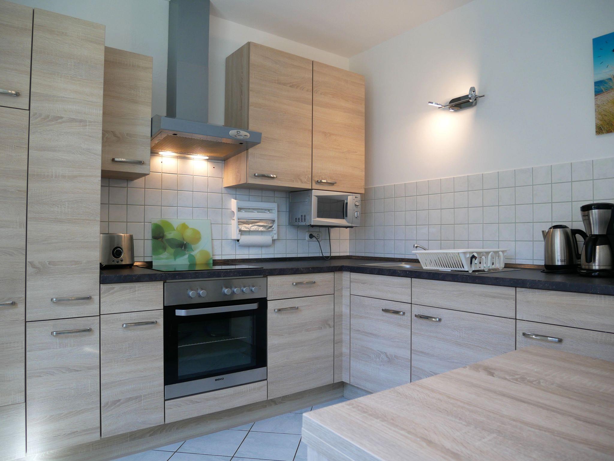Der gemütliche Wohnbereich lädt mit einer bequemen Couch und einem Flachbildfernseher zum Verweilen ein. Die moderne Einbauküche ist vollständig ausgestattet, sodass Sie bequem kochen können: inklusive Cerankochfeld, Backofen, Kühlschrank mit Gefrierfach, Mikrowelle, Kaffeemaschine, Toaster und Wasserkocher.