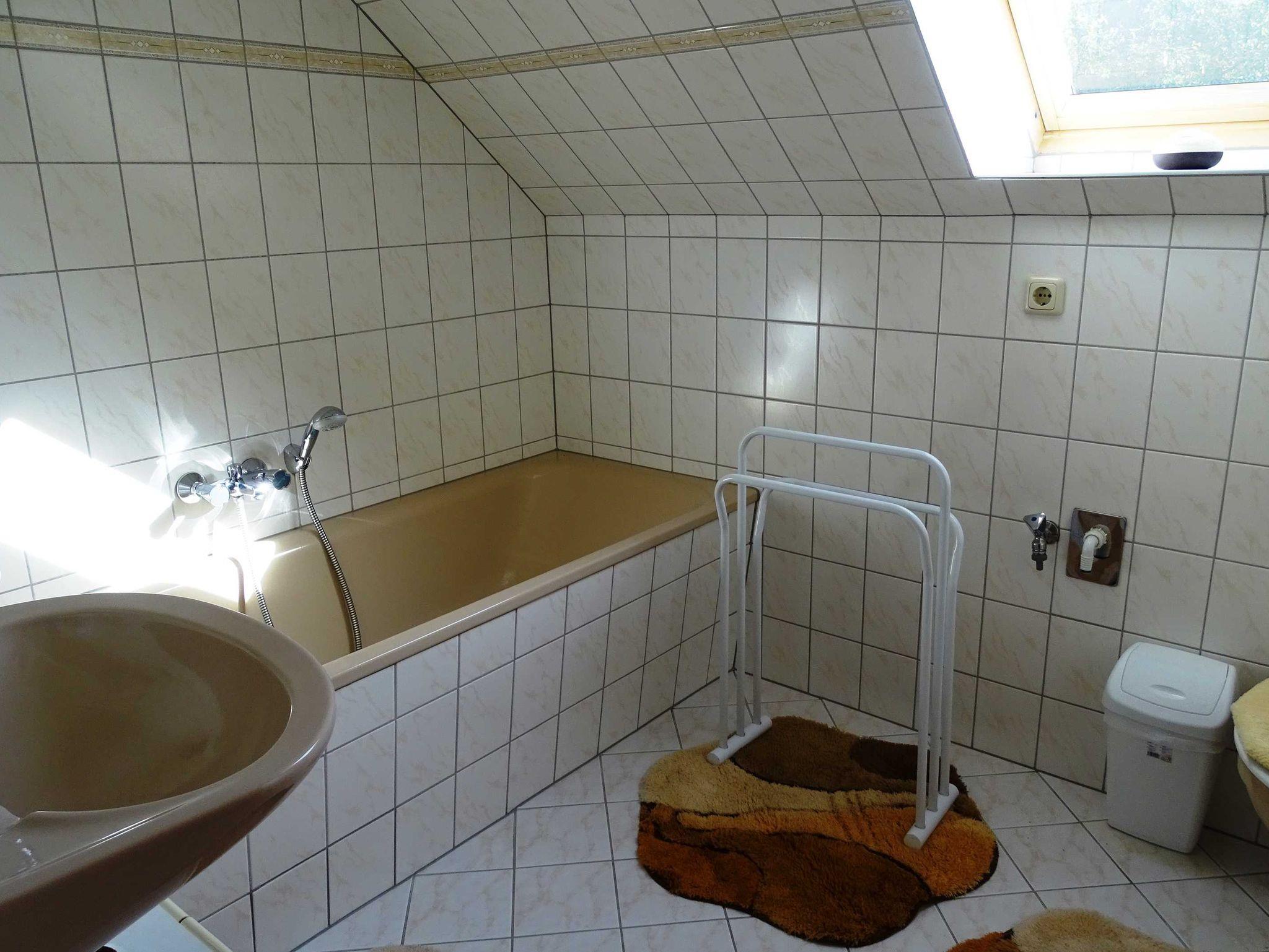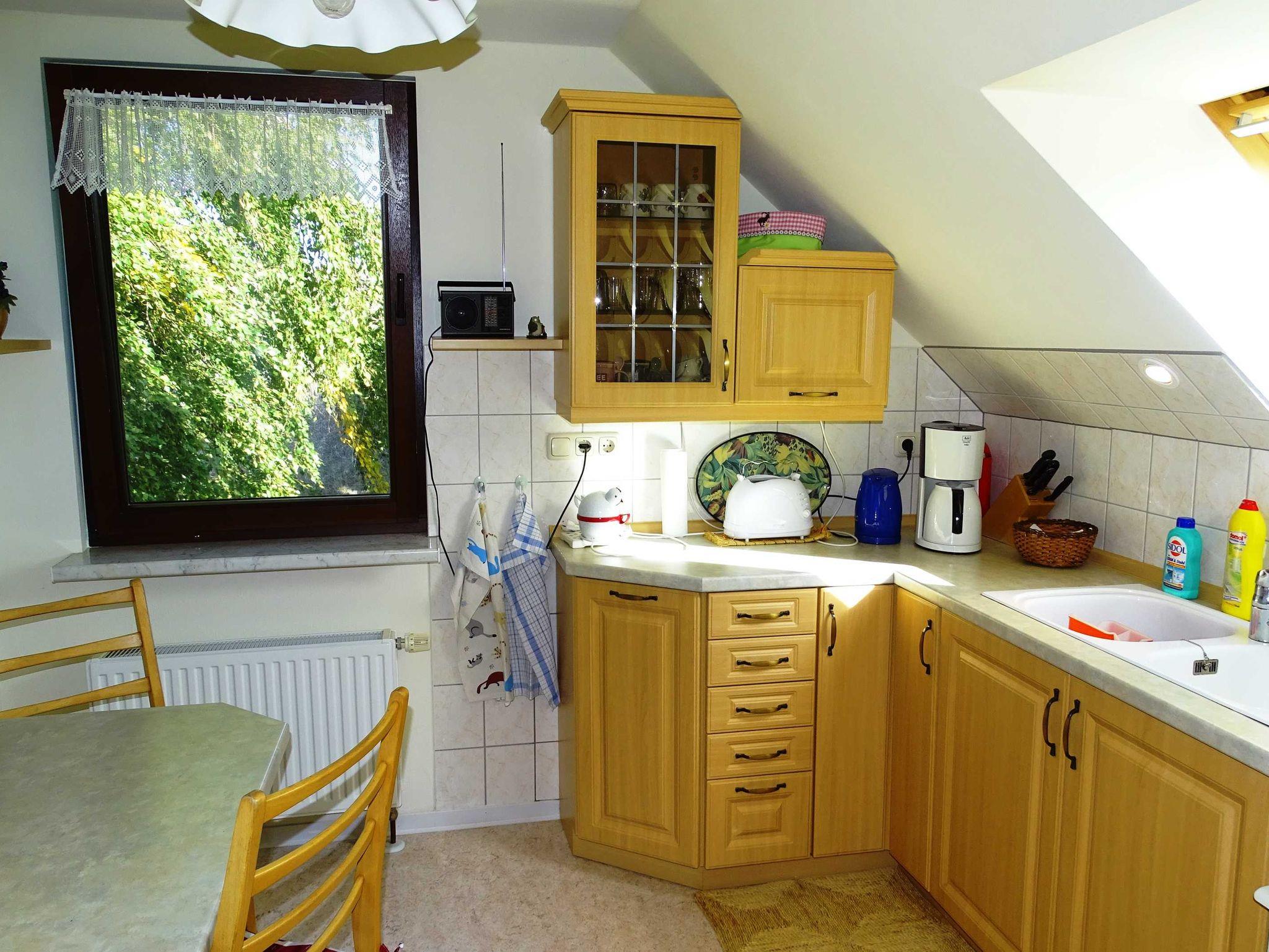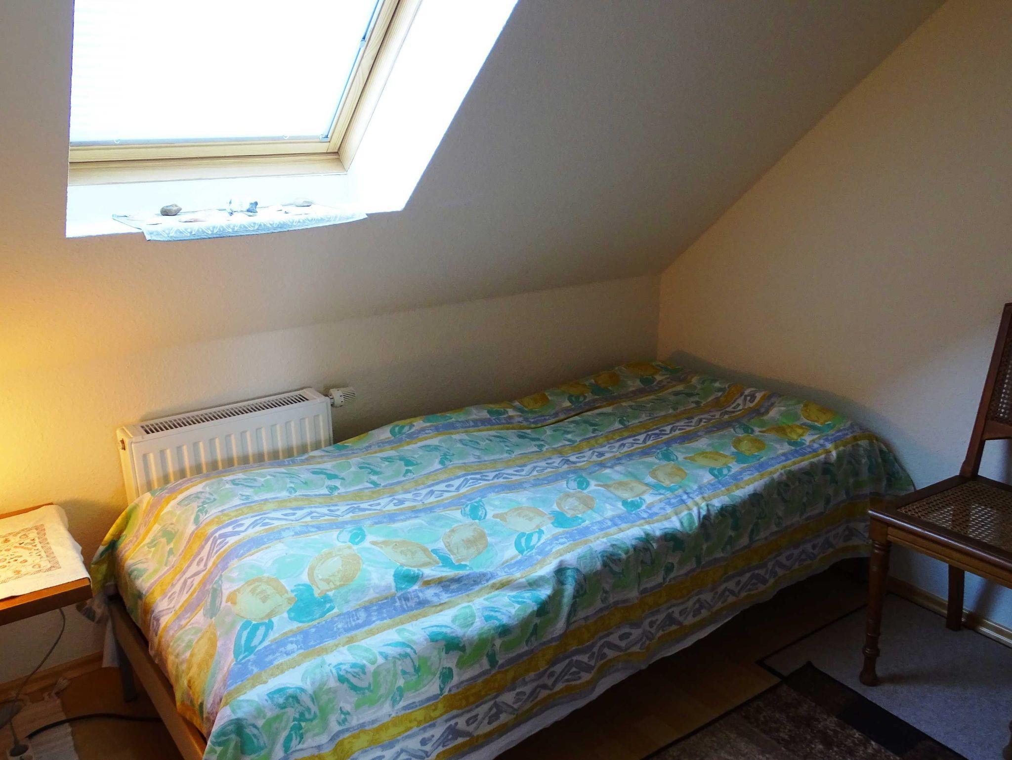 Die komfortabel ausgestattete 60 m² große Ferienwohnung für zwei Personen im Dachgeschoß besteht aus Küche, Wohnzimmer mit Essbereich, zwei Schlafzimmern und Bad mit WC. Die Küche ist komplett ausgestattet. In einem Schlafzimmer befindet sich ein Doppelbett und im anderen Schlafzimmer eine Einzelliege. Das Bad hat eine Badewanne mit Handdusche und WC.
