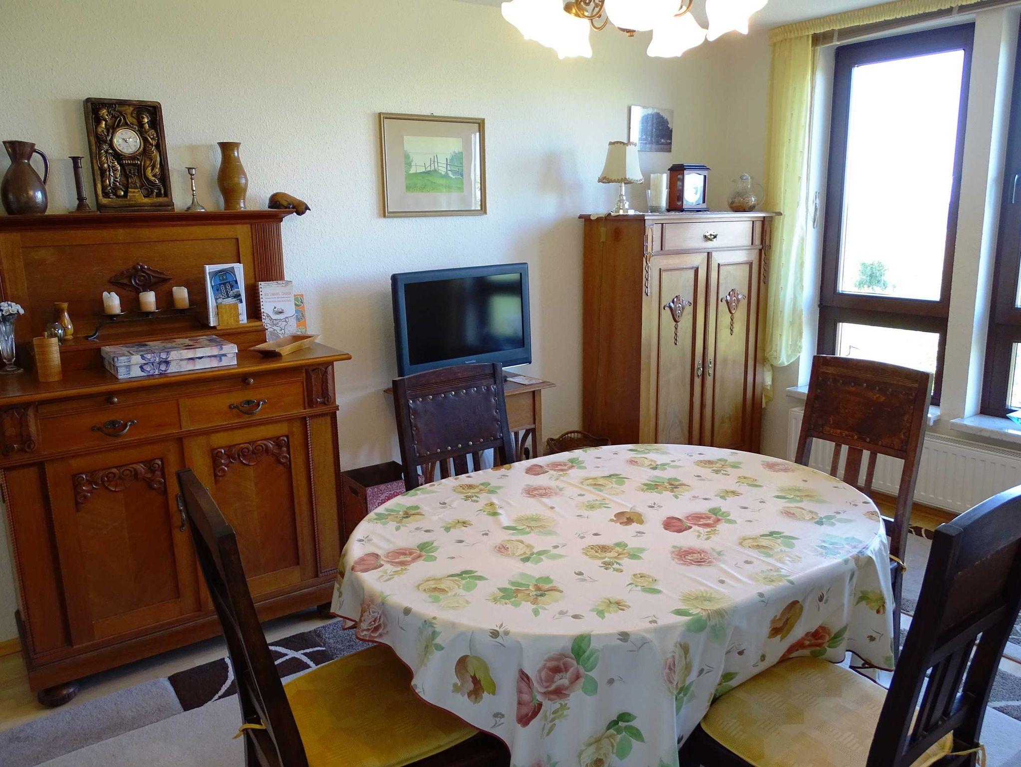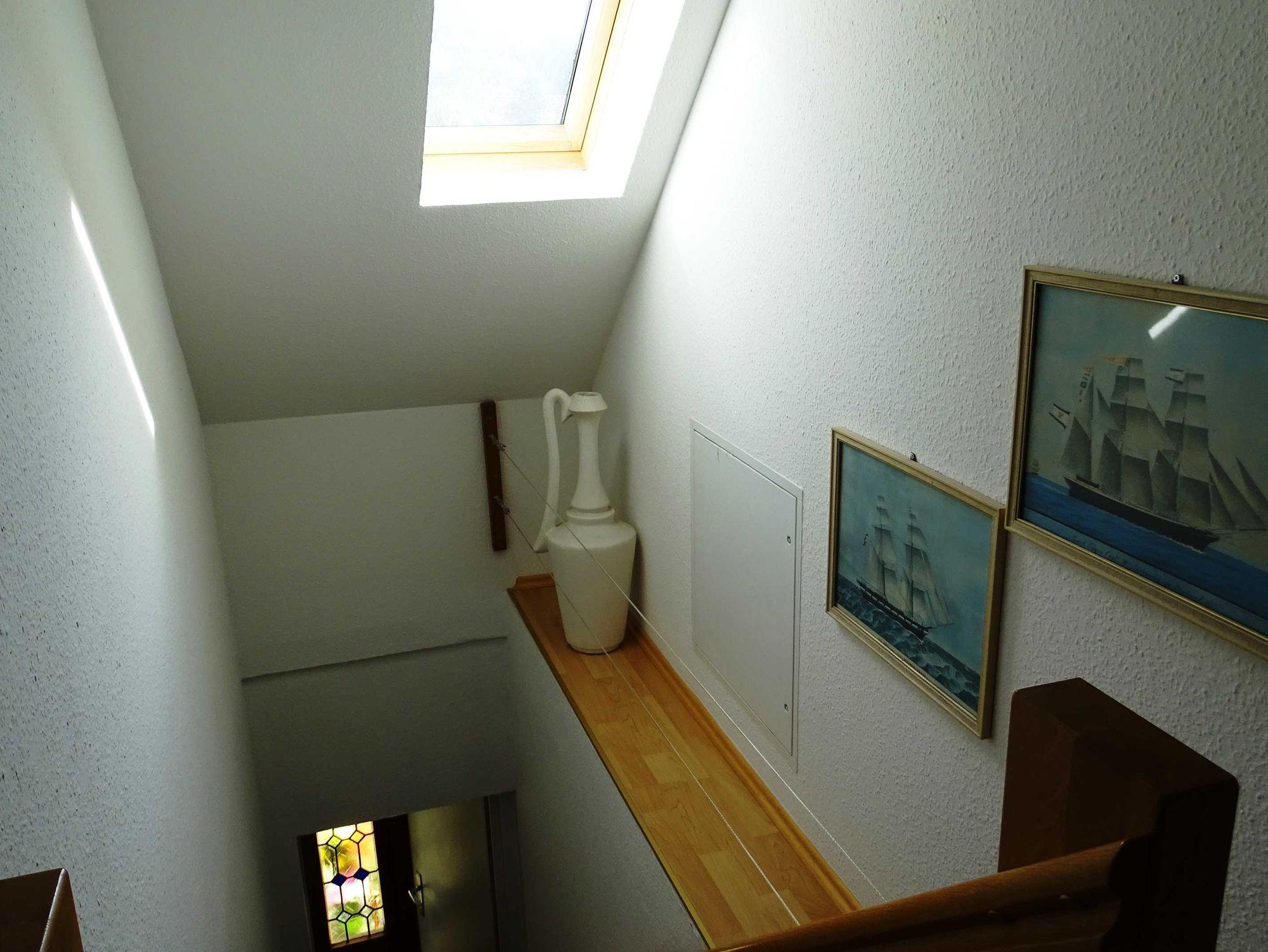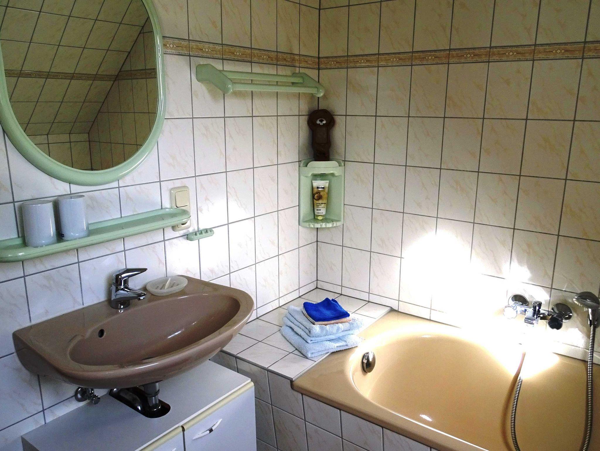 Die komfortabel ausgestattete 60 m² große Ferienwohnung für zwei Personen im Dachgeschoß besteht aus Küche, Wohnzimmer mit Essbereich, zwei Schlafzimmern und Bad mit WC. Die Küche ist komplett ausgestattet. In einem Schlafzimmer befindet sich ein Doppelbett und im anderen Schlafzimmer eine Einzelliege. Das Bad hat eine Badewanne mit Handdusche und WC.