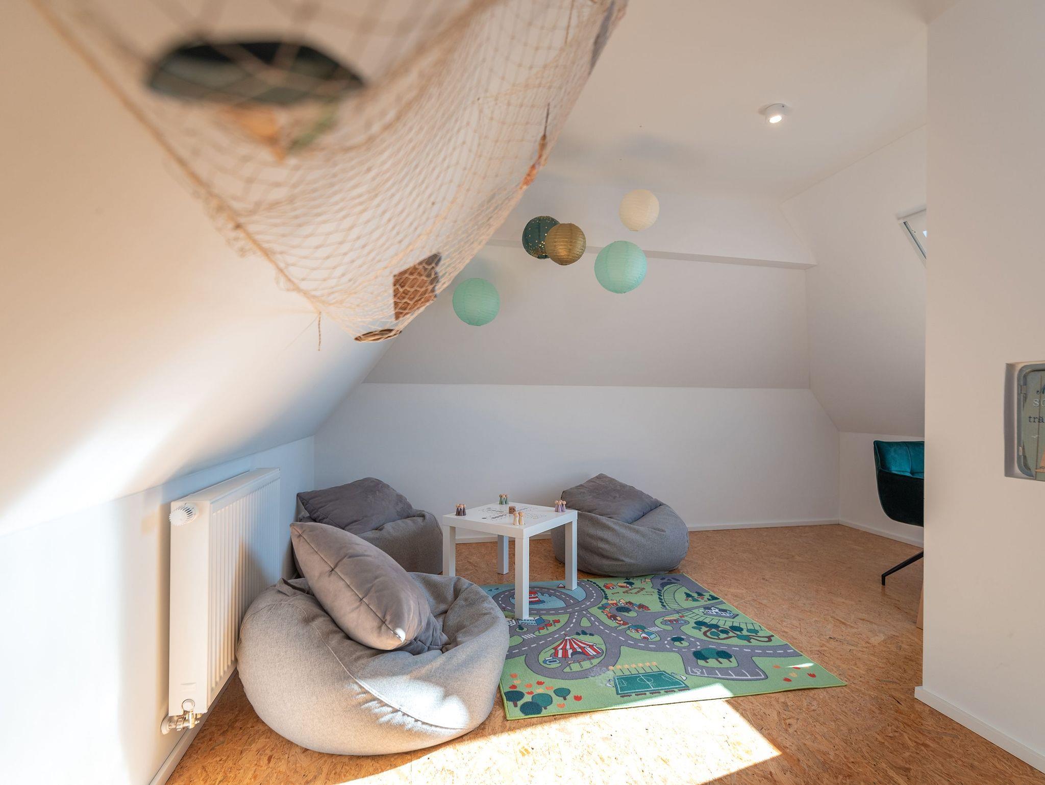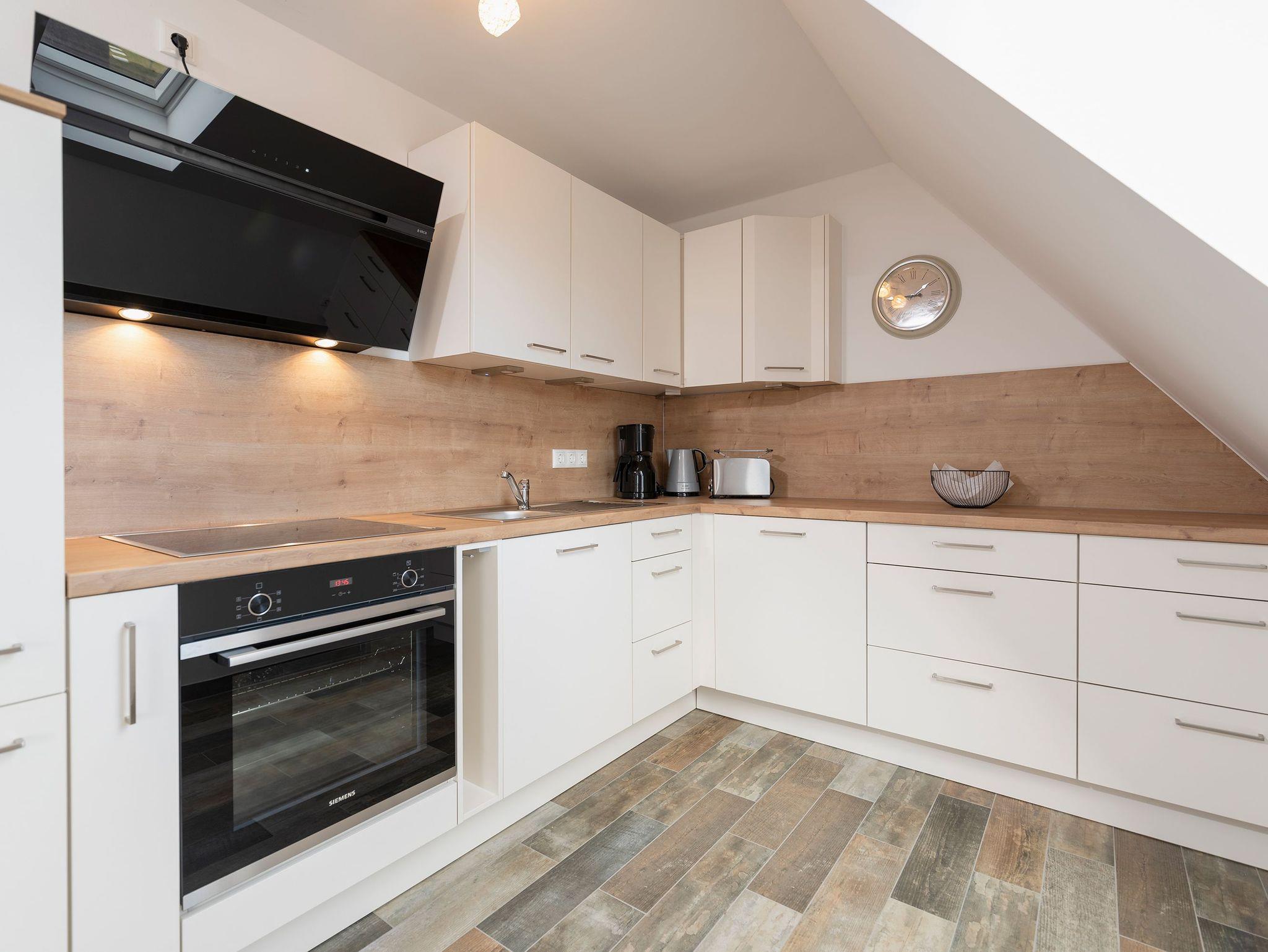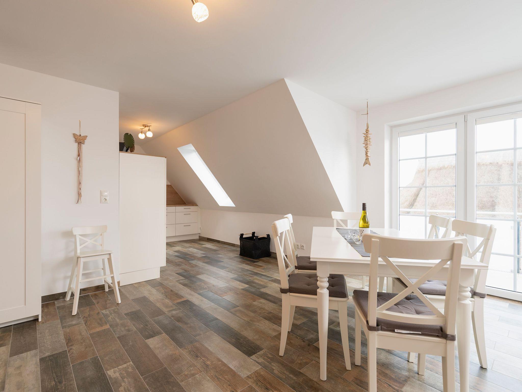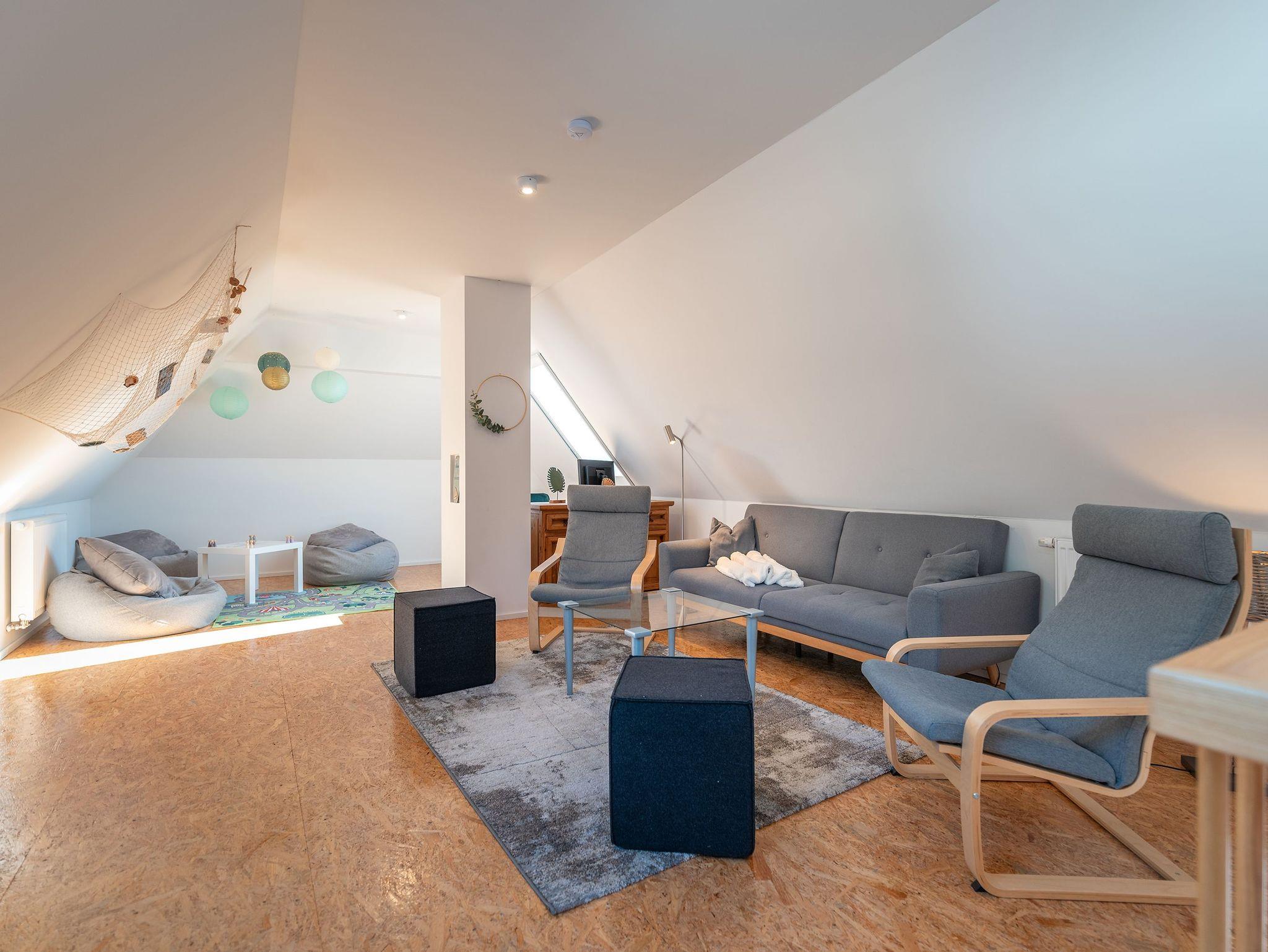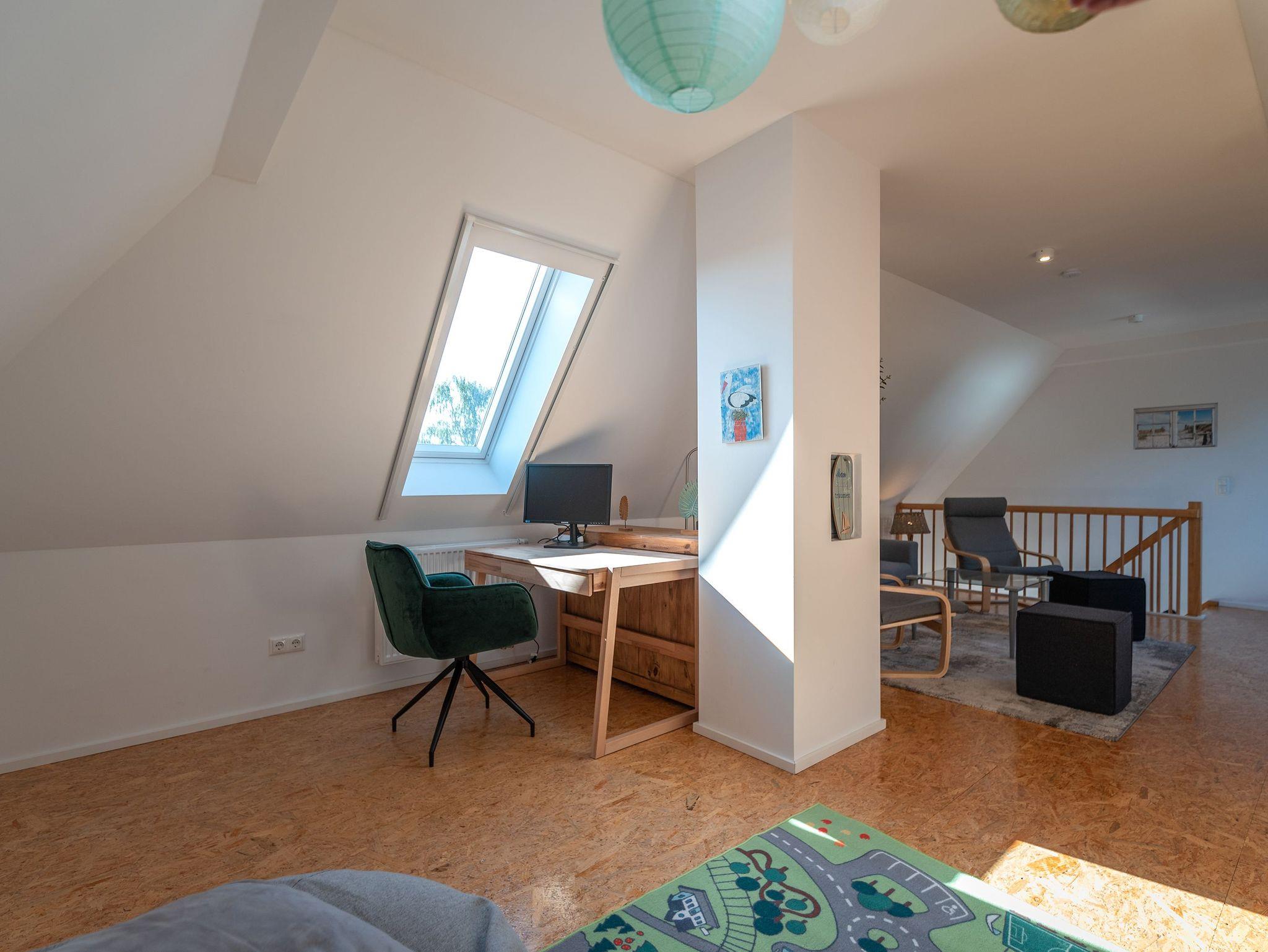 Die voll ausgestattete Küche und der angrenzende Essbereich mit Platz für sechs Personen laden zu gemeinsamen Mahlzeiten ein, während der Kamin gemütliche Stunden verspricht. Der Balkon, zugänglich vom Essbereich, ermöglicht entspannte Momente im Freien. Die obere Etage beherbergt ein geräumiges Wohnzimmer mit Flat-TV, bequemen Sitzmöglichkeiten und einem Schreibtisch, ideal für Erholung oder auch Homeoffice.