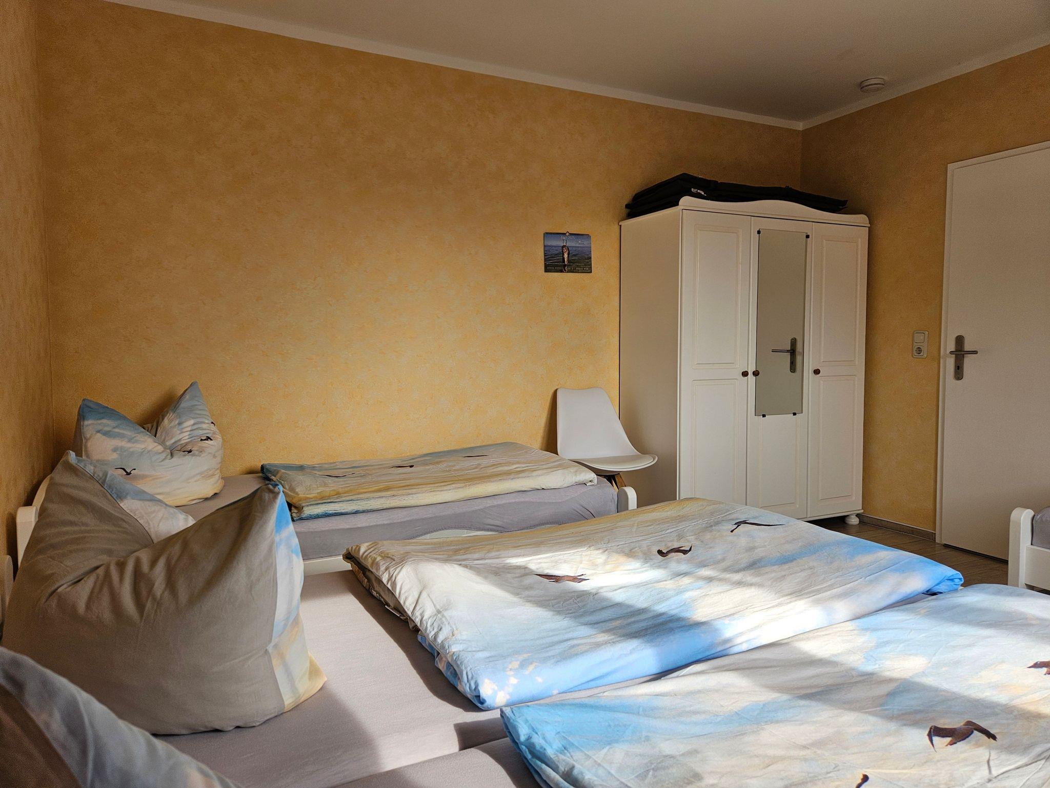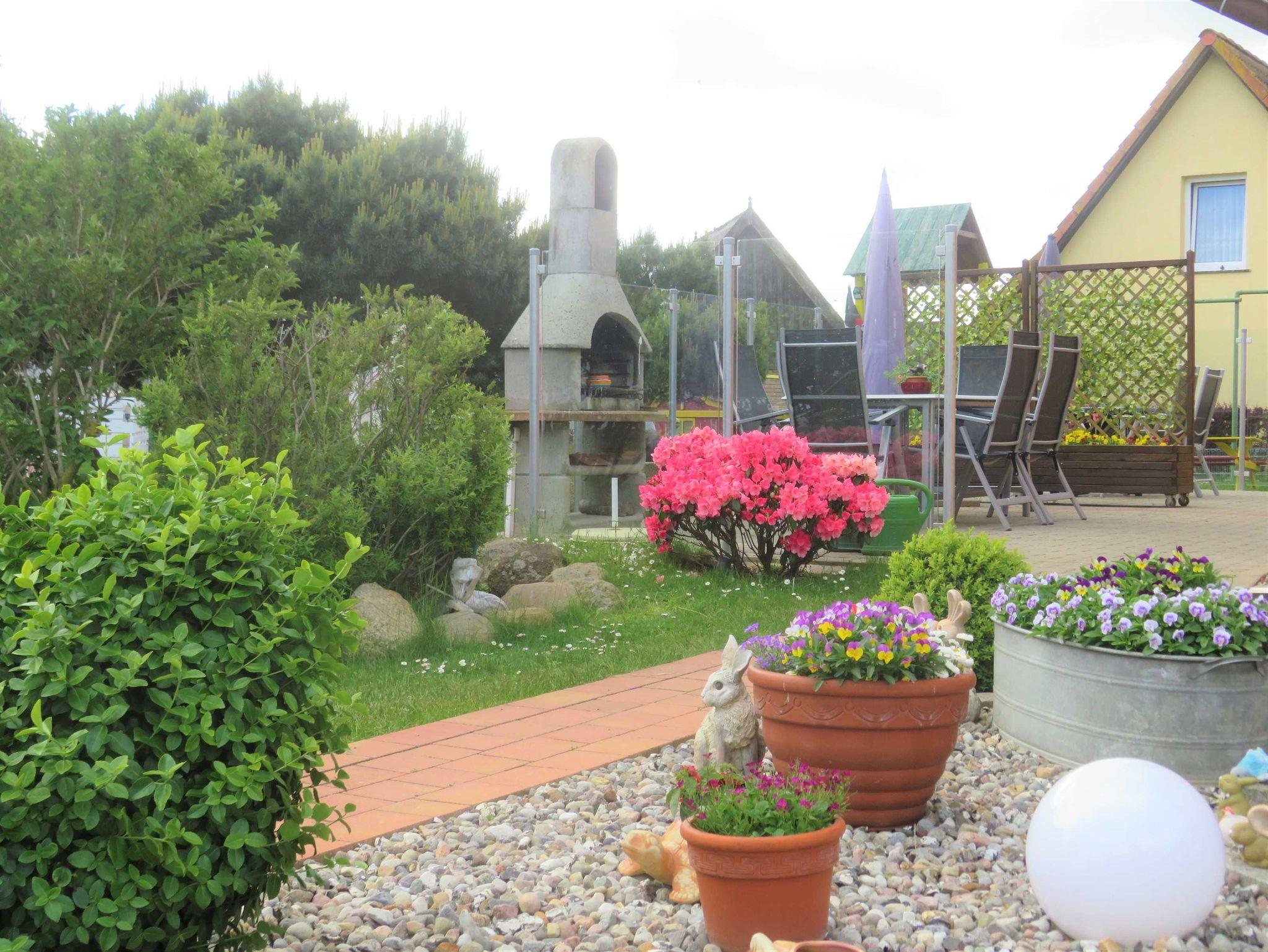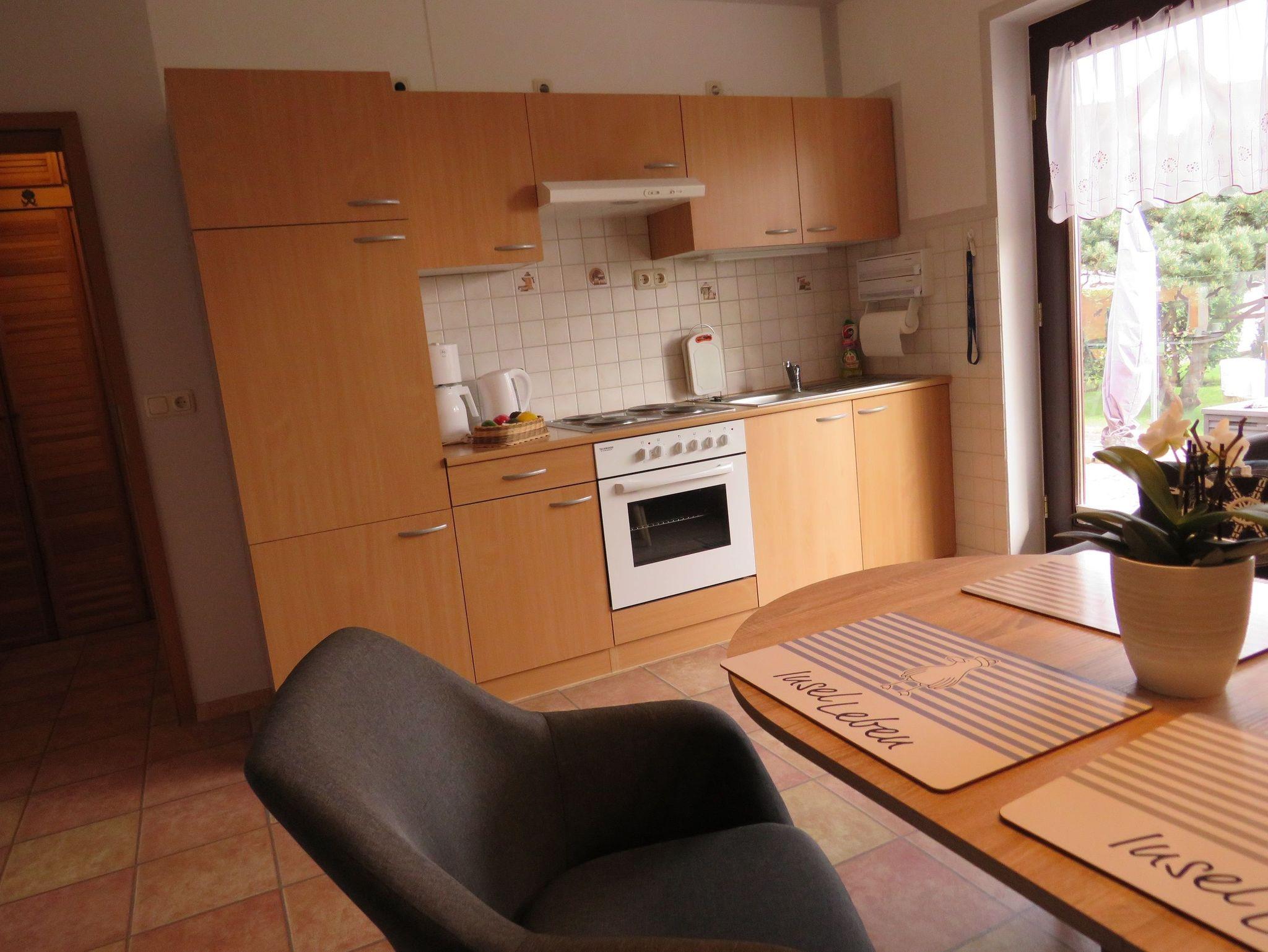 Wir vermieten eine moderne Ferienwohnung im Erdgeschoss eines Wohnhauses. Im Wohnzimmer mit gemütlicher Couch, Fernseher und Radio ist eine offene Küchenzeile integriert. Das Schlafzimmer verfügt über ein Doppelbett und zwei Einzelbetten. Ein Bad mit Dusche und WC sowie eine Terrasse mit Grillmöglichkeit gehören ebenso zur Ferienwohnung dazu. Für Ihre mitgebrachten Fahrräder ist eine Unterstellmöglichkeit vorhanden. Ein PKW-Stellplatz befindet sich auf dem Grundstück. Kinderreisebett und Hochstuhl sind auf Wunsch dazu zu mieten. Die Ferienwohnung ist in ruhiger Lage in der Nähe des Achterwassers. Die Erstausstattung Bettwäsche und Geschirrtücher sind inklusive. Handtücher auf Anfrage.