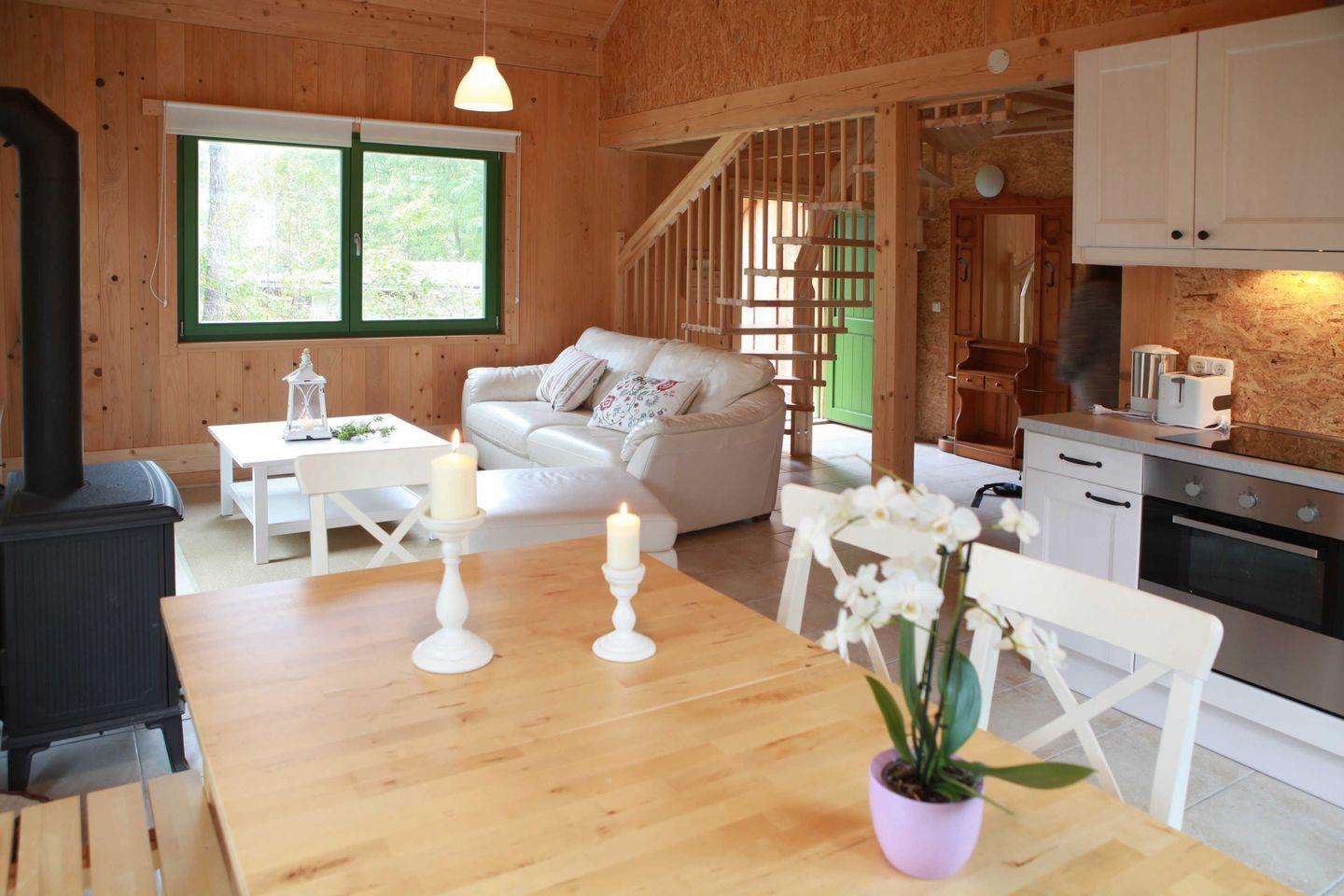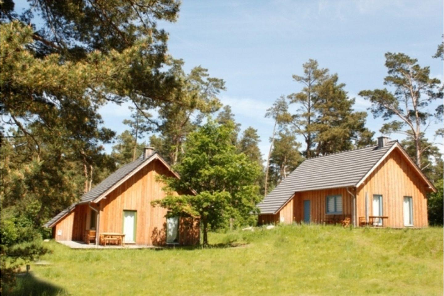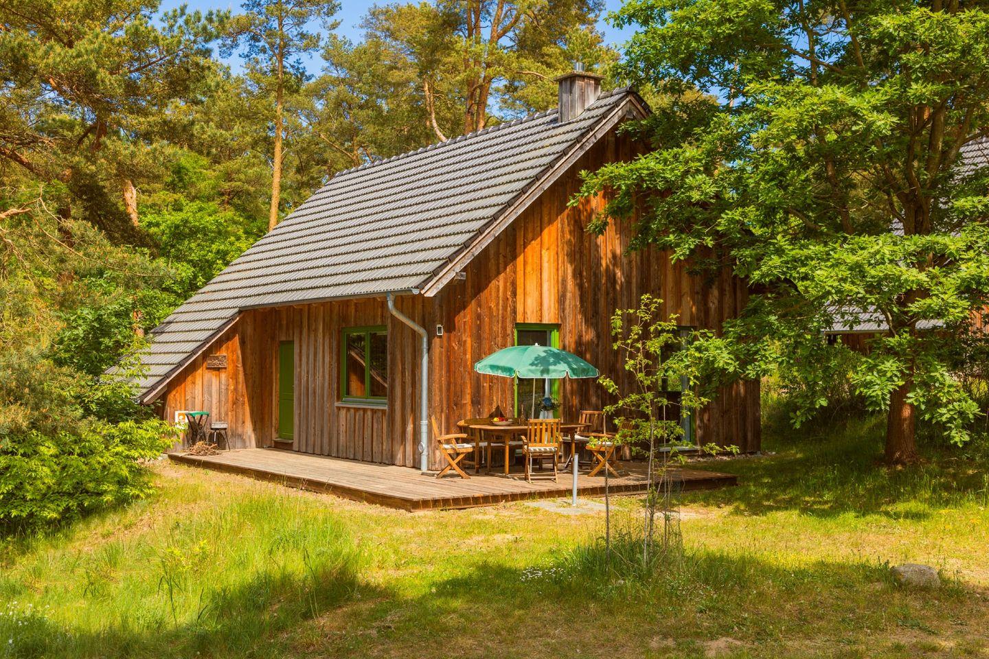 Für Naturliebhaber: Das Vollholz-Haus im Wald garantiert einen unvergesslichen Urlaub. Sie wohnen im Ferienpark Minna Busch in einem massiven Holzhaus, völlig metall- und leim frei und mit sägerauer Lärche verschalt. Diese Bauweise und die Ausrichtung der Räume nach baubiologischen Prinzipien garantieren optimales Licht und ein tolles Raumklima: Schlafen nach Norden für angenehme Kühle; Wohnen, Kochen und Essen mit Sonne von morgens bis abends
