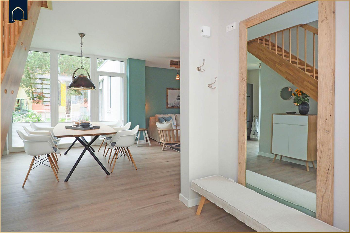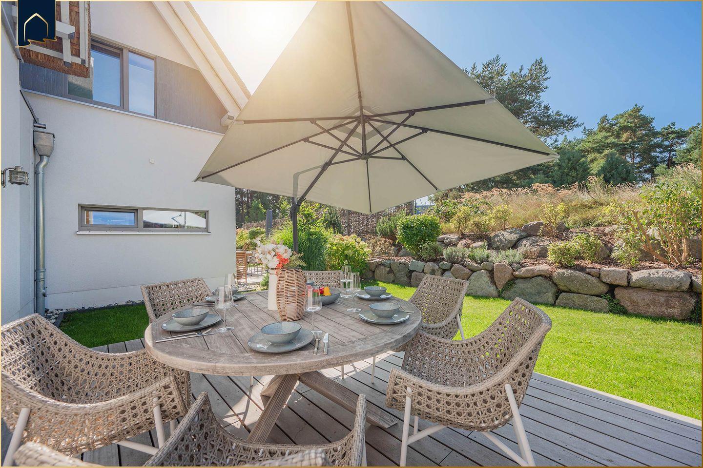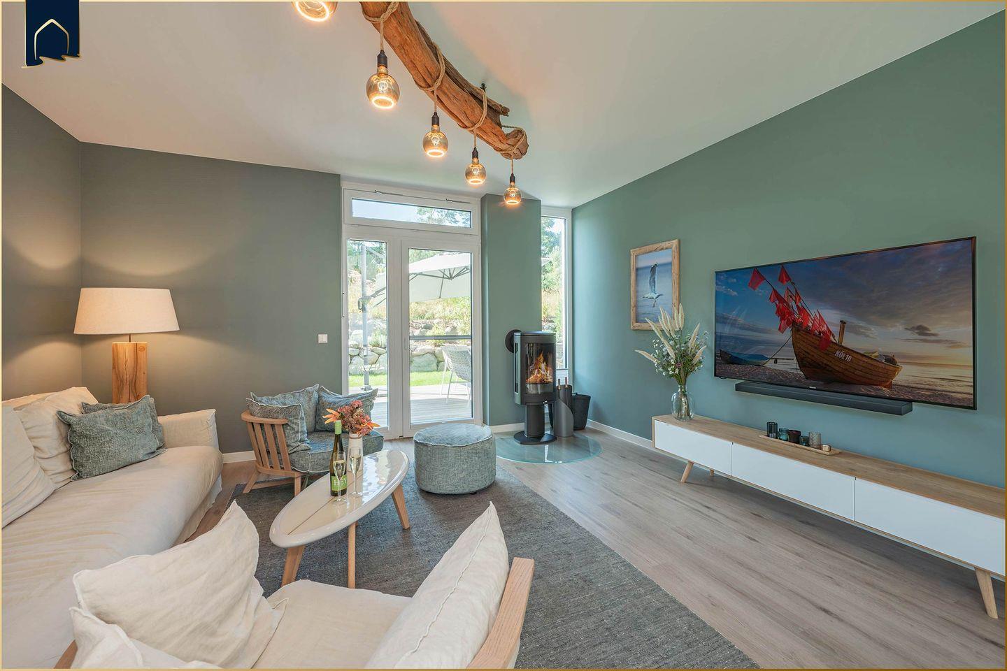 In dem lichtdurchfluteten Wohn- und Essbereich mit offenem Kamin, gemütlicher Sofalandschaft und direktem Zugang zur großen Holzterrasse mit Garten fühlt man sich sofort wohl. Die offene Designküche ist voll ausgestattet und lädt zum gemeinsamen Kochen und Genießen ein – ob schnelles Frühstück oder ausgedehntes Dinner. Draußen erwarten Sie Loungemöbel, ein Strandkorb und ein Elektrogrill – perfekt für entspannte Abende in der Sonne oder unter den Sternen.