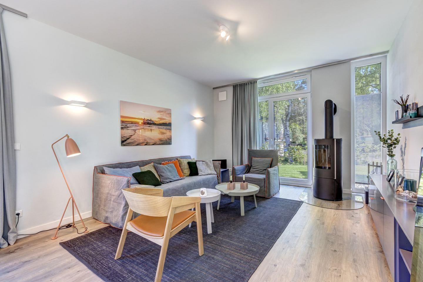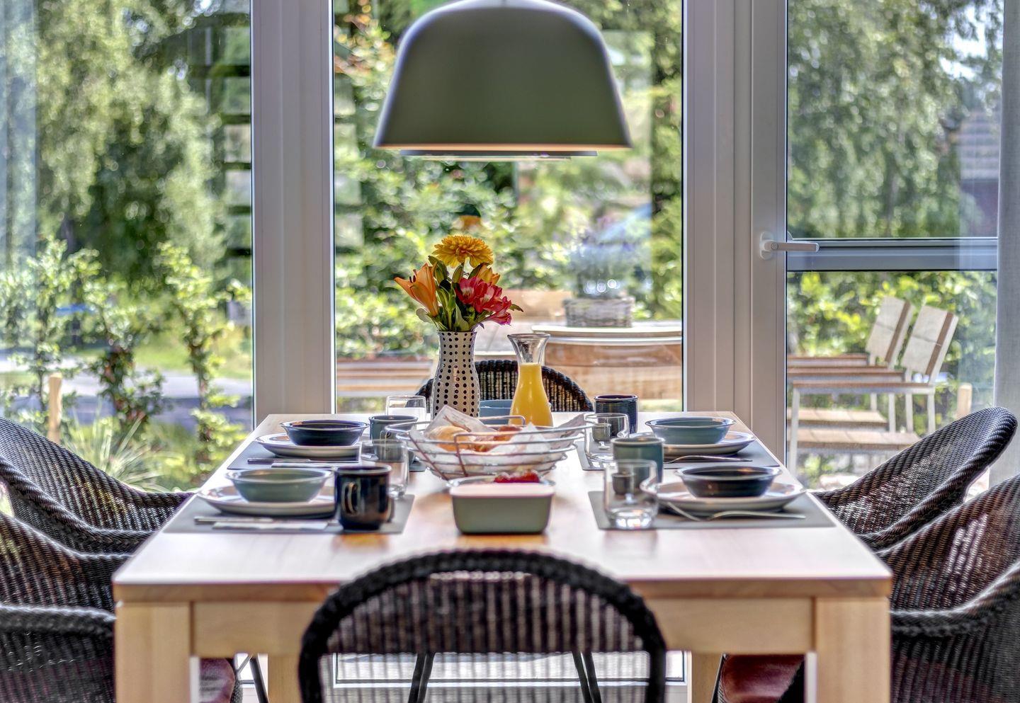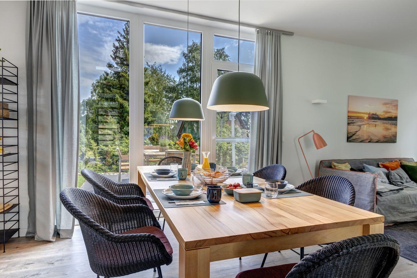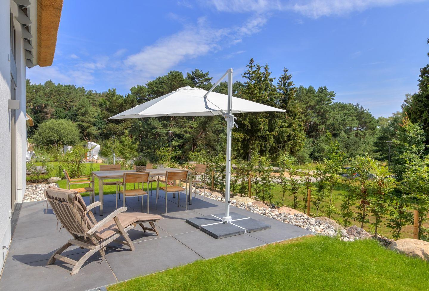 Wir haben unser mit 5-DTV-Sternen zertifiziertes Ferienhaus modern und mit vielen exklusiven Möbeln von skandinavischen und deutschen Designern eingerichtet. Das 500 m2 große Gartengrundstück wurde von einer Gartenbauarchitektin gestaltet und bepflanzt und mit einer Beregnungsanlage ausgestattet. Im Außenbereich auf der Ostseite finden Sie eine große Steinterrasse mit hochwertigen Teak-Möbeln und eine Elektrogrillstation von Weber-Grill. Auf der Südterrasse befindet sich der Strandkorb und ein Deckchair zum Sonnenbaden.