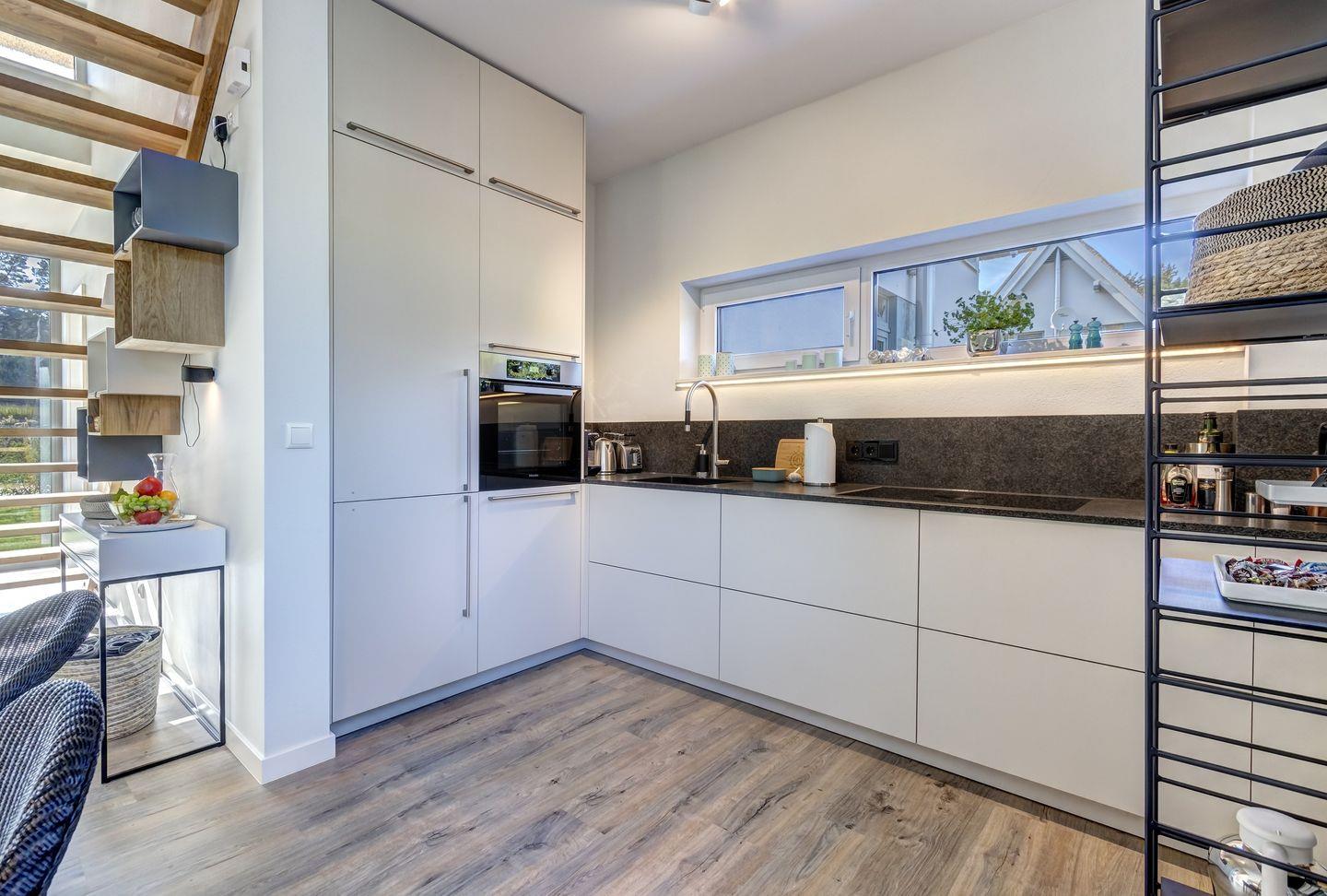Das Erdgeschoss verfügt über einen offenen und großzügigen Ess-Wohnbereich mit Küche und Kaminofen. Die designorientierte Küche ist funktional mit einer Kühl-Gefrierkombination, Backofen, Geschirrspülmaschine und mit einem BORA Induktions- Glaskeramik-Kochfeld mit integrierten Dunstabzug bestens ausgestattet. Eine exklusive Küchenausstattung mit modernsten Küchengeräten stehen Ihnen hier zur Verfügung. Weiterhin befindet sich ein Duschbad mit Walk-In-Dusche und WC im EG. Im Hauswirtschaftsraum befindet sich eine Waschmaschine mit Trockner.
