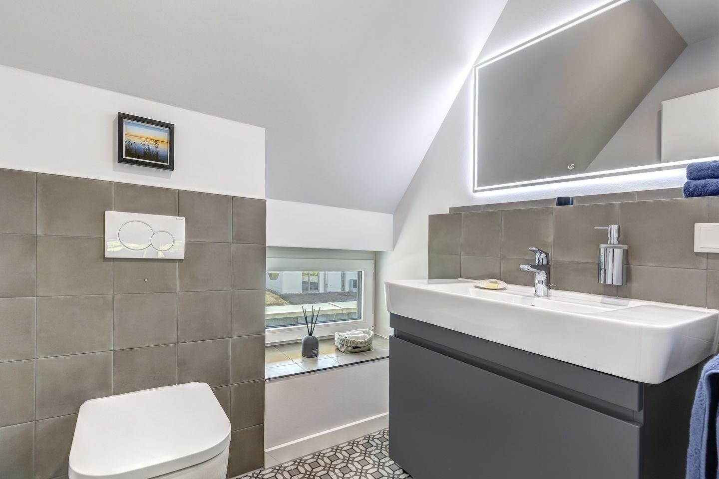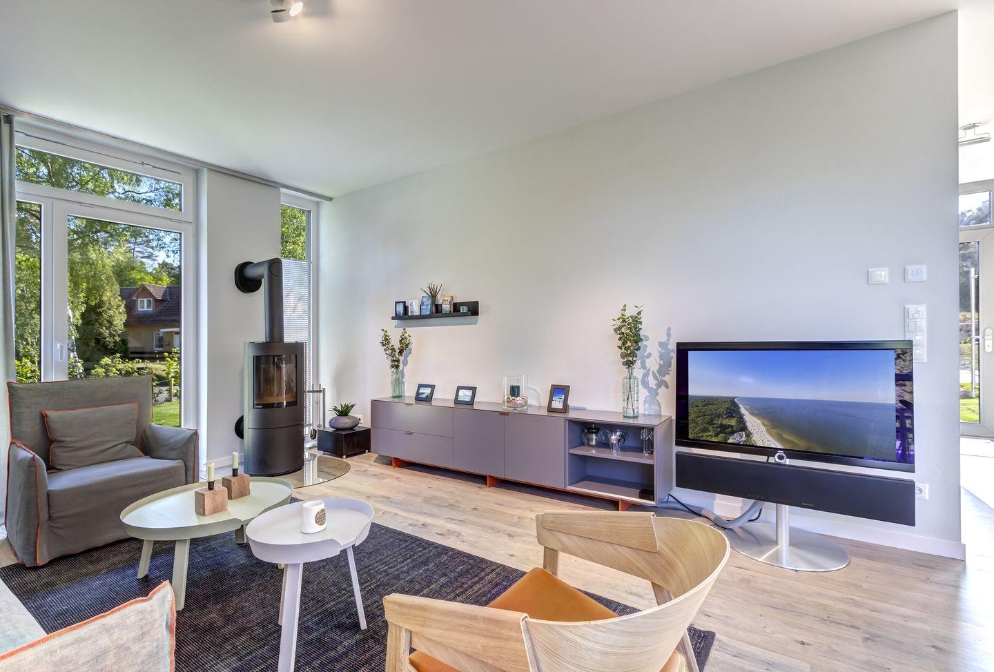 Im Obergeschoss sind ein Gäste-WC, zwei Schlafzimmer mit Möller Design Betten und Flat- TV sowie ein großes Wellness-Bad mit abgetrennten WC, Sauna und Walk-In-Dusche zu finden. Der angrenzende Relax-Bereich mit Leseecke und toller Aussicht lädt zum Verweilen und Entspannen ein.
