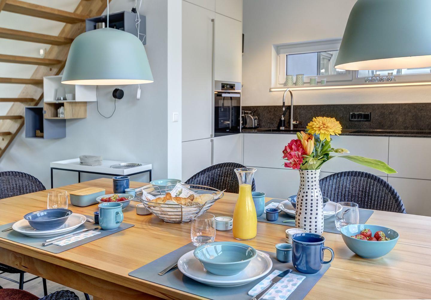 Farblich haben wir im Innern viele Grün- und Türkis-Töne gewählt, die sofort ein Urlaubsgefühl am Meer vermitteln. Das EG ist aufgrund von bodentiefem Fenster mit Tageslicht durchflutet.