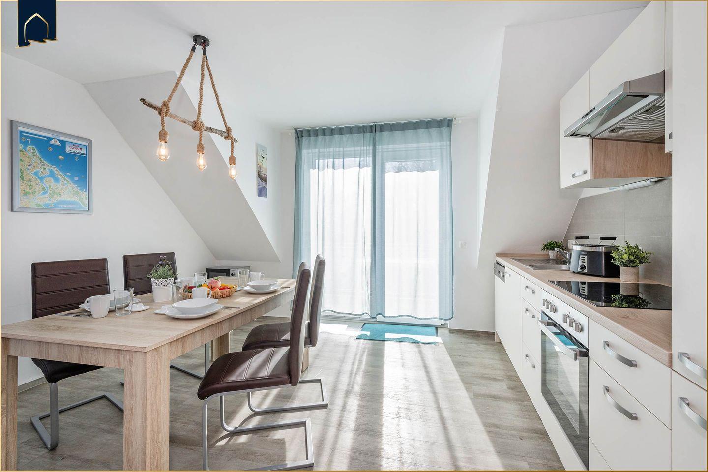 Die Ferienwohnung verfügt über zwei gemütliche Schlafzimmer, ein modernes Badezimmer mit Dusche sowie einen offenen Wohn- und Essbereich. Die voll ausgestattete Küche mit Backofen, Herd, Kühlschrank, Gefrierfach, Spülmaschine, Mikrowelle, Wasserkocher, Kaffeemaschine und Toaster lässt keine Wünsche offen. Für Unterhaltung sorgen zwei Fernseher mit internationalen Programmen, ein DVD-Player, Radio sowie Bücher und Spiele. Dank WLAN, Fußbodenheizung und Insektenschutz an den Fenstern genießen Sie höchsten Komfort zu jeder Jahreszeit.