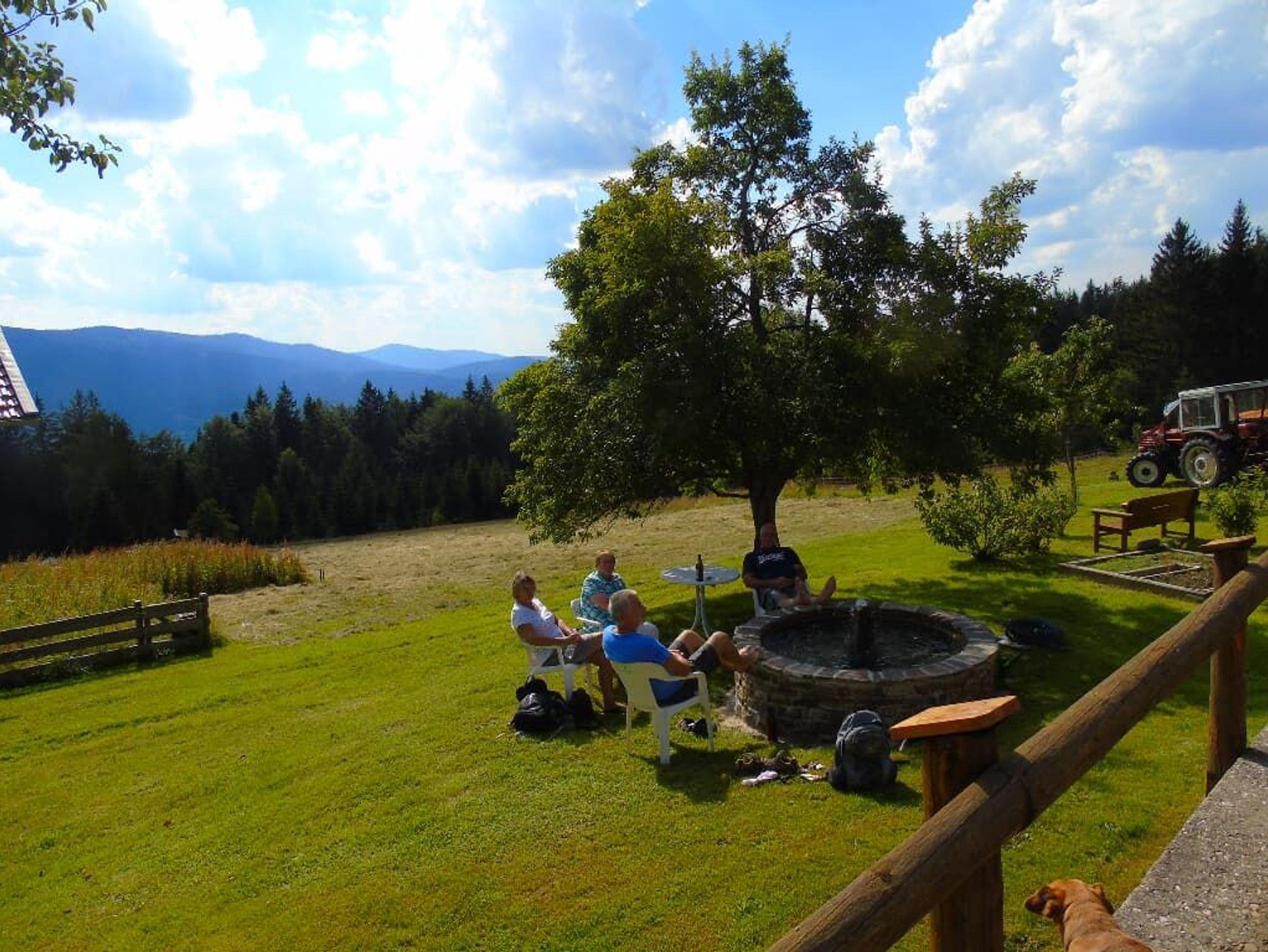 Ausblick - Wohnung Süd/West - Fernblick und Garten mit Brunnen, Sitzgarnitur und Liegewiese Rodelmöglichkeit im Winter am Haus - Rodel/Schlitten und Schneeschuhe können kostenlos ausgeliehen werden