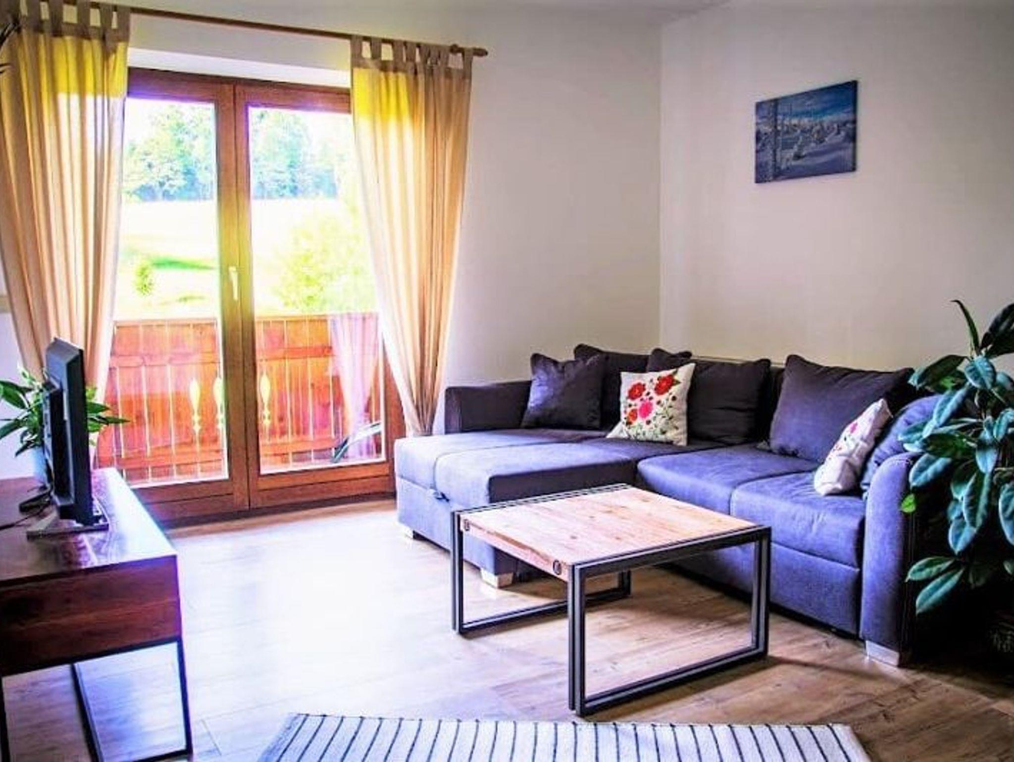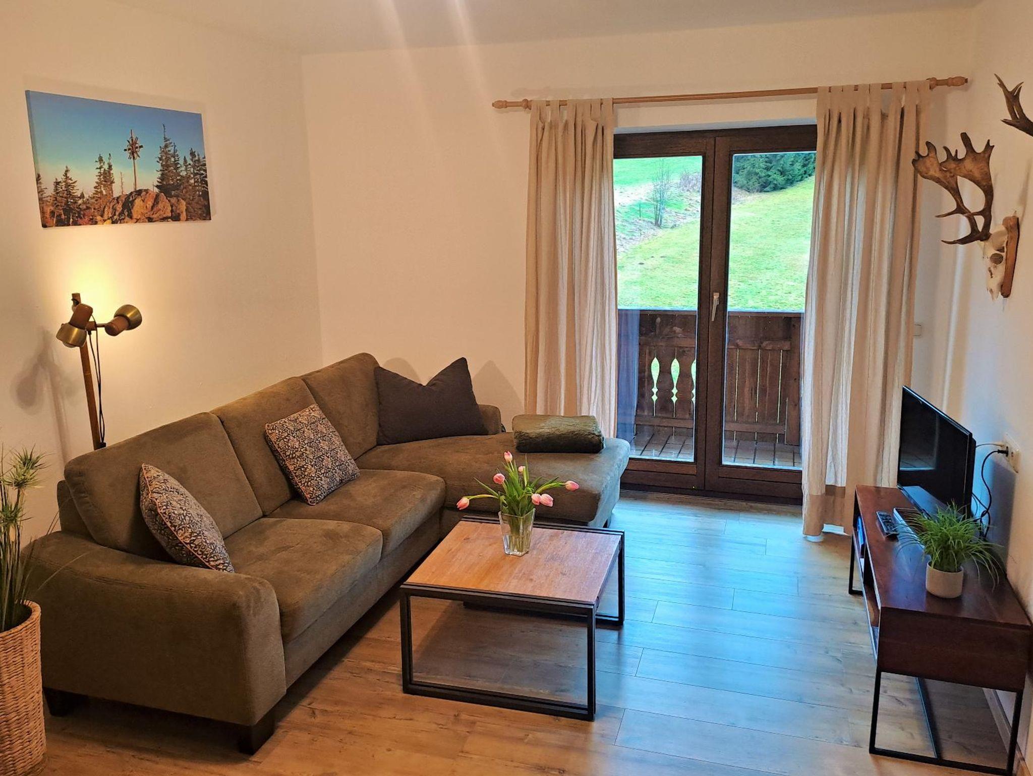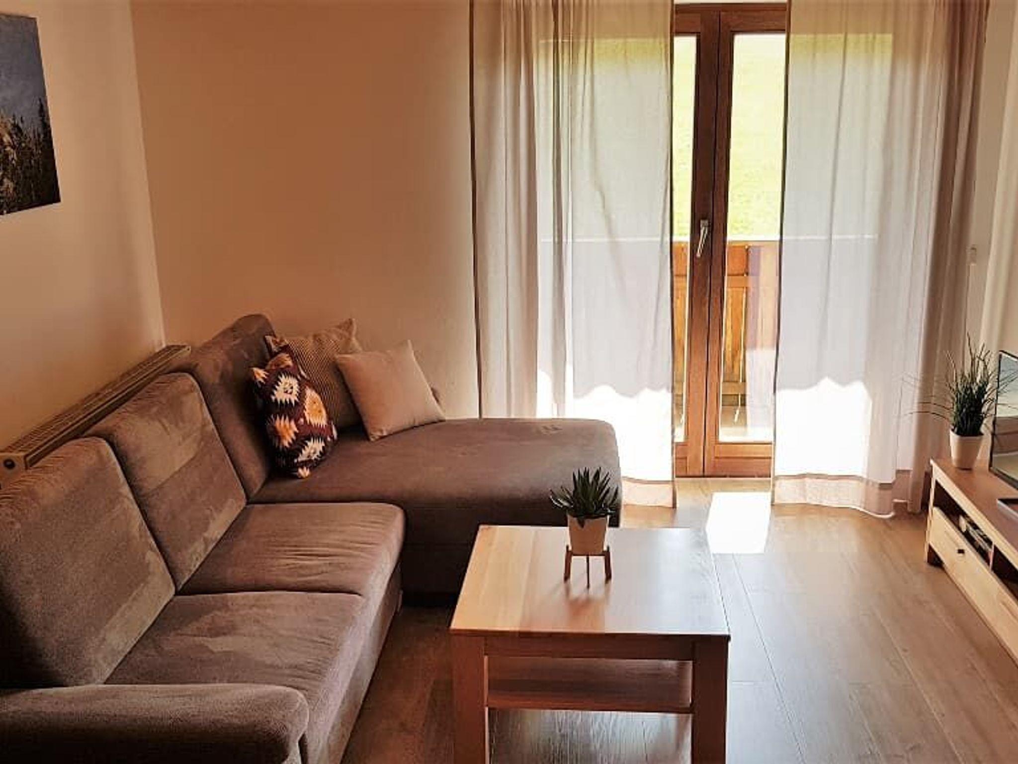 Das helle Wohnzimmer mit großem gemütlichen Sofa, Flachbild-TV und Zugang zum Südbalkon lädt zum Verweilen ein.