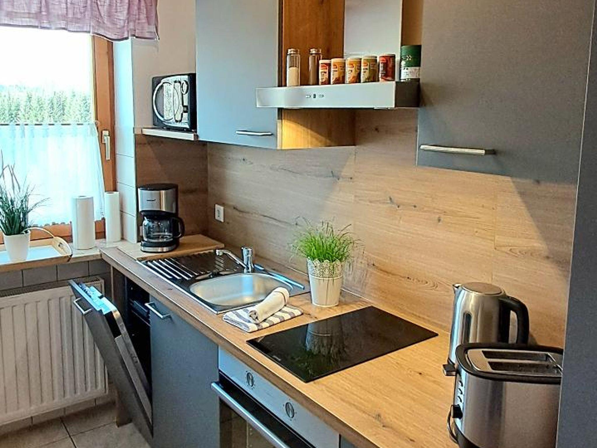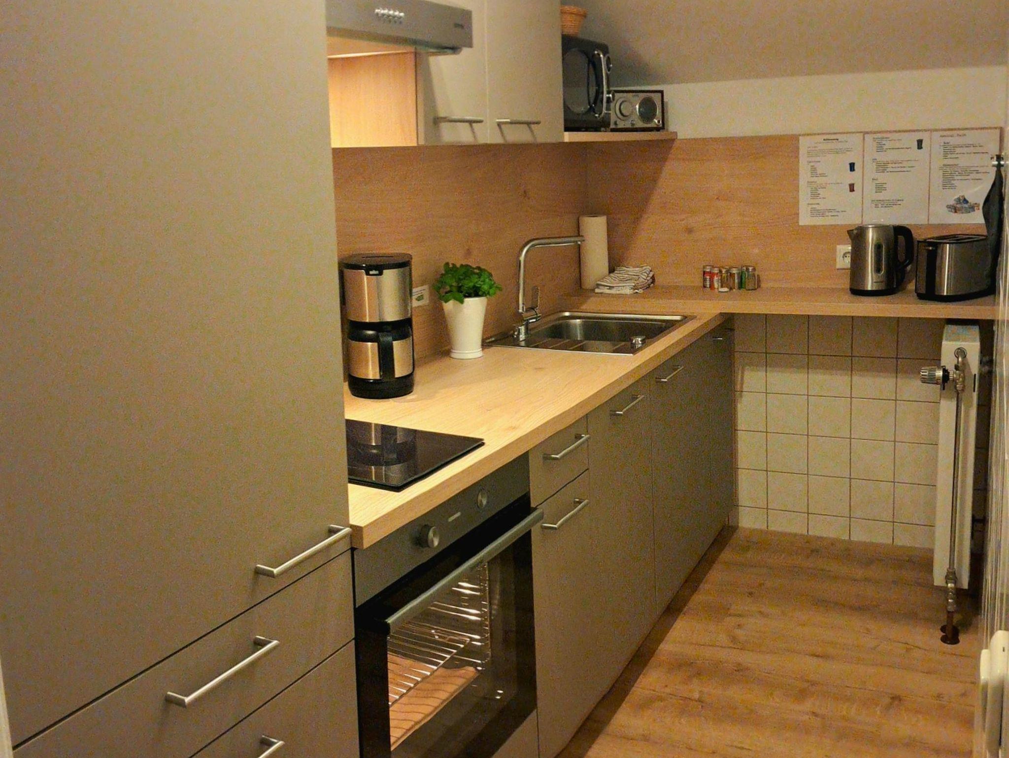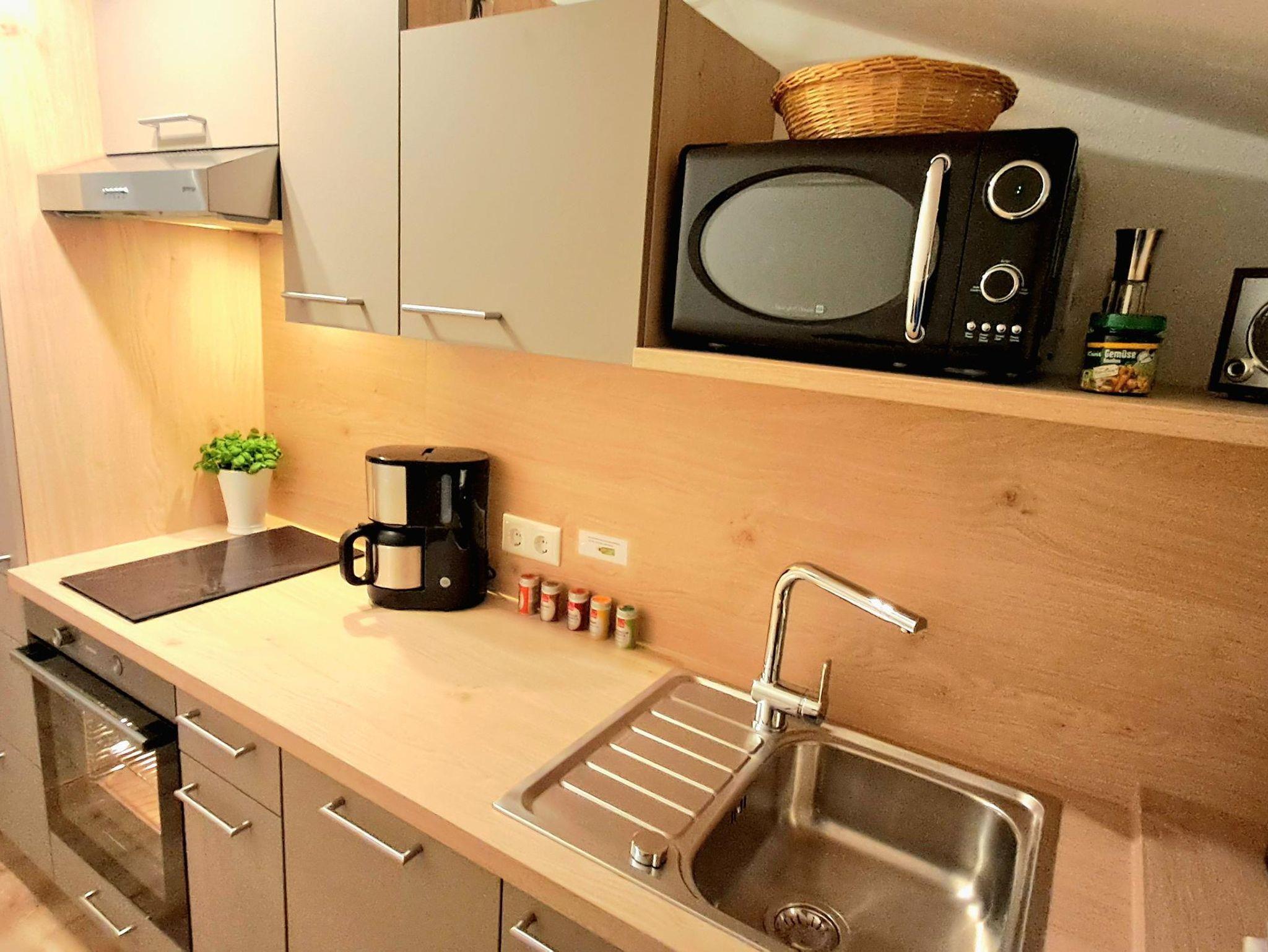 Die komplett ausgestattete Küche mit Kühlschrank inkl. Gefrierfach, Herd mit 2 Ceranfelder, Backofen, Geschirrspülmaschine, Mikrowelle, Dunstabzug, Wasserkocher, Toaster und Kaffeemaschine lässt keine Wünsche offen.