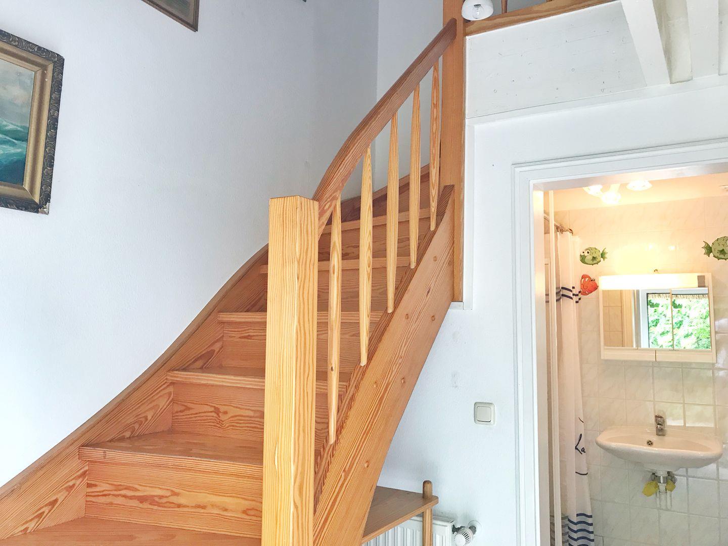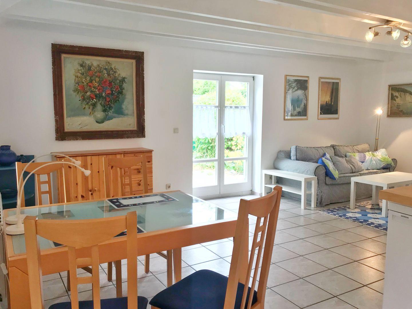 Die kleine reetgedeckte Doppelhaushälfte hat eine Größe von ca. 50 qm und verfügt über Schlafgelegenheiten für bis zu 4 Personen. Sie betreten das Haus über einen separaen Eingang und gelangen in die Diele. Über eine Holztreppe erreichen Sie das Schlafzimmer im Dachgeschoss, welches mit einem Doppelbett ausgestattet ist. Im Ergeschoss des charmanten Doppelhauses finden Sie das Badezimmer mit ebenerdiger Dusche sowie den großzügigen Wohn- und Essbereich. Dieser verfügt über eine offene Wohnküche mit Esstisch sowie über ein gemütliches Sofa mit Couchtisch und Flachbildernseher. Das Sofa kann ausgeklappt werden und somit als Schlafmöglichkeit für die 3. und 4. Person dienen. Über den Wohnbereich gelangen Sie auf die Terrasse mit kleinem Grundstücksanteil und Sitzmöbeln. Hier befindet sich auch ein kleiner Schuppen für Ihre mitgebrachten Fahrräder.