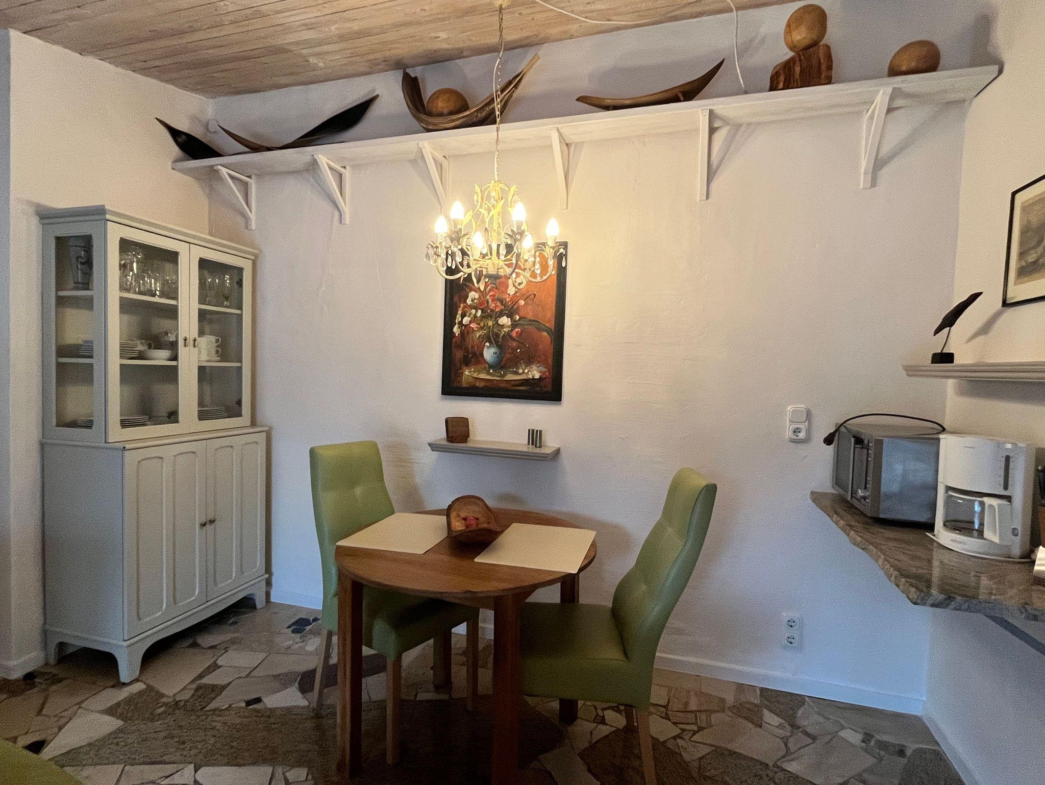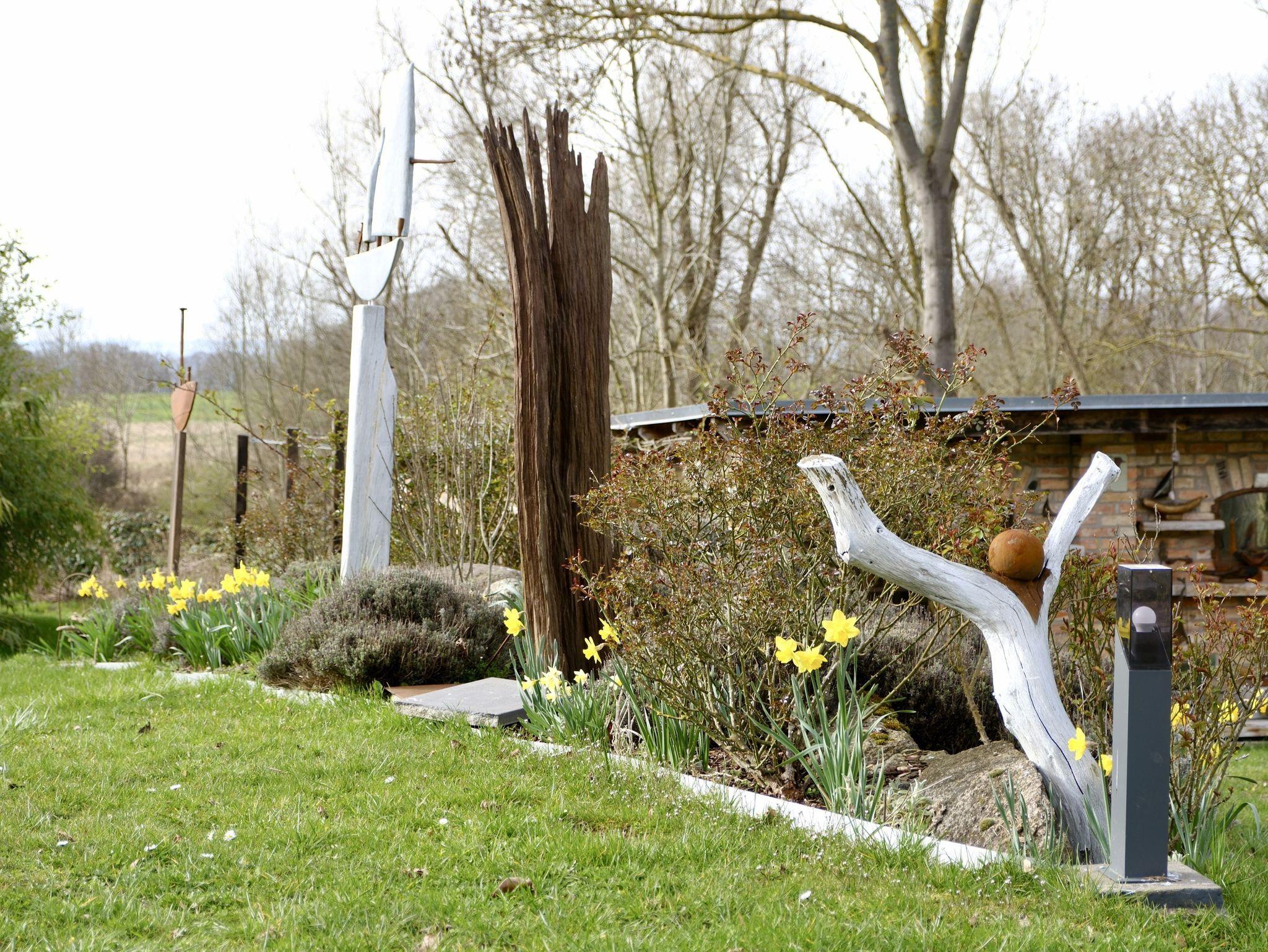 Zu jeder Wohnung gehört eine Außenterrasse mit Gartenmöbeln, Sonnenschirm und Grillmöglichkeit. Darüber hinaus finden Sie bei uns einen großen Natur- und Nutzgarten, in dem Sie neben vielfältig angelegten Beeten auch noch Wegrandblumen und Heilpflanzen sowie verschiedene Ruhezonen mit Sitzgruppen und Liegen zum Entspannen finden. Manchmal ganz offensichtlich, bisweilen recht versteckt können Sie im Garten Kunstobjekte des Hausherren entdecken und bei Gefallen käuflich erwerben.