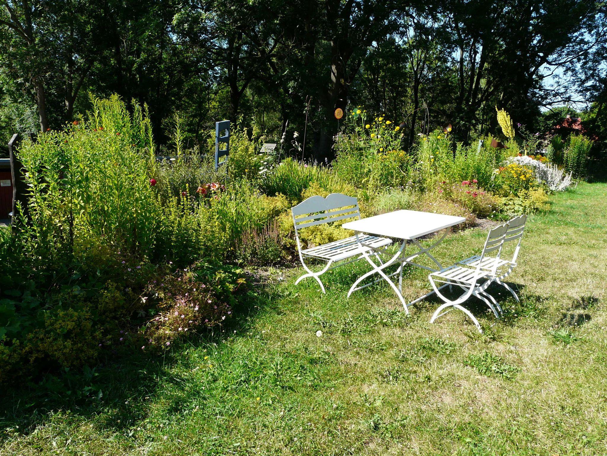 Zu jeder Wohnung gehört eine Außenterrasse mit Gartenmöbeln, Sonnenschirm und Grillmöglichkeit. Darüber hinaus finden Sie bei uns einen großen Natur- und Nutzgarten, in dem Sie neben vielfältig angelegten Beeten auch noch Wegrandblumen und Heilpflanzen sowie verschiedene Ruhezonen mit Sitzgruppen und Liegen zum Entspannen finden. Manchmal ganz offensichtlich, bisweilen recht versteckt können Sie im Garten Kunstobjekte des Hausherren entdecken und bei Gefallen käuflich erwerben.