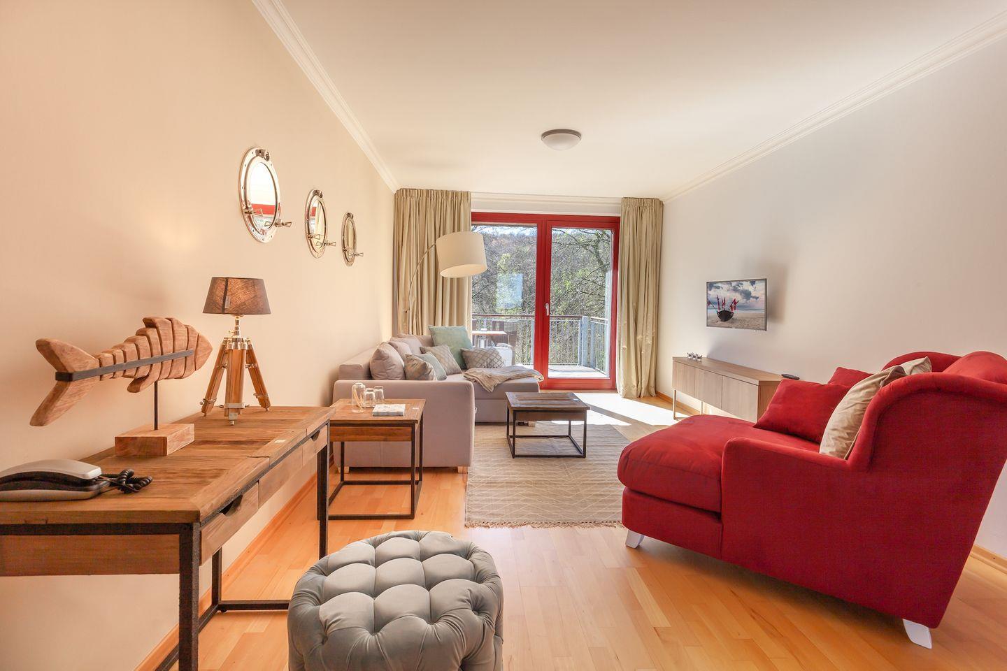 Die moderne 2-Raum Ferienwohnung besticht durch seine offene und lichtdurchflutete Raumgestaltung. Unbezahlbar die exquisite Lage und der Ausblick auf Meer und Natur. Die Wohnung bietet komfortabel Platz für 4 Personen. Sie besteht aus 2 Zimmern, einer offenen Küche, einem hellen, großen Wohnbereich mit Flatscreen-TV, einer gemütlichen Essecke. Vom gemütlichen Wohn-Esszimmer mit offener Küche gelangt man auf den Balkon zur Parkseite. Von der Küche aus zu dem kleinen Balkon mit Blick Richtung Ostsee und Golfplatz. Der Wohnbereich ist hell gehalten, gemütlich und modern eingerichtet. Hier gibt es eine ausziehbare Schlafcouch für 2 Personen (2m x 1,40m). Die Einbauküche verfügt über Geschirrspüler, Herd, Backofen, Kühlschrank mit Gefrierfach, Wasserkocher, Kaffeemaschine, Toaster und zahlreiche Küchenutensilien. Das Schlafzimmer verfügt über ein Doppelbett und großem Schrank. Das helle und großzügige Fenster-Duschbad mit WC wurde ergänzt mit Haartrockner und Kosmetikspiegel. Auf beiden Balkonen gibt es Gartenmöbel. Im Flur finden Sie einen separaten Abstellraum für Ihr Gepäck.