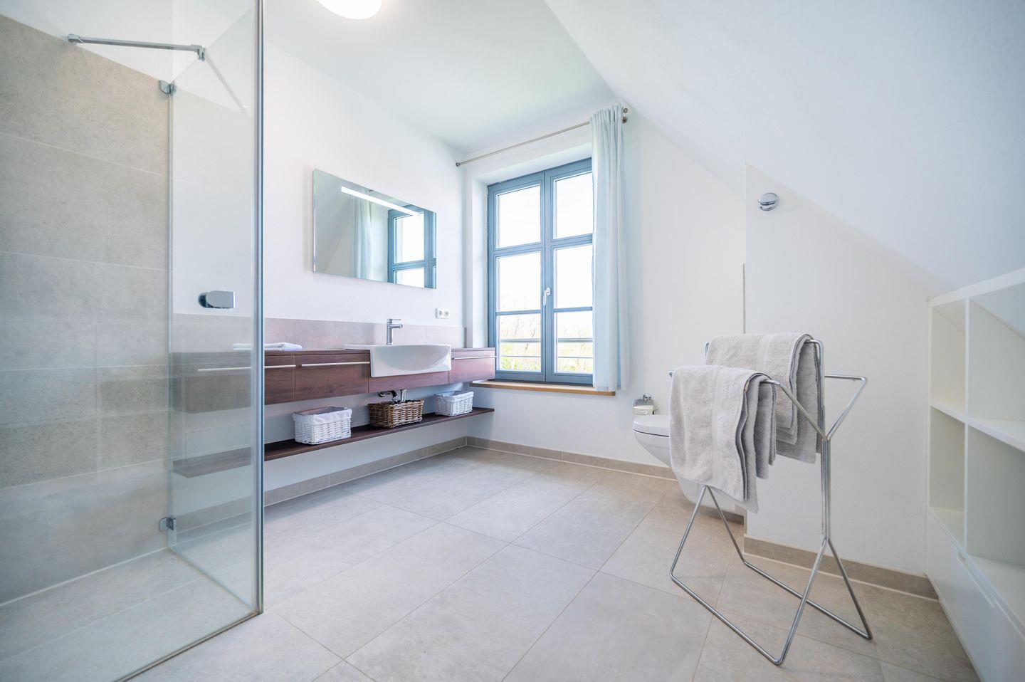 Ein modernes Duschbad mit Toilette im Erdgeschoss. Ein weiteres lichtdurchflutetes modernes Duschbad mit Toilette im Obergeschoss.