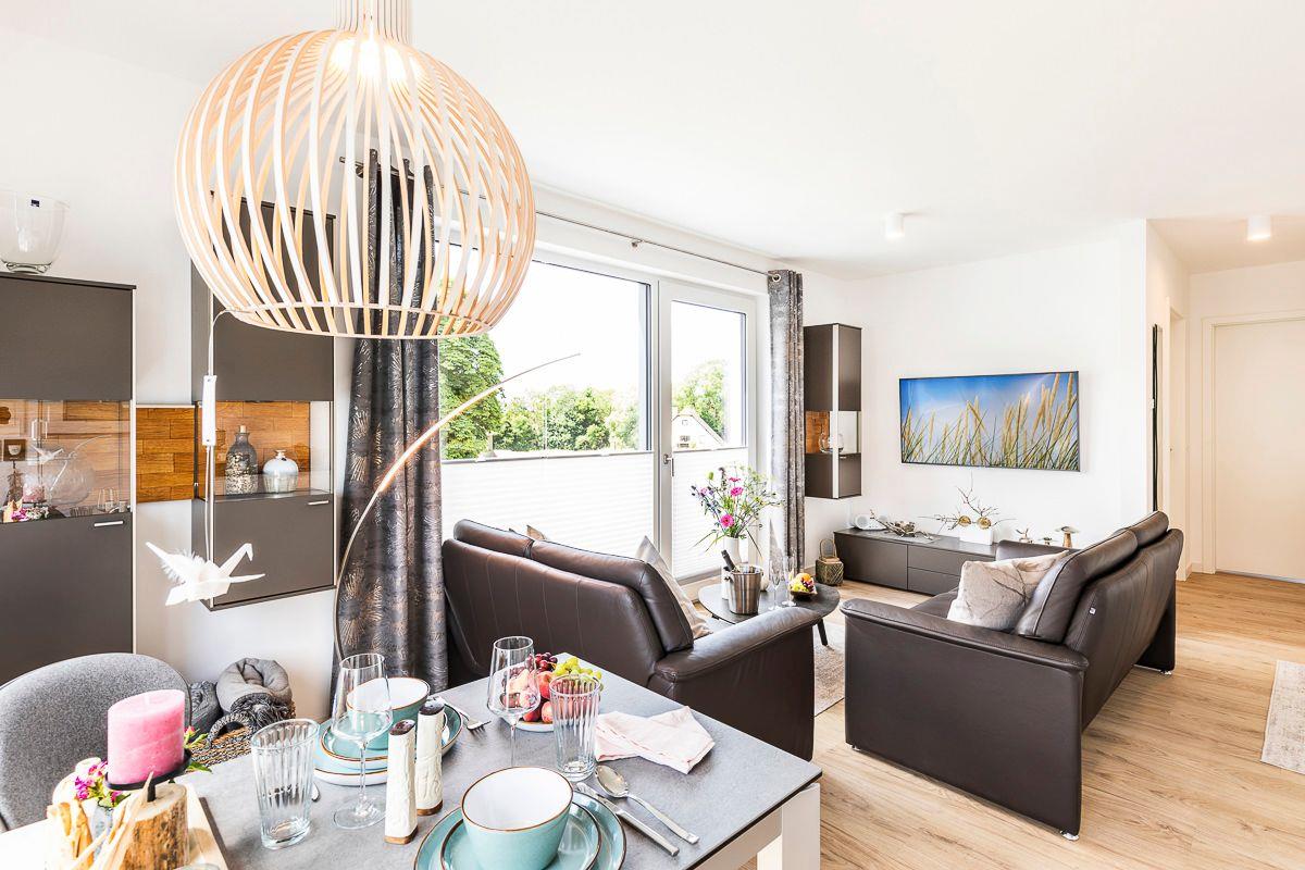 Das gesamte Appartement ist mit hochwertigem, hellem Laminat ausgelegt und verfügt über eine Fußbodenheizung. Im modern ausgestatteten, lichtdurchfluteten Wohn- und Esszimmer erwarten Sie eine gemütliche Leder-Sitzecke bestehend aus einer 2- und einer 3-Sitzer-Couch.