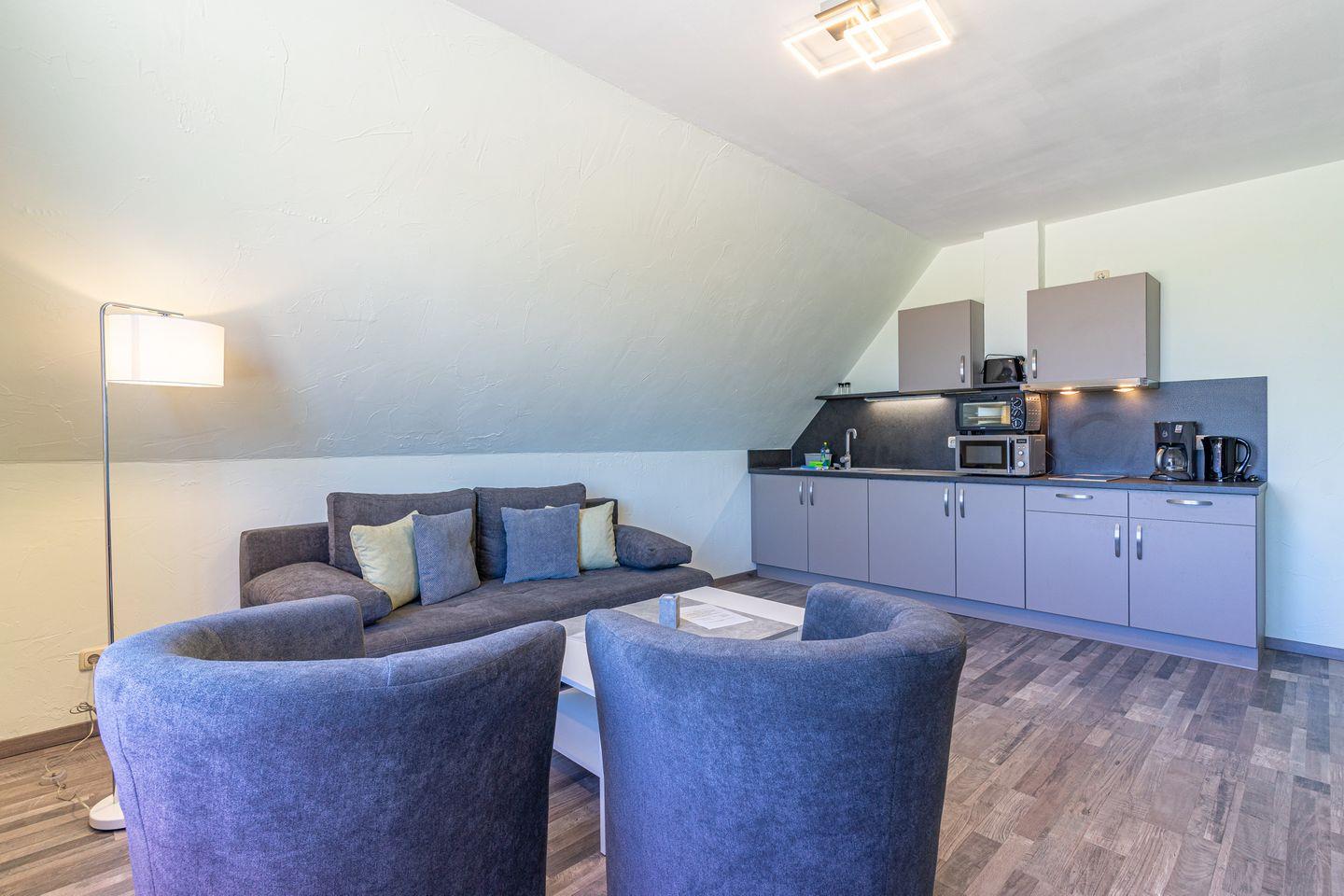Der Wohnbereich ist praktisch und komfortabel gestaltet: Sofa, Sessel, Esstisch sowie TV und Internet/WLAN stehen Ihnen zur Verfügung. Eine Garderobe sorgt für Ordnung, ein Wäscheständer ist ebenfalls vorhanden. Die offene Küche zum Wohnzimmer ist mit Herd (2-Platten), Mini-Backofen, Kühlschrank, Mikrowelle, Kaffeemaschine, Wasserkocher und Toaster ausgestattet; Abfalleimer und Geschirrhandtücher sind vorhanden. Bettwäsche, Handtücher und eine Erstausstattung sind inklusive, sodass Sie entspannt anreisen können. Das Badezimmer verfügt über Dusche, WC, Waschbecken, Spiegel, Fenster und warmes Wasser.