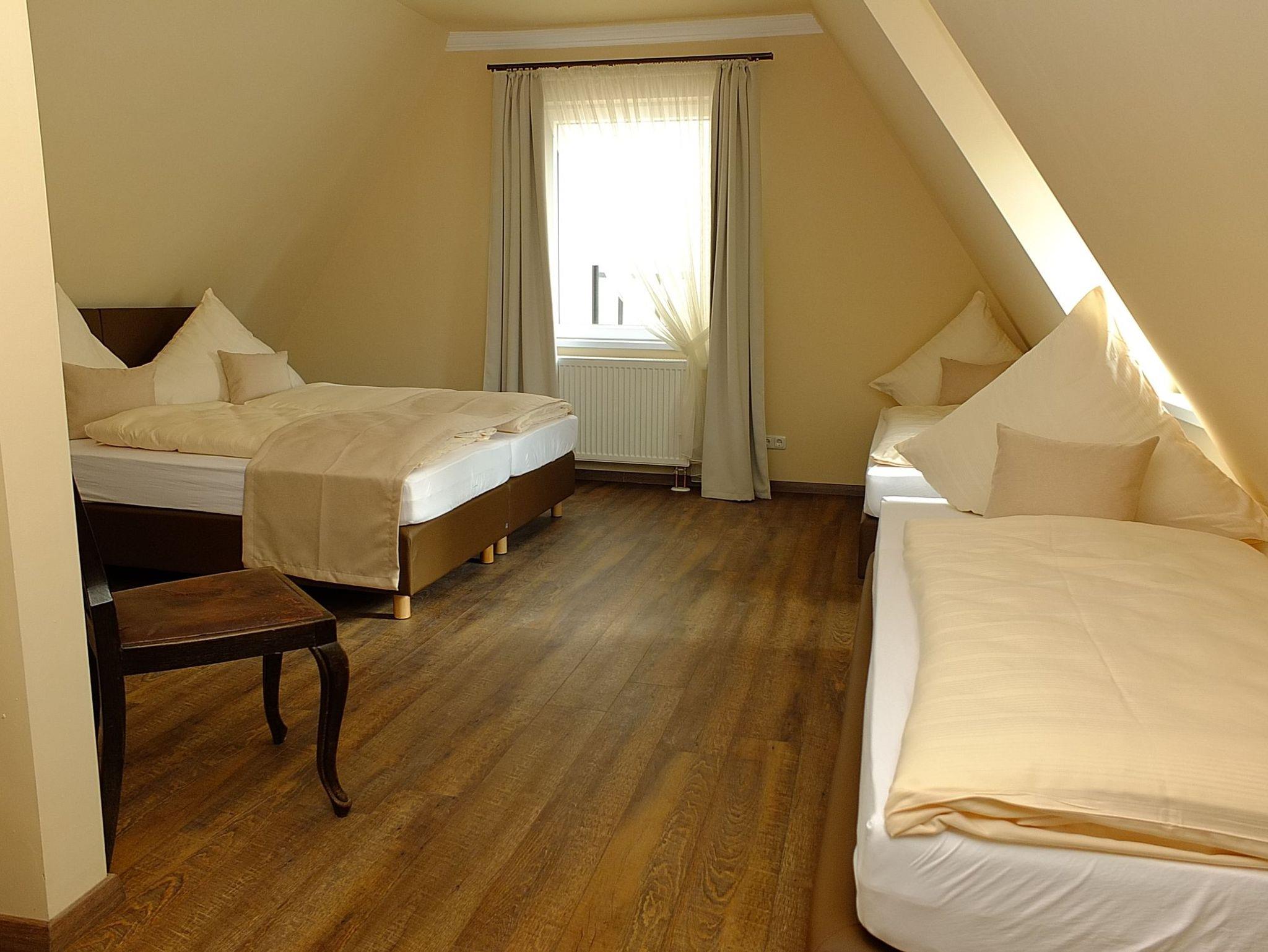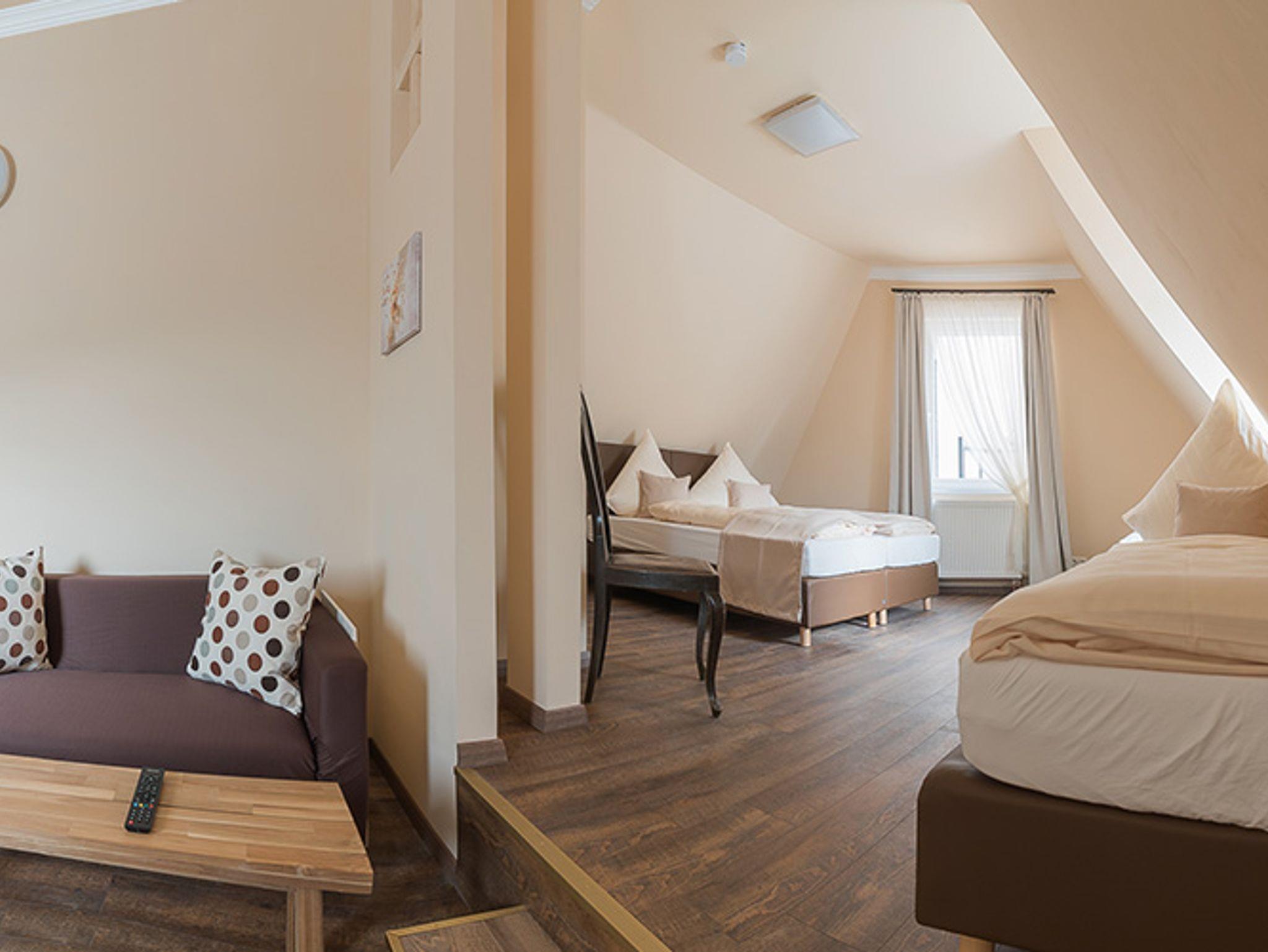 Unsere allergikergeeignetes Nichtraucher- Familienzimmer verfügt über eine geschmackvolle Einrichtung. Es besteht aus einem freundlichen Schlafraum mit einem Doppelbett und zwei Einzelbetten, einem seperaten Wohnbereich und einem modern eingerichteten Badezimmer. Egal ob Sie das Familienzimmer als Paar oder als Familie nutzen möchten, hier kommt jeder auf seine Kosten. Denn wir bieten Hotelbetten mit orthopädischen Qualitätsmatratzen, Allergikerbettwäsche, kostenfreies WLAN, einen kostenlosen Prakplatz und vieles mehr.