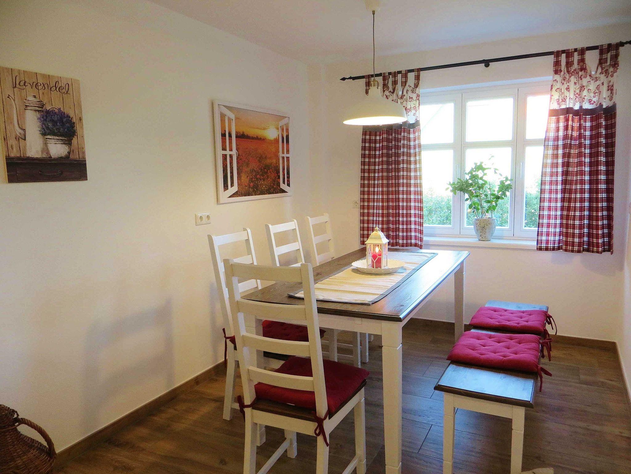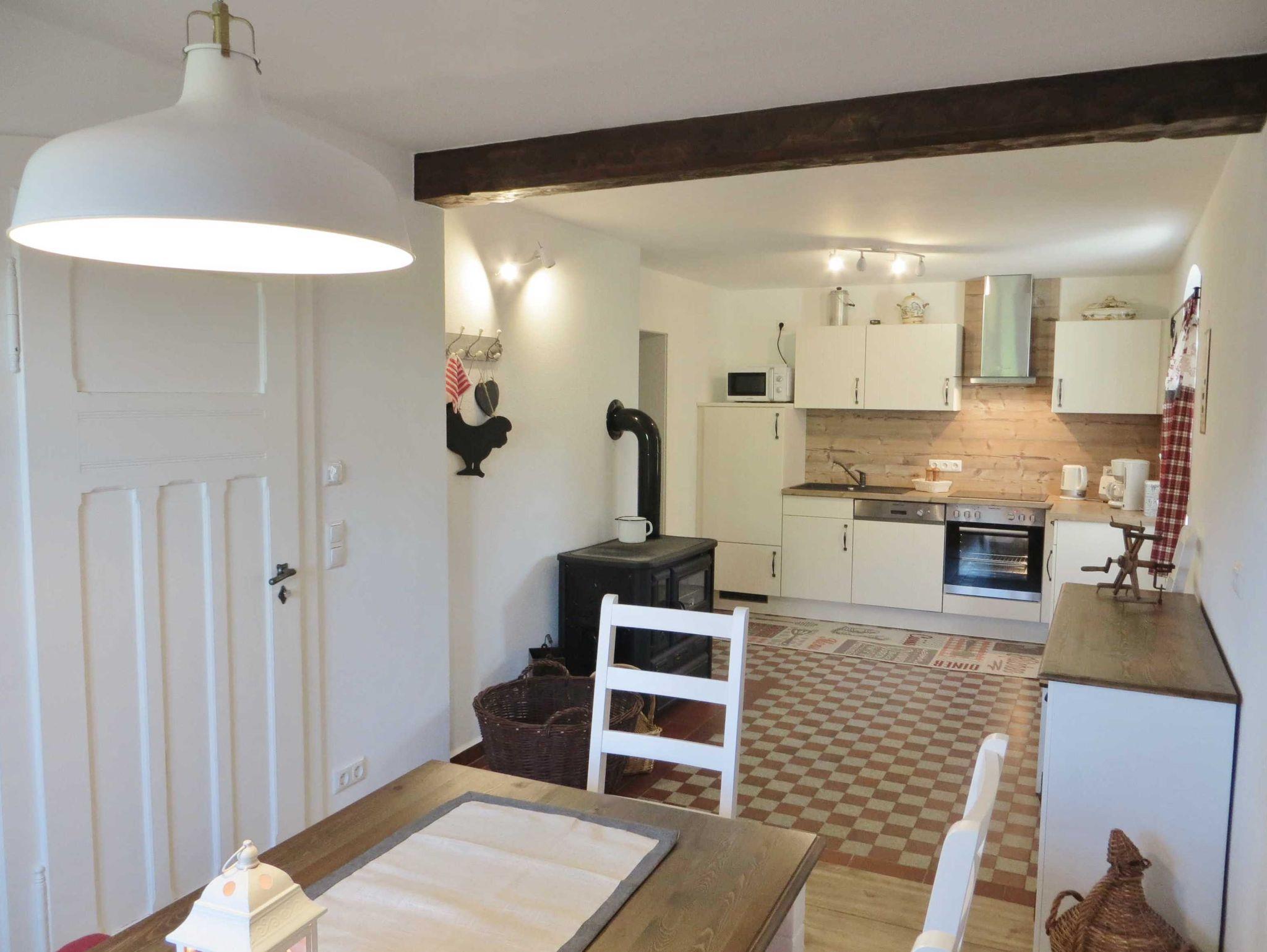 In der separaten Küche befinden sich eine komplette Einbauküche (Herd mit Ceranfeld, Geschirrspüler, Kühl- und Gefrierkombi, Mikrowelle), ein freistehender Küchenofen im Landhausstil und ein gemütlicher Essbereich.