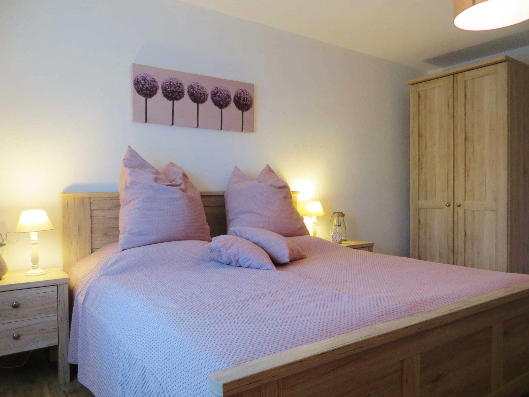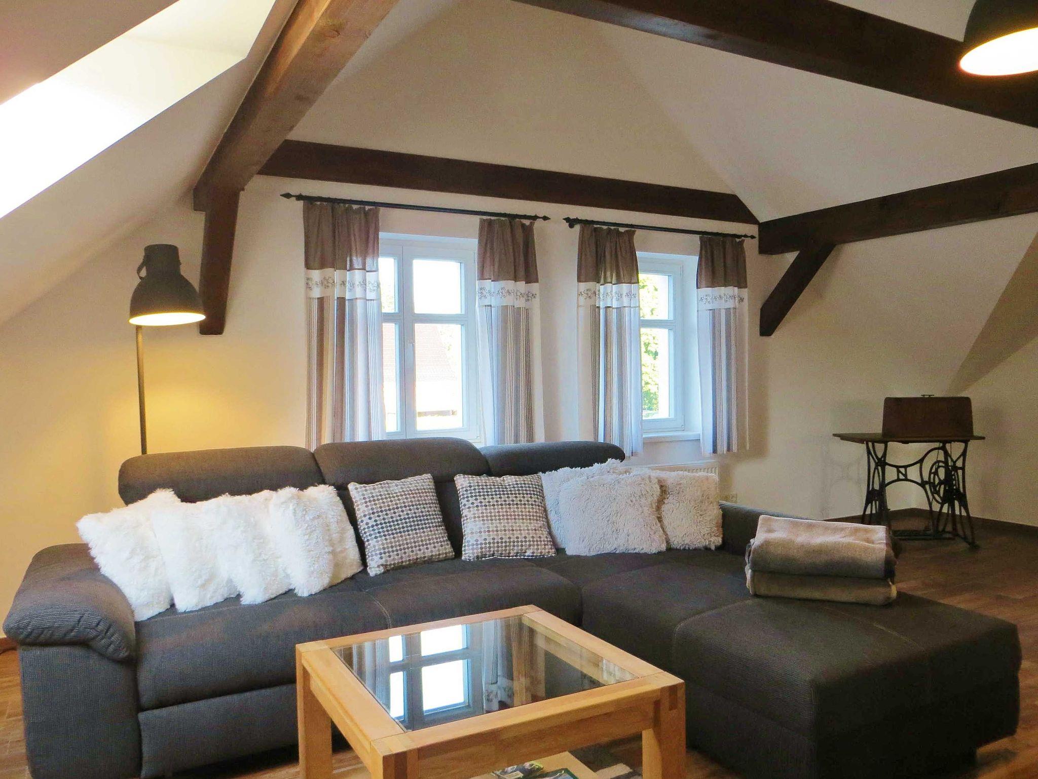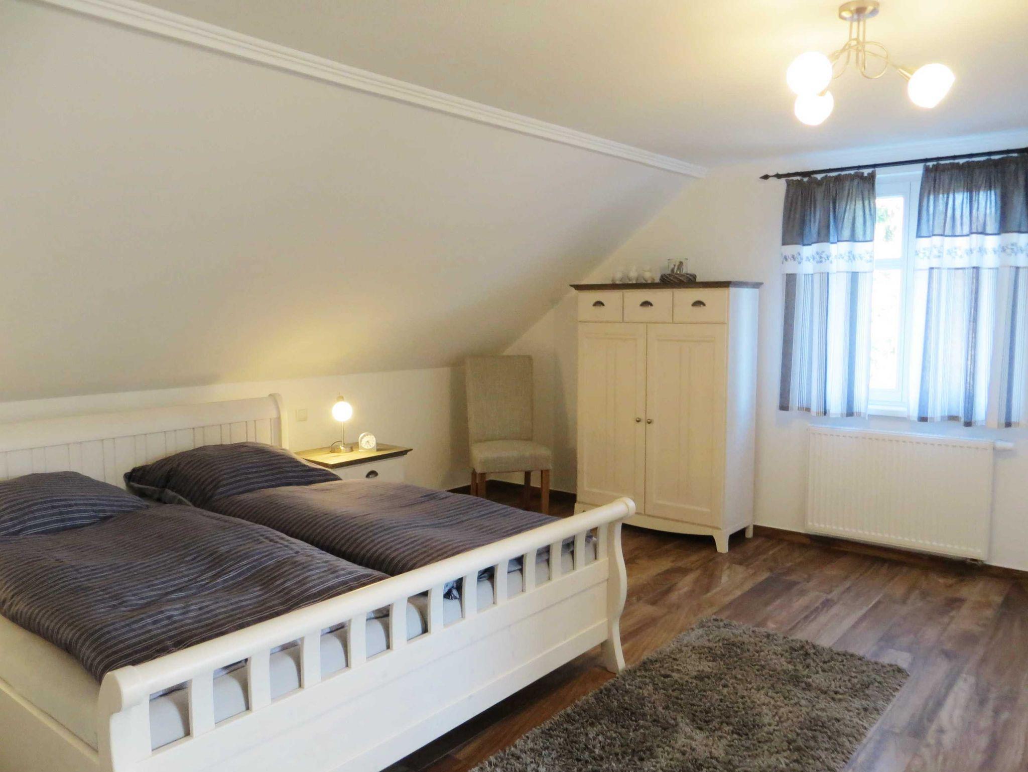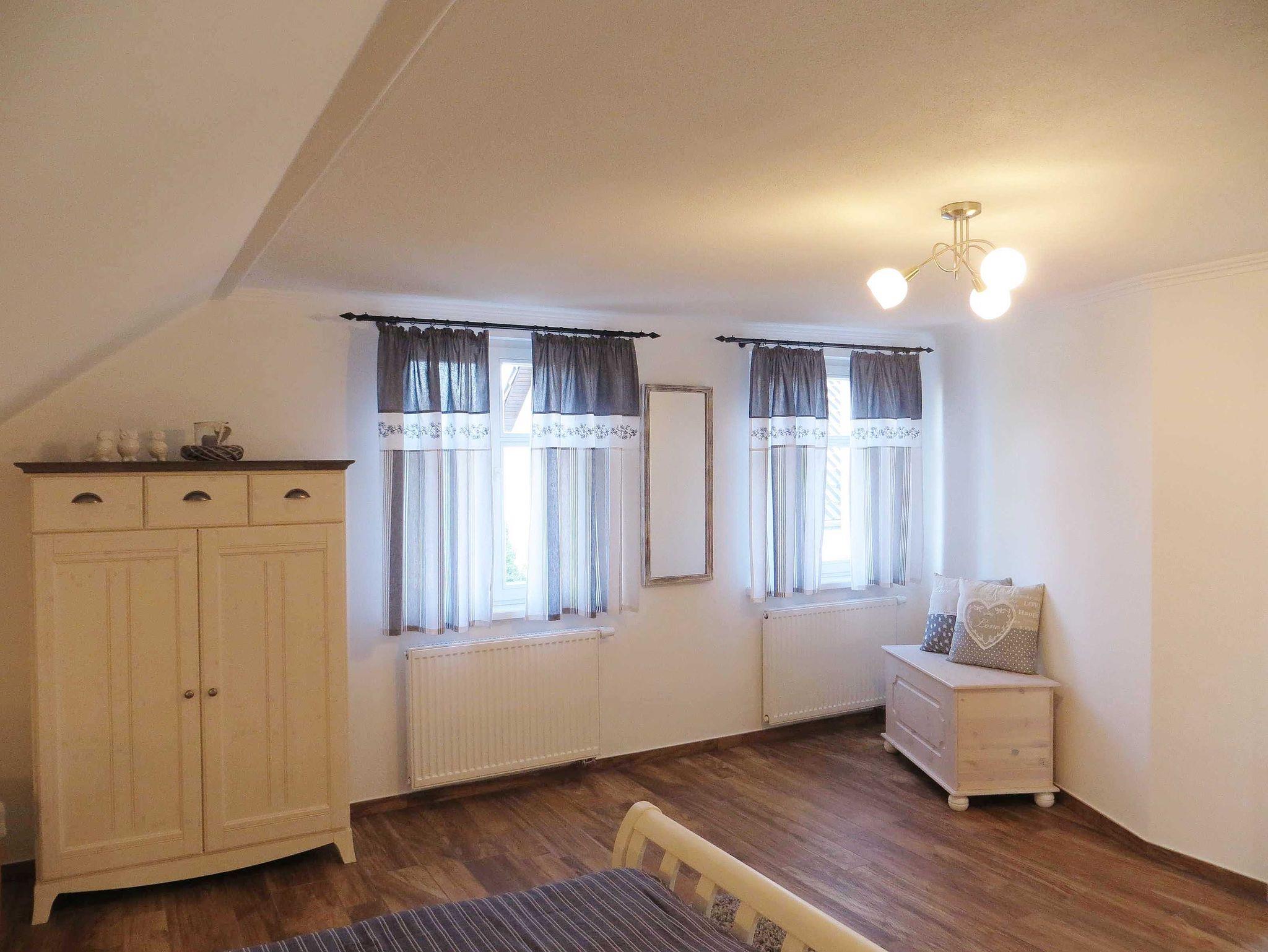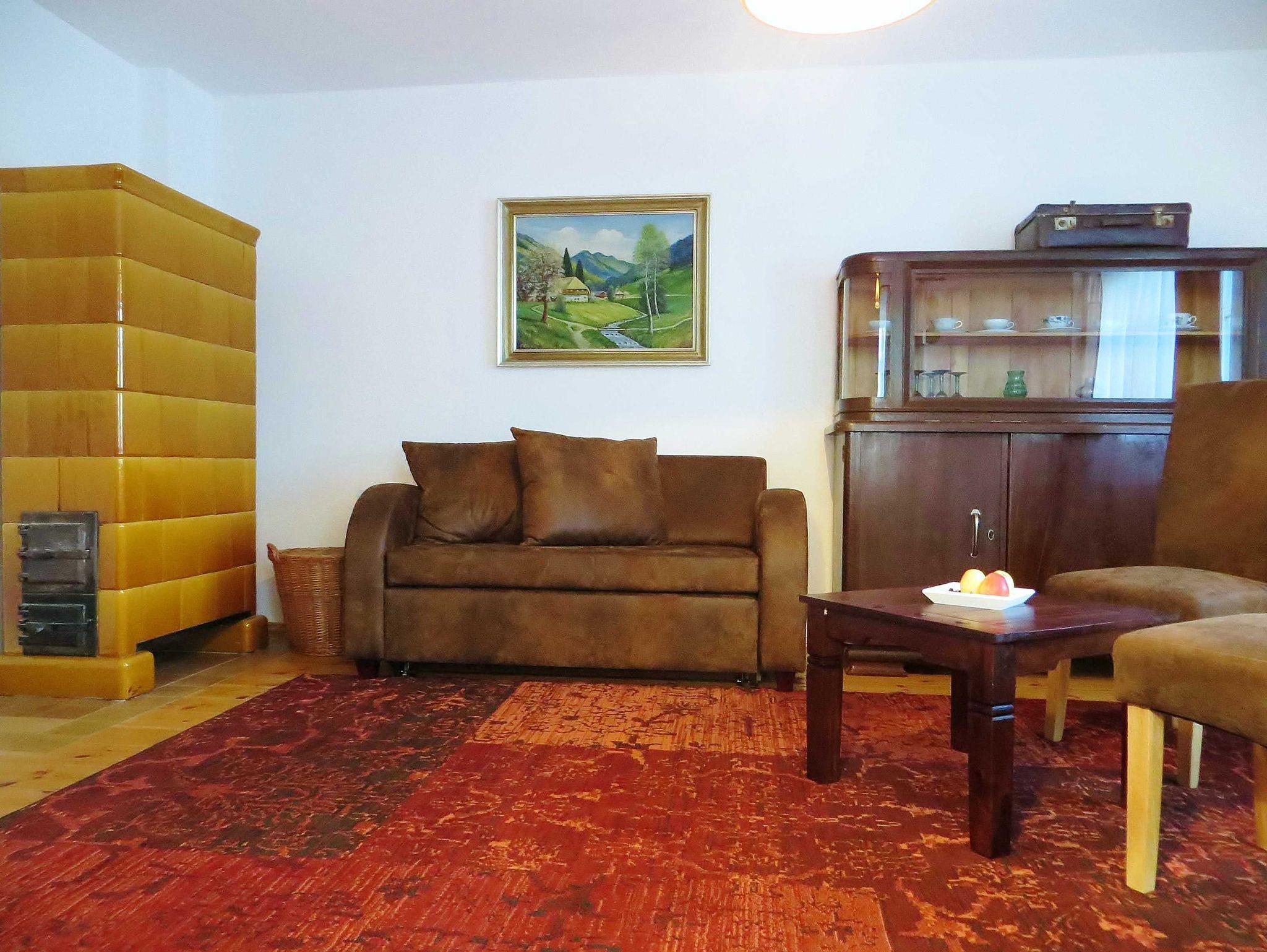 Im Erdgeschoss ist das Wohnzimmer im rustikalen Landhausstil mit Einzelbett (1,90 m lang), Schlafcouch, TV und altem Kachelofen eingerichtet. Das im modernen Landhausstil gehaltene Schlafzimmer ist mit Doppelbett (hochwertigen Matratzen), Flat-TV und altem Kachelofen ausgestattet.
