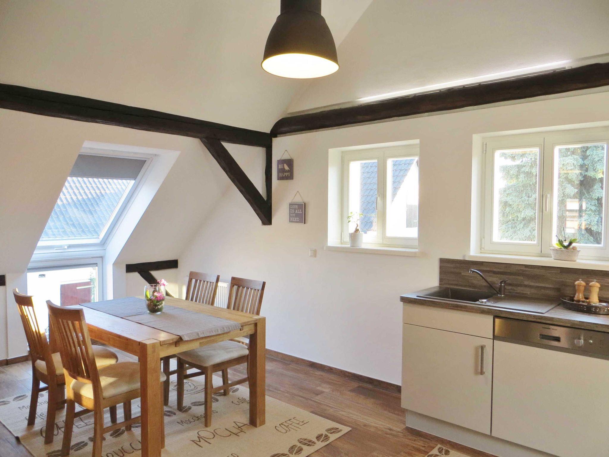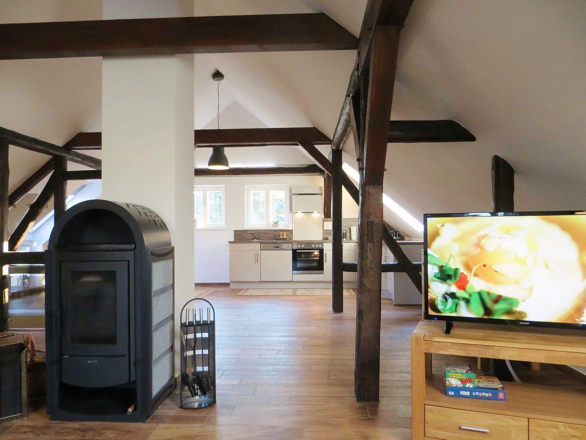 Der Wohn-und Essbereich im Dachgeschoß sind großzügig und offen gestaltet. Hier finden Sie eine voll ausgestattete Einbauküche mit Herd (Ceranfeld), Geschirrspüler, Kühl-und Gefrierkombi sowie einen Essbereich mit Tisch und Stühlen. Weiterhin ist der Wohnbereich mit einer gemütlichen Schlafcouch(1,35 x 2,25 m), Flat-TV und einem Kaminofen eingerichtet.