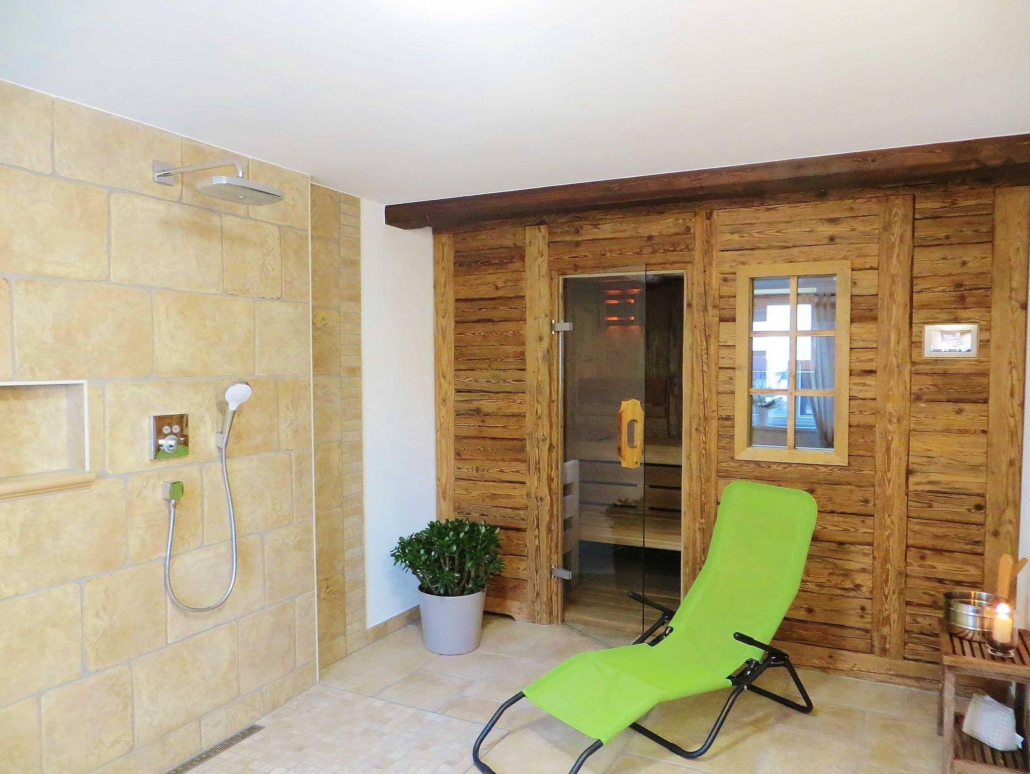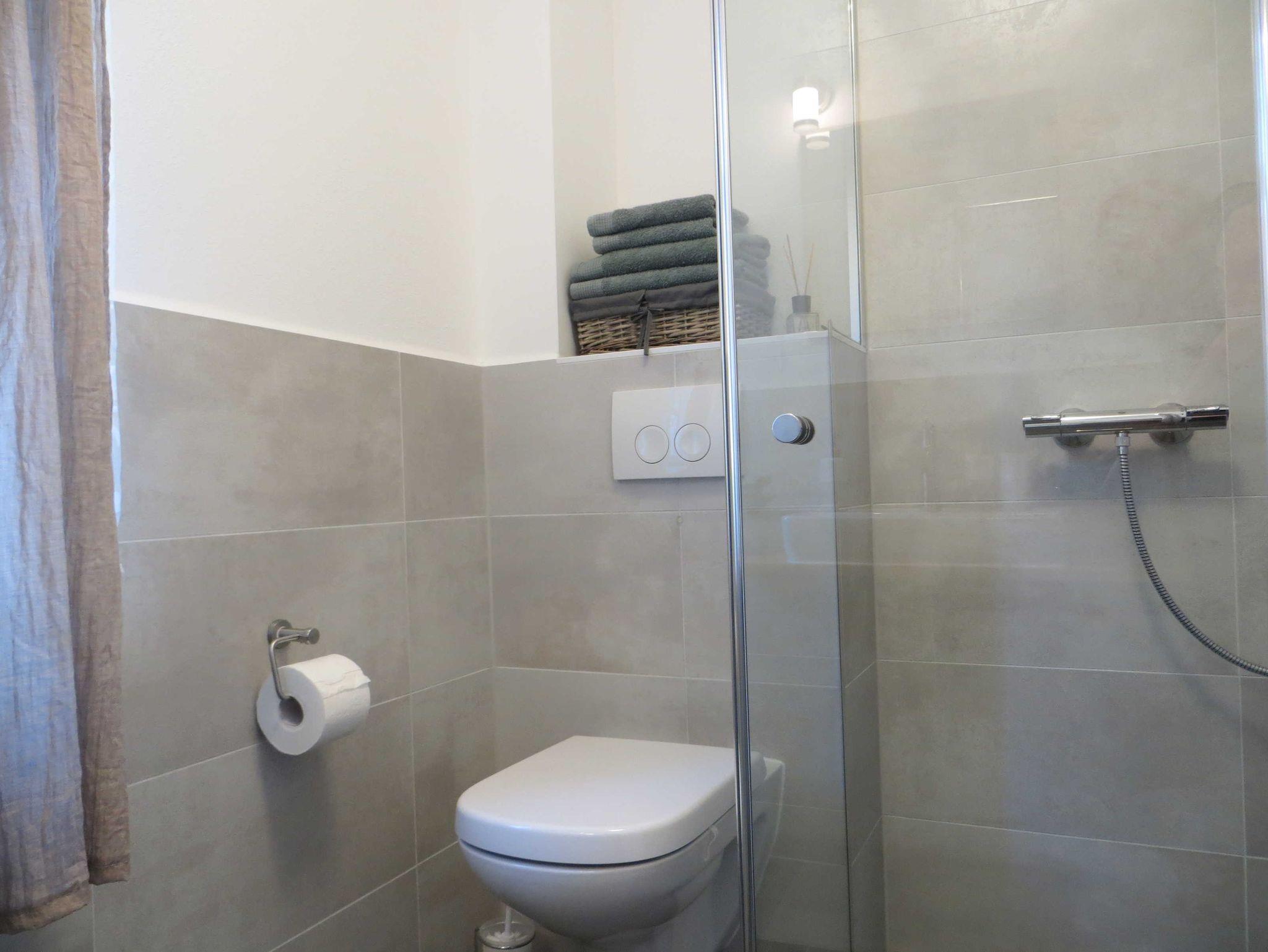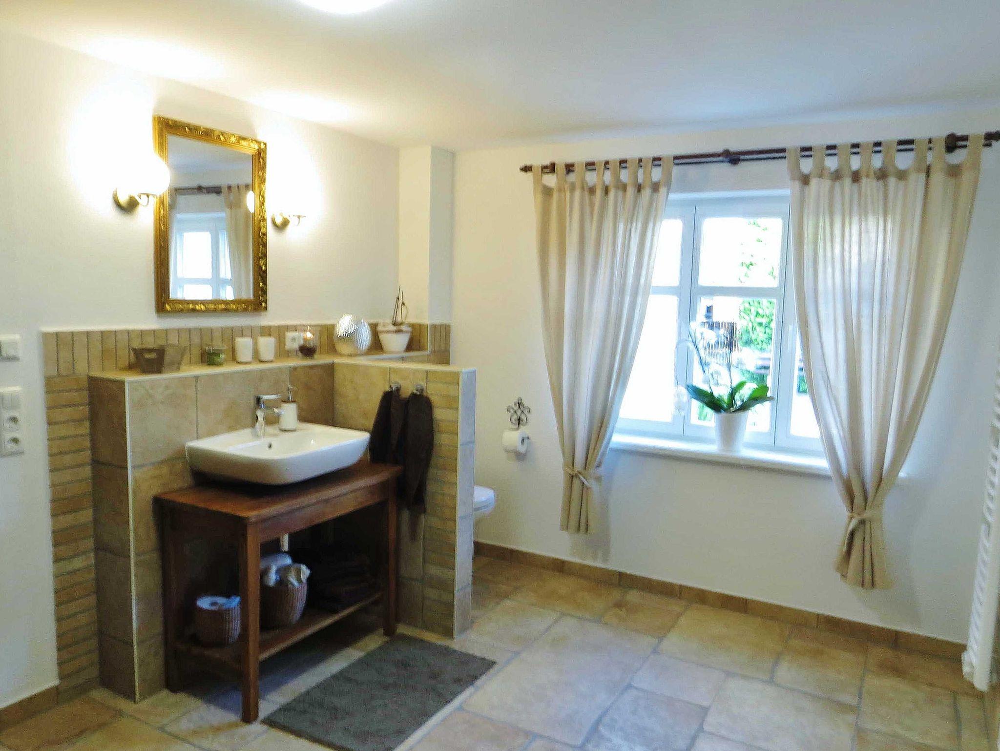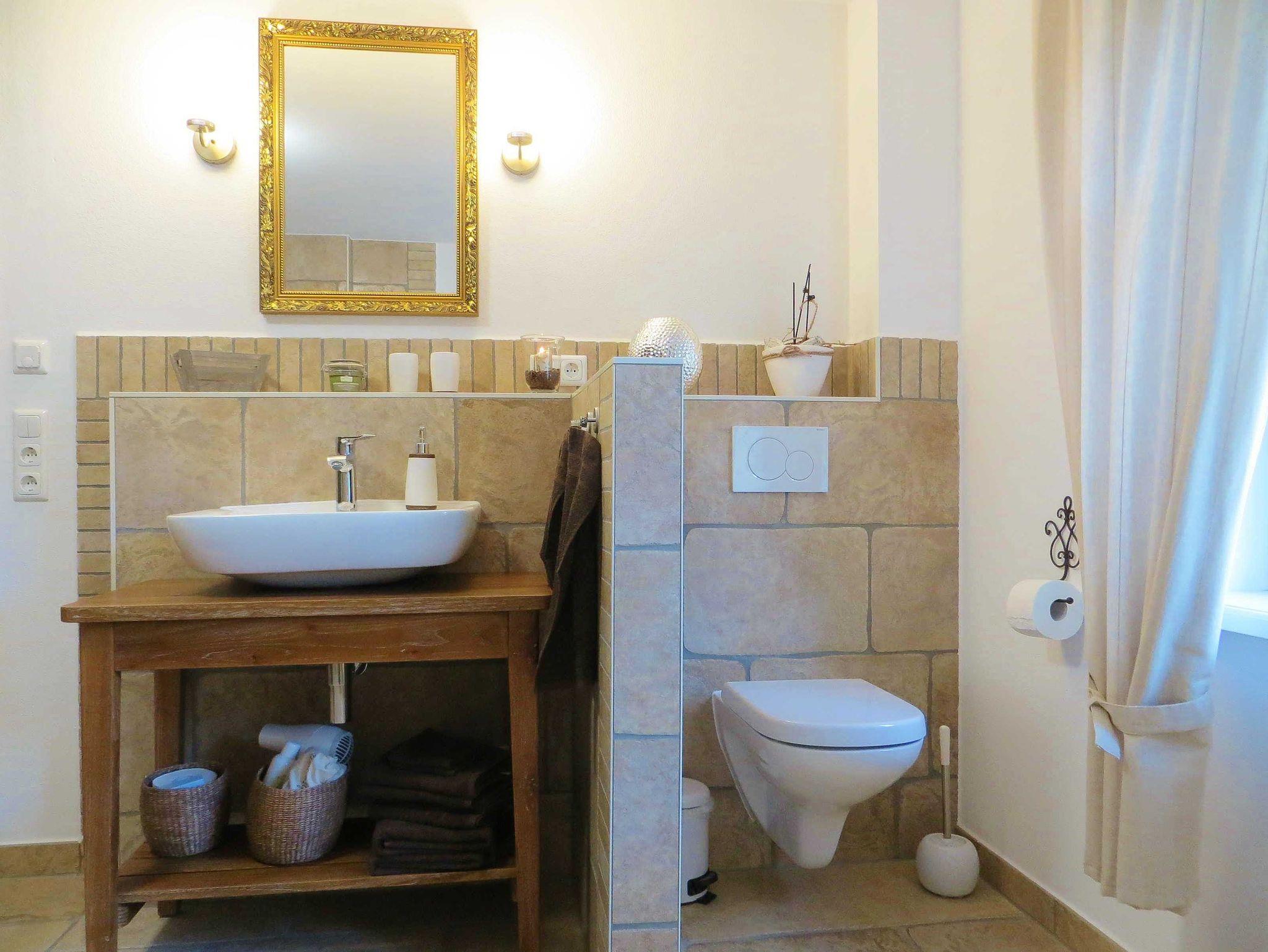 Das Erdgeschoss verfügt über zwei Bäder. Das kleinere Bad ist mit Dusche, Waschtisch und WC und das großzügige Bad mit einer offenen bodenebenen Dusche, Waschtisch, WC und Sauna im Landhausstil ausgestattet. Die Zimmer im Erdgeschoss haben teilweise Fußbodenheizung.