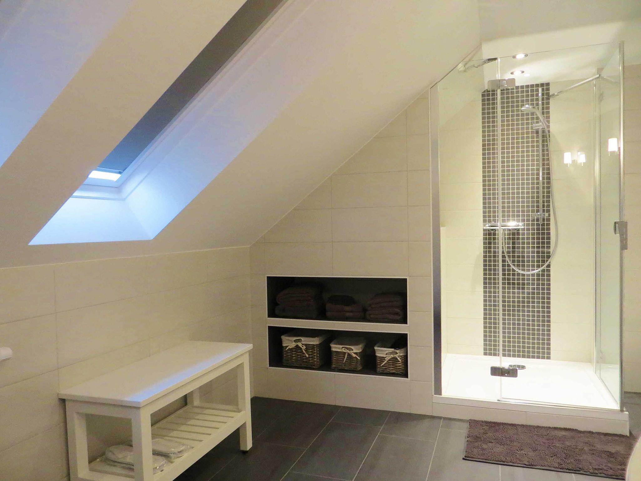 Ein Schlafzimmer im modernen Landhausstil mit Doppelbett (hochwertige Matratzen), sowie ein großzügiges Bad mit Dusche, Waschtisch und WC befinden sich im Dachgeschoss. Die Dachfenster haben Rollläden.
