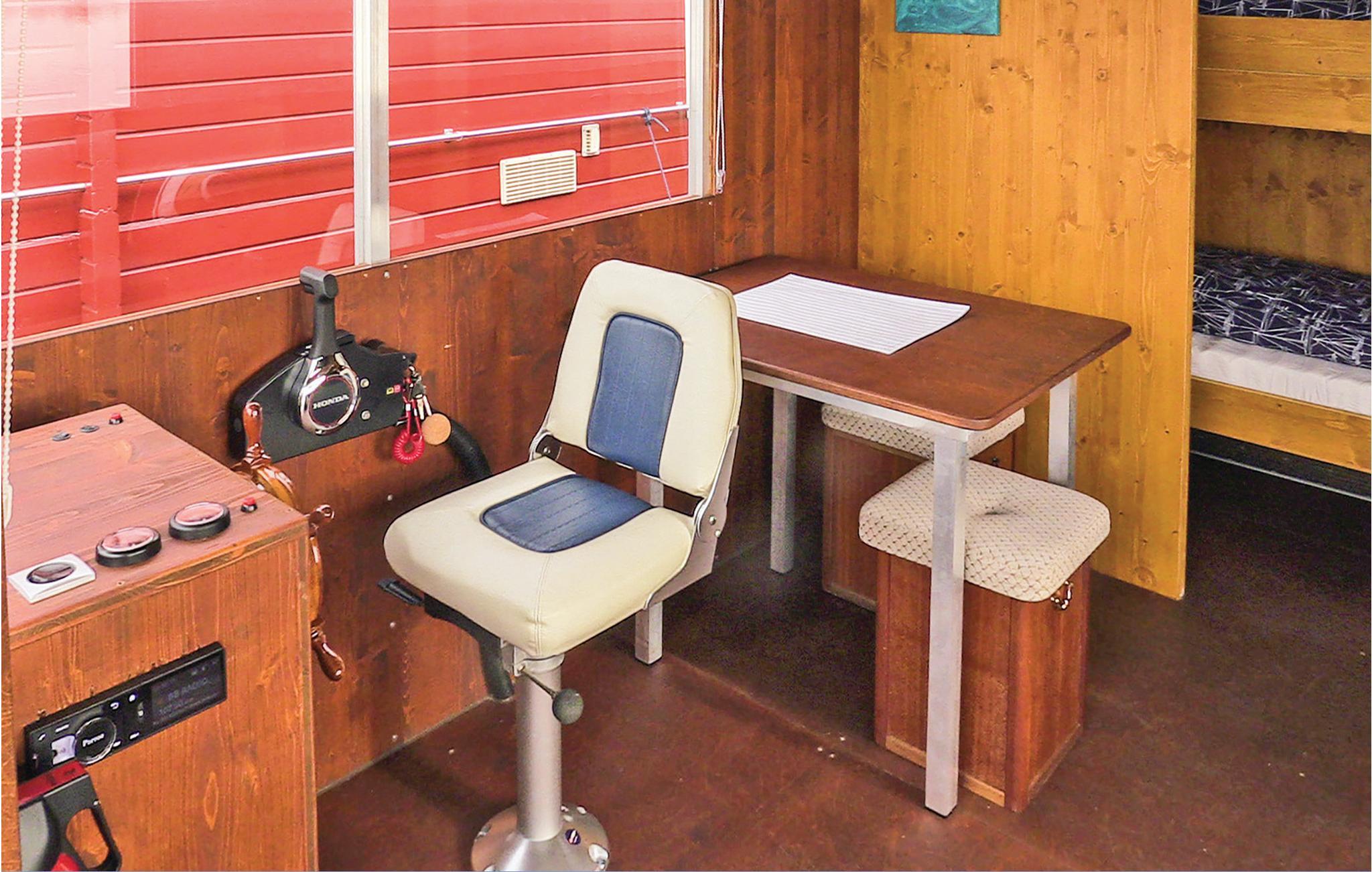 Der er adgang til båden fra den åbne terrasse langs boven ind i opholdsarealet med styreplads og åbent køkken. Her finder I den bekvemme sovesofa med fladskærm-tv og WLAN samt et soundsystem og spiseområdet. I det tilstødende soveområde er der en køjeseng. Separat ved siden af er der et soveværelse med dobbeltseng og havudsigt. Om bord er der et lille separat wc med håndvask. Et brusebad med varmt vand findes udendørs i bådens bagerste del (afvand kan afskaffes i havnen mod betaling). Der er tilstrækkelig mange redningsveste og fendere på husbåden.