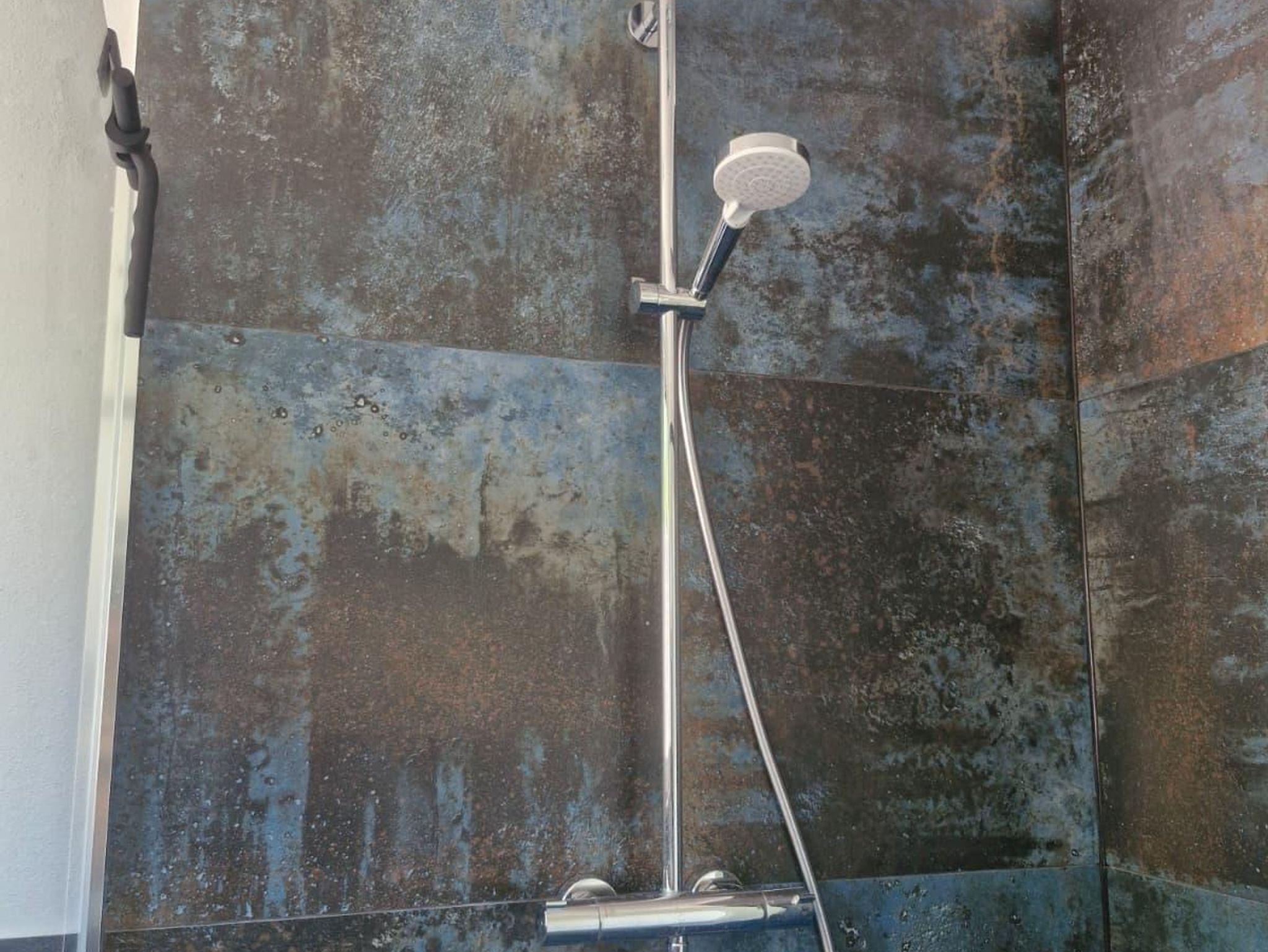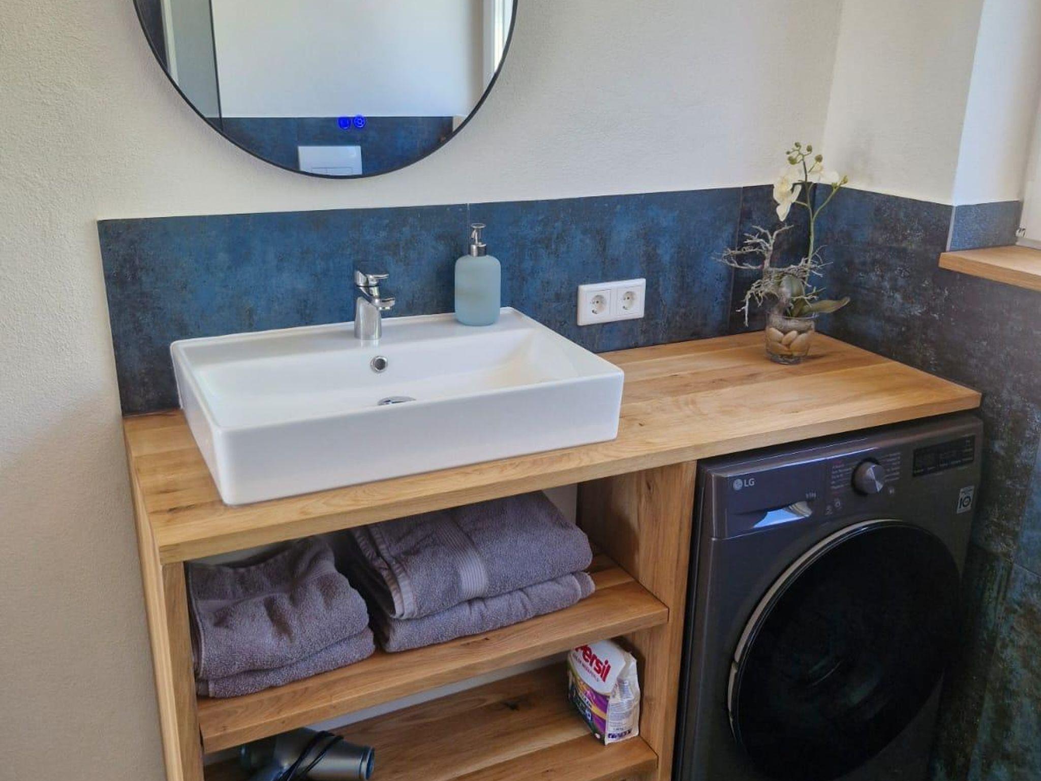 - Modernes Bad mit Regendusche und praktischer Waschmaschine mit Trockner