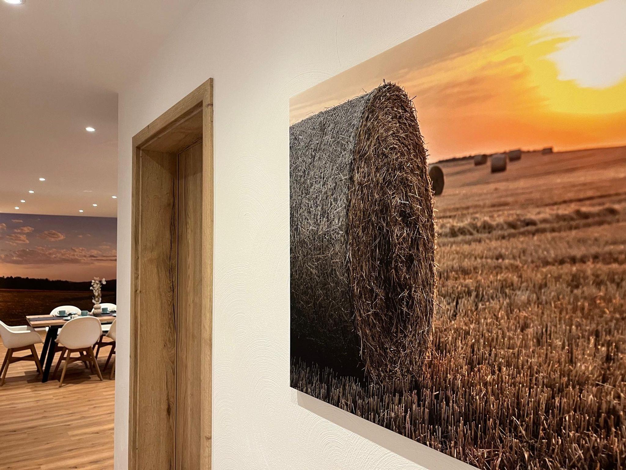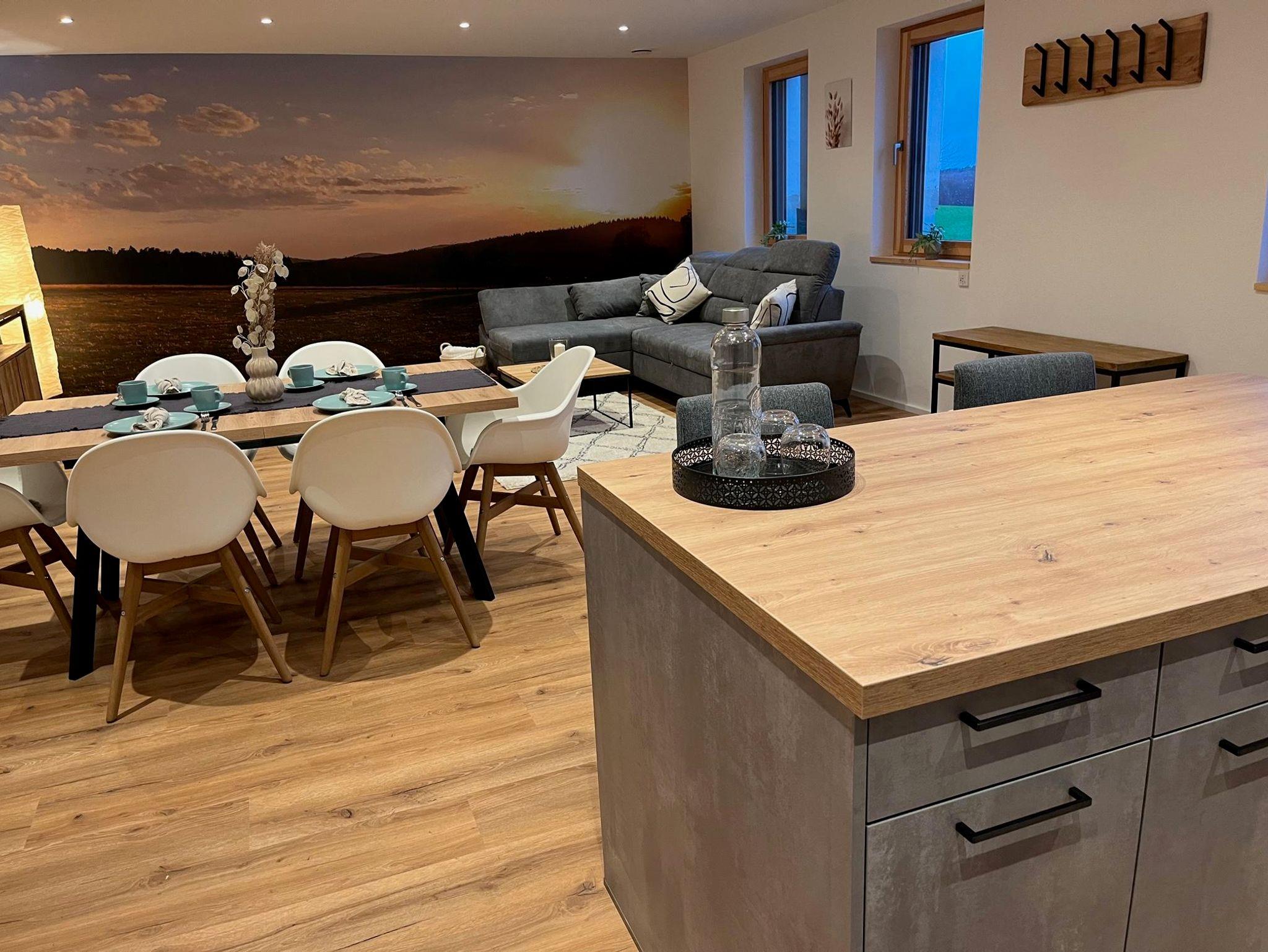 Herzlich willkommen in der wunderschönen Ferienwohnung Naturraum in Losheim am See. Die ca. 90qm große Ferienwohnung befinde sich in unserem Neubau und wurde im Jahr 2024 fertiggestellt. Über einen separaten Eingang seitlich am Haus ist die Wohnung zu erreichen. Sie ist komplett neu und hochwertig eingerichtet, die Gestaltung ist im gemütlichen Naturstiel gehalten. Durch die Eingangstür gelangt man direkt in den offenen und freundlichen Wohn/Essbereich. Hier befindet sich die Küche incl. Mittelblock und Sitzgelegenheit. Die Küche ist mit allem Zubehör wie Teller, Besteck, Pfannen, Töpfe und sonstige Kuchenutensilien ausgestattet. Ein Induktionskochfeld, Backofen, großer Kühlschrank mit Gefrierfach, Wasserkocher, Kaffeemaschine (Senseo) sind ebenfalls vorhanden. Mittig befindet sich ein Esstisch mit sechs Stühlen um allen Gästen genügend Platz zu bieten. Ebenso ist direkt der Wohnbereich mit Sofa und TV angeschlossen. Das Sofa kann als Schlafcouch umfunktioniert werden und bietet eine weiter Schlafmöglichkeit. Die komplette Rückwand im Wohnbereich ist mit einer Fototapete ausgestattet, welche den Ausblick hinter der Ferienwohnung zeigt. Eine Aussicht über Wiesen und Felder Richtung Wald. Des Weiteren verfügt die Wohnung über ein geräumiges Schlafzimmer mit Doppelbett (180x200m), Kleiderschrank und Kommode zum Verstauen von eigener Kleidung. Auch dieses Zimmer ist sehr liebevoll eingerichtet und man fühlt sich direkt wohl. Es besteht die Möglichkeit kostenlos ein Babybett im Schlafzimmer aufzustellen. Weitere Schlafmöglichkeiten können wir entweder über die ausziehbare Couch im Wohnzimmer oder über zwei Beistellbetten (190x80cm) bieten. Im Bad findet man eine ebenerdig begehbare große Regendusche incl separatem Duschkopf, WC und Waschtisch. Auch hier findet man durch die Verarbeitung der Kieselsteine die Naturoptik wieder. Handtücher, Fön, Kosmetikspiegel, Seife und Toilettenpapier ist vorhanden. Ein kleiner Abstellraum mit verschiedenen Putzutensilien, Staubsauger usw ist ebenfalls vorhanden. In allen Räumen ist Fußbodenheizung was eine gemütliche Wärme erzeugt. Diese sind über Schalter in jedem Raum zu regulieren. Elektrische Rollläden sind an allen Fenstern. Rauchmelder sind ebenfalls vorhanden. Draußen auf der Terrasse befindet sich in den Sommermonaten eine Sitzgelegenheit mit Tisch und sechs Stühlen und einem Gasgrill. Hier kann man den Tag gemütlich in der Abendsonne ausklingen lassen. Zwei Stellplätze sind direkt vor der Ferienwohnung kostenfrei verfügbar. Wlan und Kabel TV ist ebenso kostenfrei. Haustiere sind in der Wohnung nicht erlaubt. Das Rauchen in den Räumlichkeiten nicht erlaubt. Ebenso sind keine Partys und Junggesellenabschiede erlaubt.