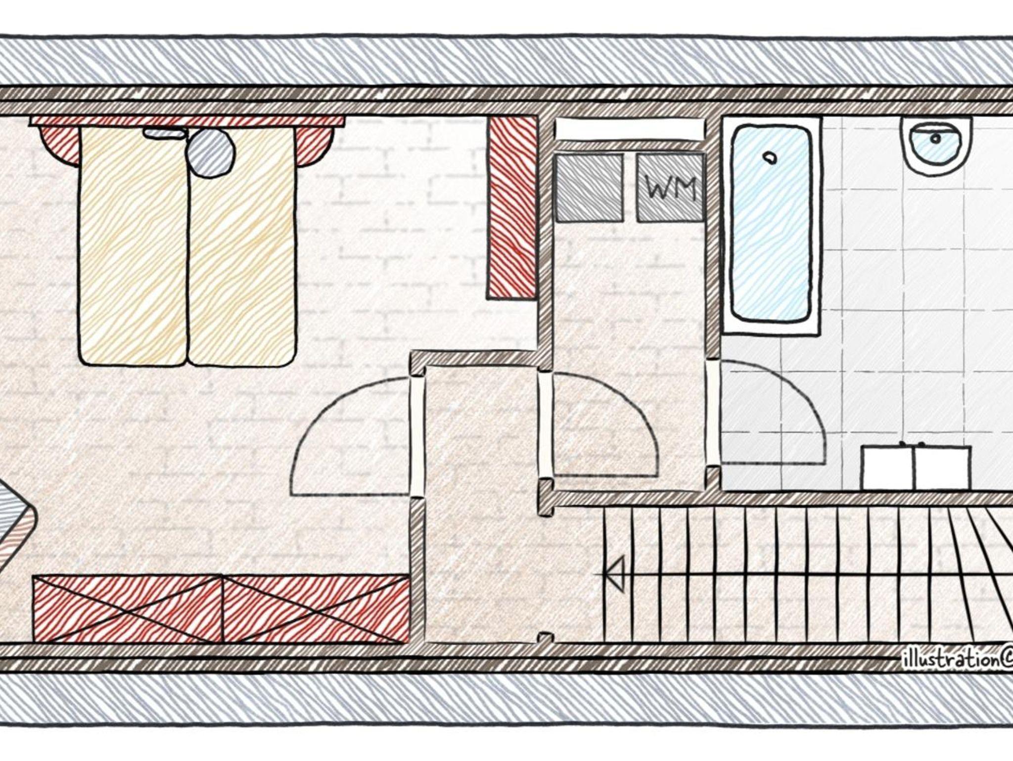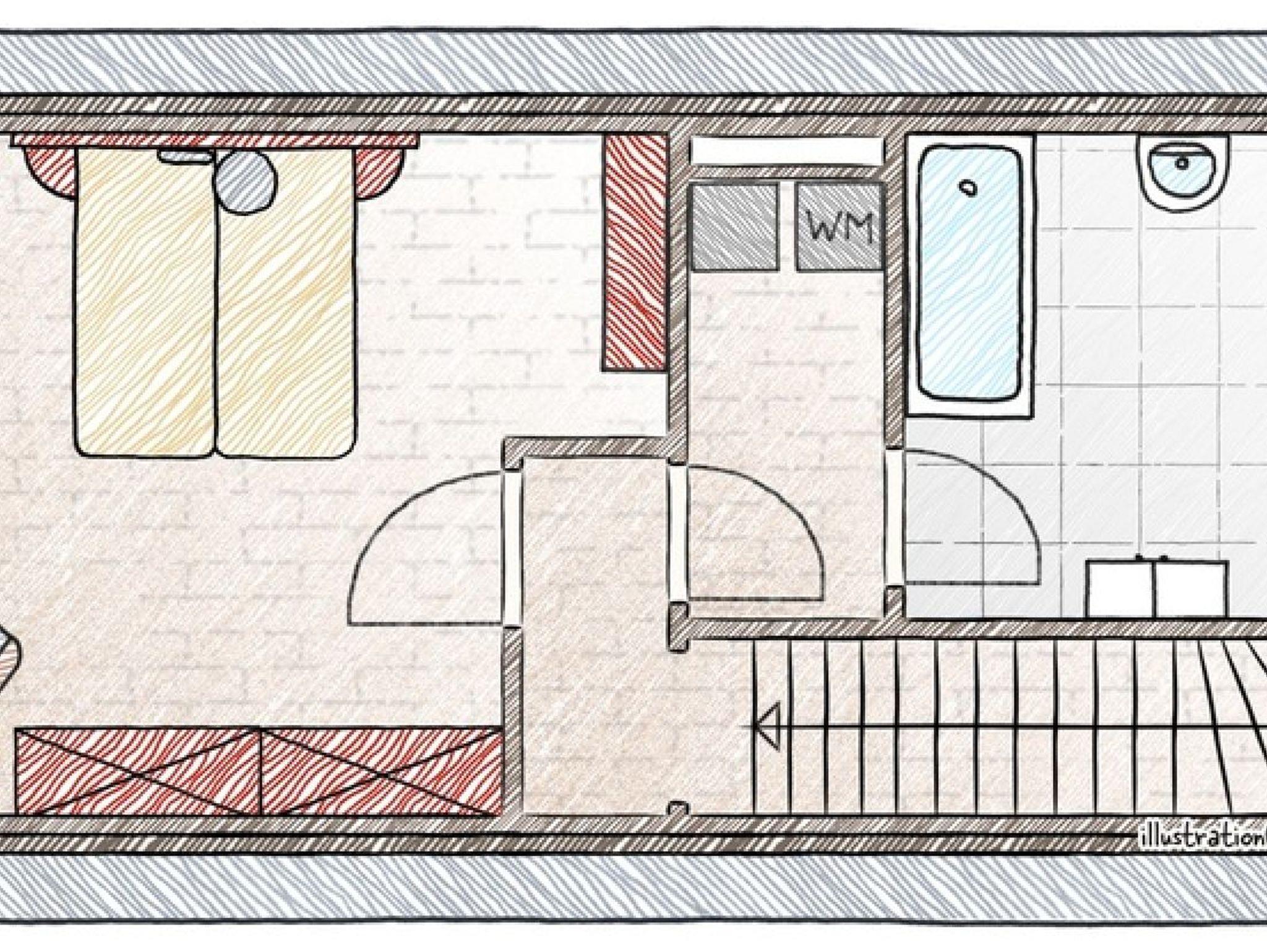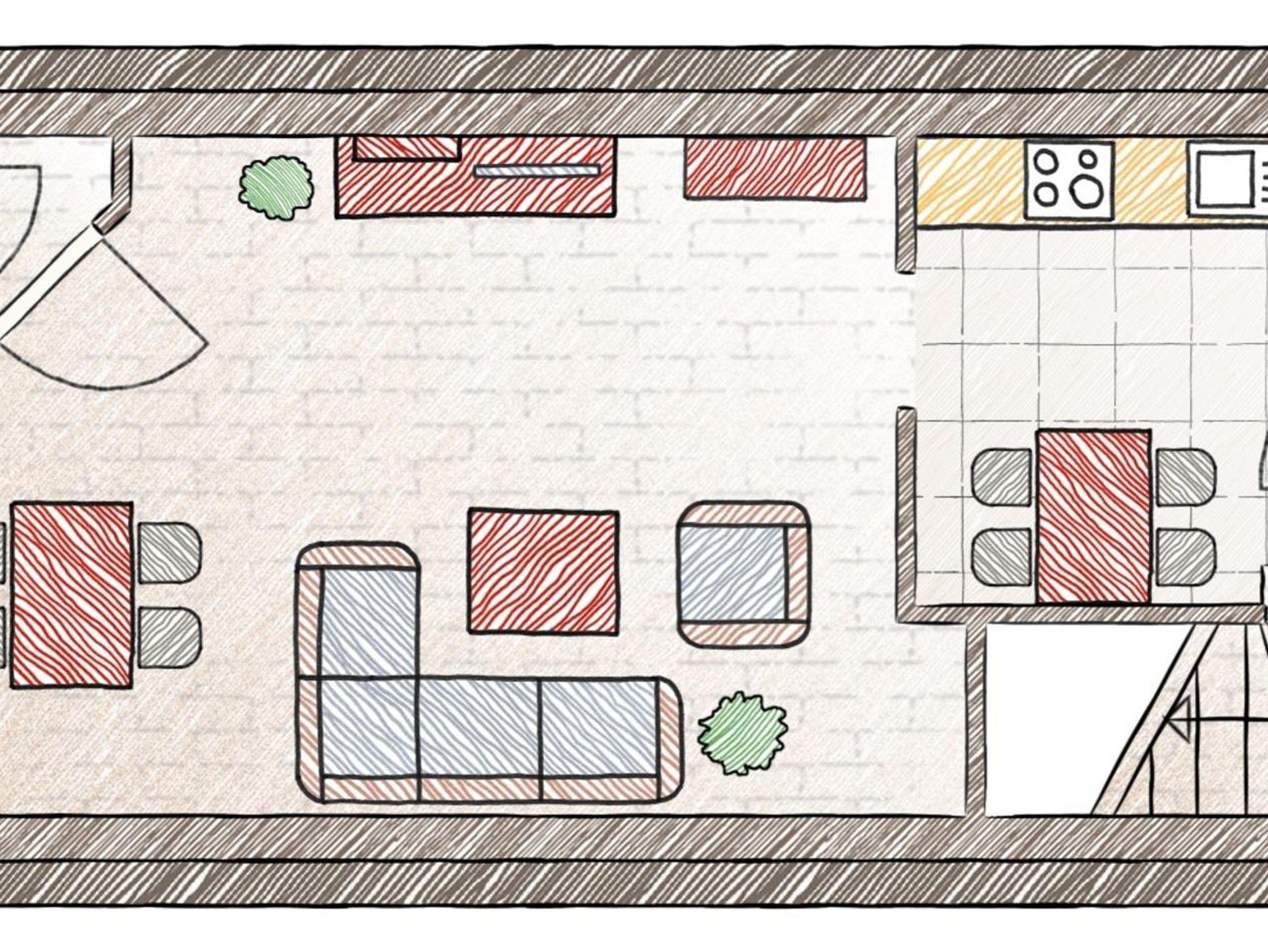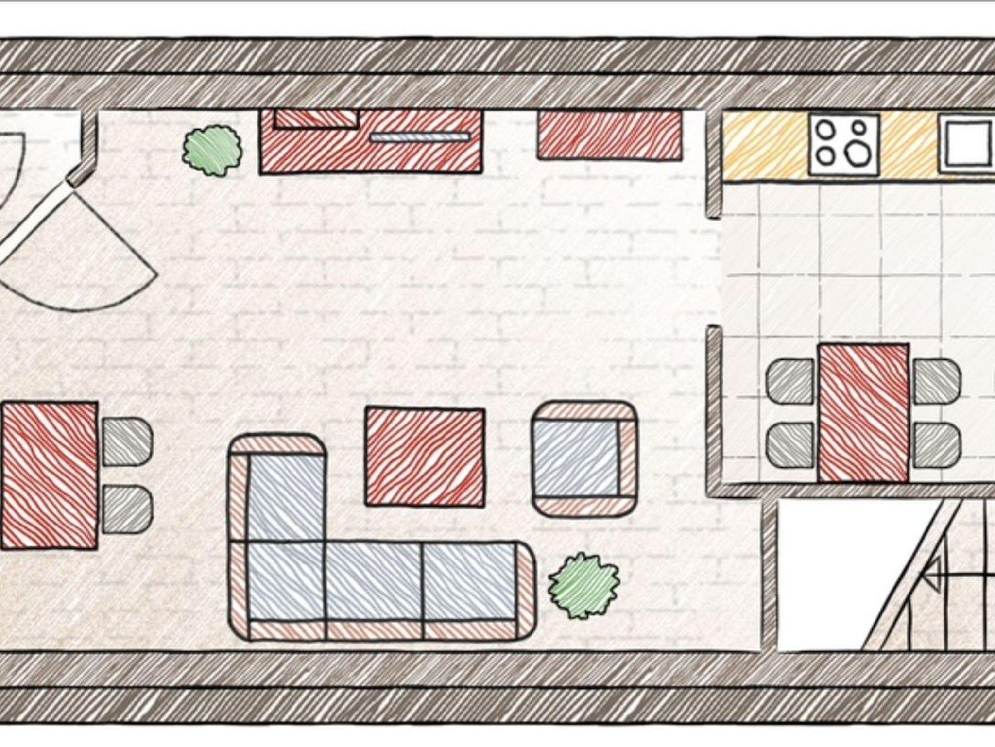 Erdgeschoss: ein Wohnzimmer mit einem Essbereich, Flachbild-Sat-TV; komplett eingerichtete Küche mit Spülmaschine; Balkon.Obergeschoss: geräumiges Doppelschlafzimmer mit bezogenen Betten; helles Tageslichtbad mit Wanne, Handtücher und Haartrockner; Zwischenraum / Abstellraum mit Waschmaschine und Trockner