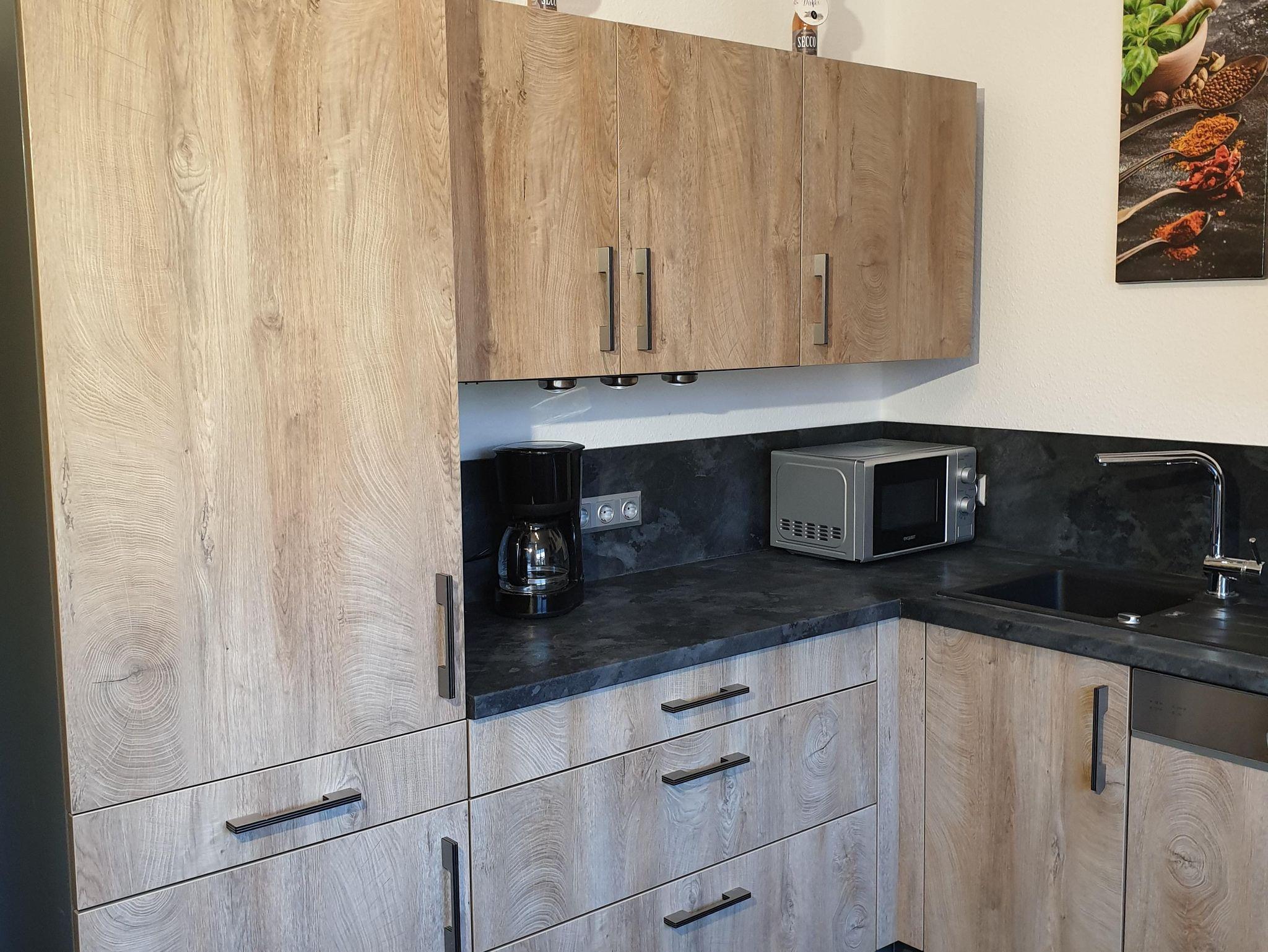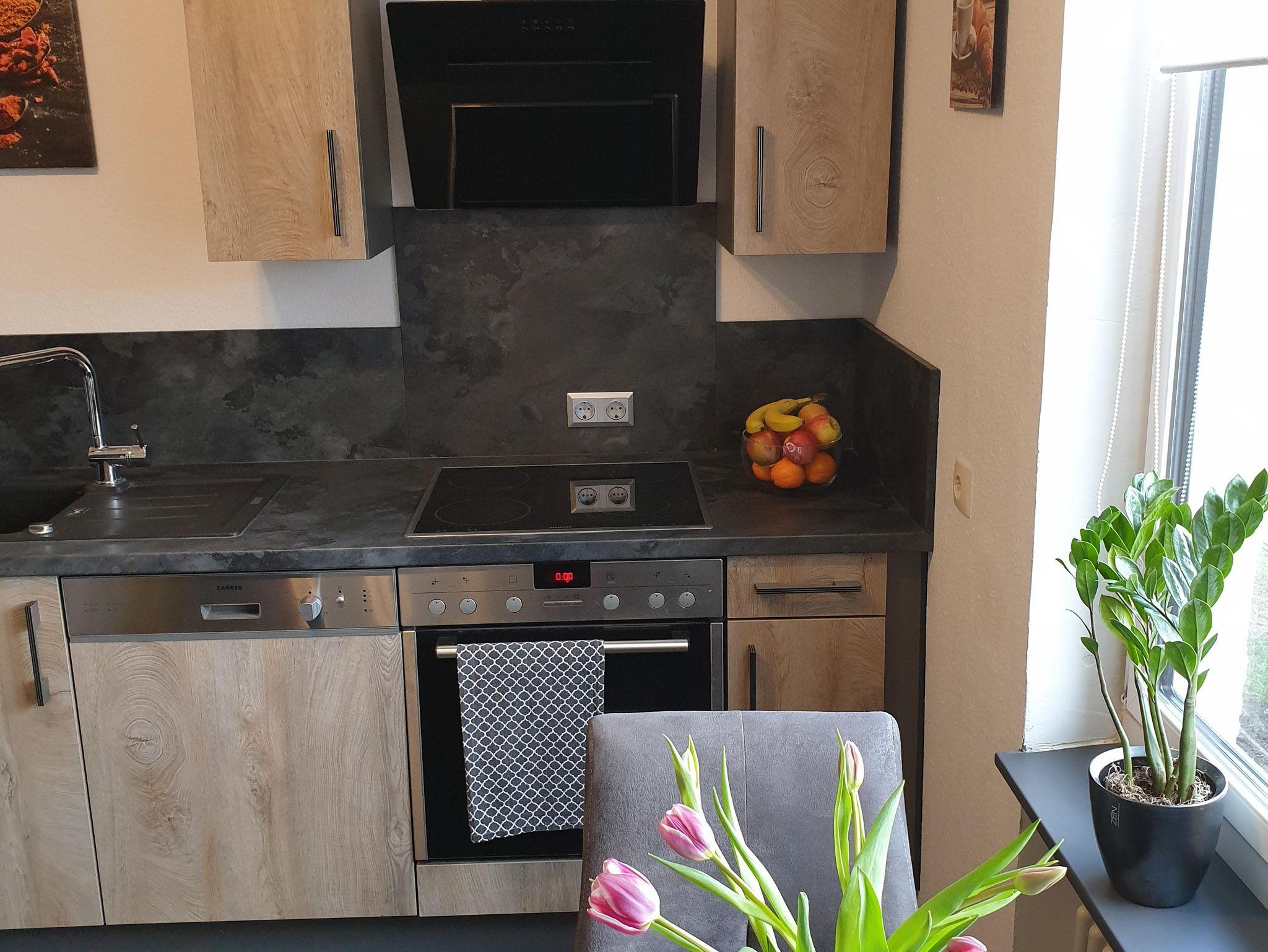 Eine voll eingerichtete Küche mit Spülmaschine ist vorhanden.